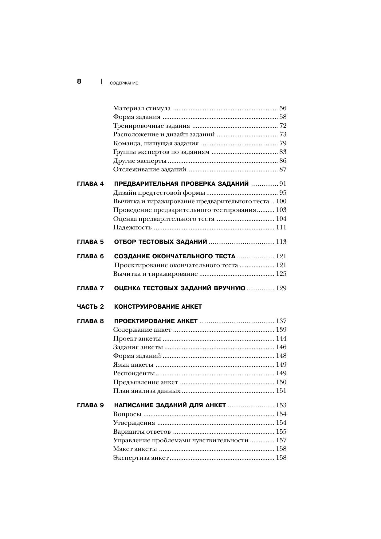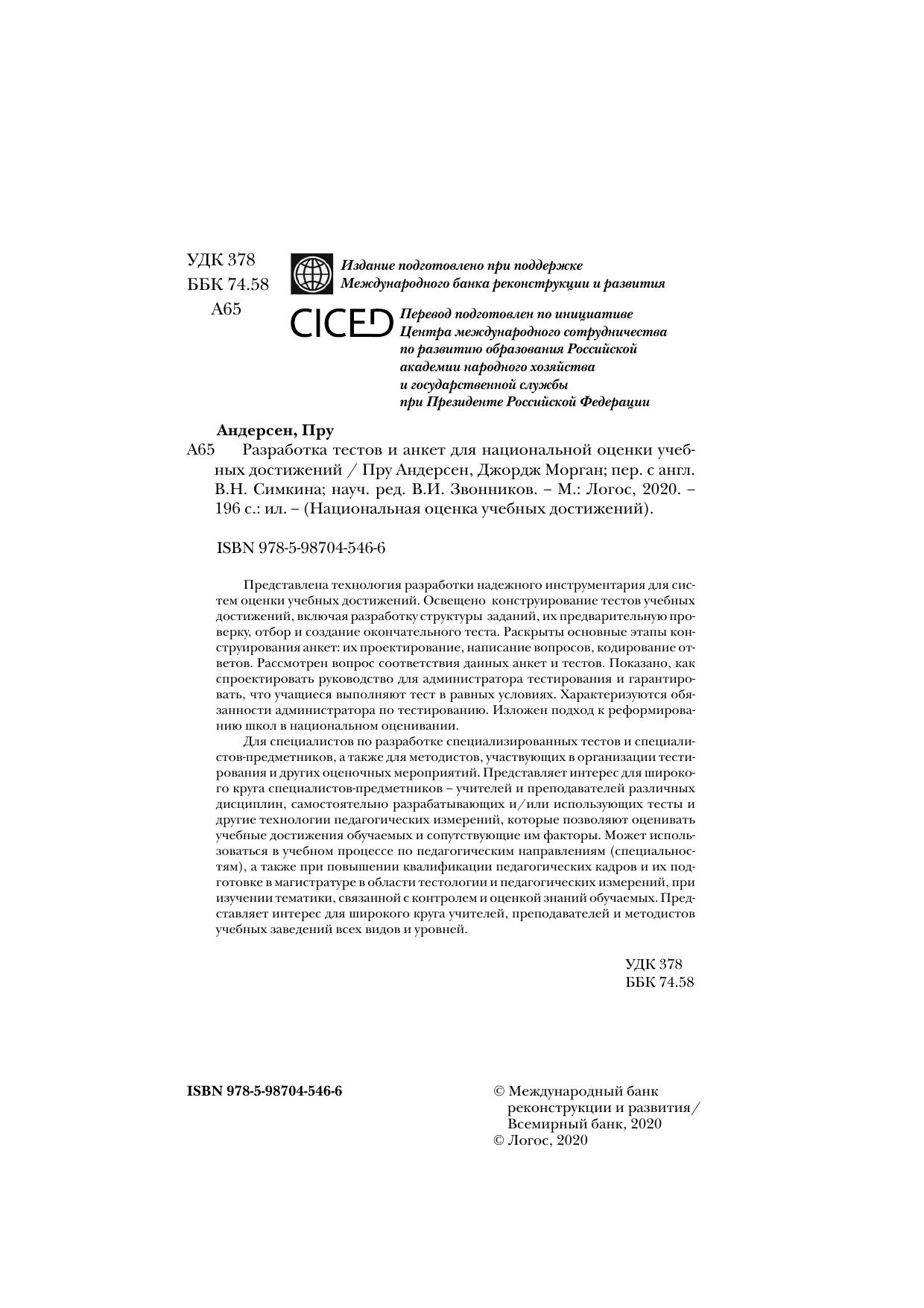 Представлена технология разработки надежного инструментария для систем оценки учебных достижений. Освещено конструирование тестов учебных достижений, включая разработку структуры заданий, их предварительную проверку, отбор и создание окончательного теста. Раскрыты основные этапы конструирования анкет: их проектирование, написание вопросов, кодирование ответов. Рассмотрен вопрос соответствия данных анкет и тестов. Показано, как спроектировать руководство для администратора тестирования и гарантировать, что учащиеся выполняют тест в равных условиях. Характеризуются обязанности администратора по тестированию. Изложен подход к реформированию школ в национальном оценивании. Для специалистов по разработке специализированных тестов и специалистовпредметников, а также для методистов, участвующих в организации тестирования и других оценочных мероприятий. Представляет интерес для широкого круга специалистов-предметников - учителей и преподавателей различных дисциплин, самостоятельно разрабатывающих и/или использующих тесты и другие технологии педагогических измерений, которые позволяют оценивать учебные достижения обучаемых и сопутствующие им факторы. Может использоваться в учебном процессе по педагогическим направлениям (специальностям), а также при повышении квалификации педагогических кадров и их подготовке в магистратуре в области тестологии и педагогических измерений, при изучении тематики, связанной с контролем и оценкой знаний обучаемых. Представляет интерес для широкого круга учителей, преподавателей и методистов учебных заведений всех видов и уровней.