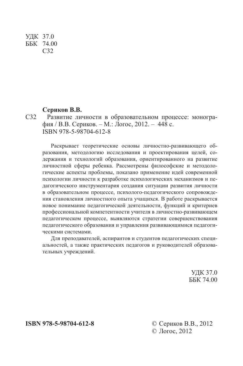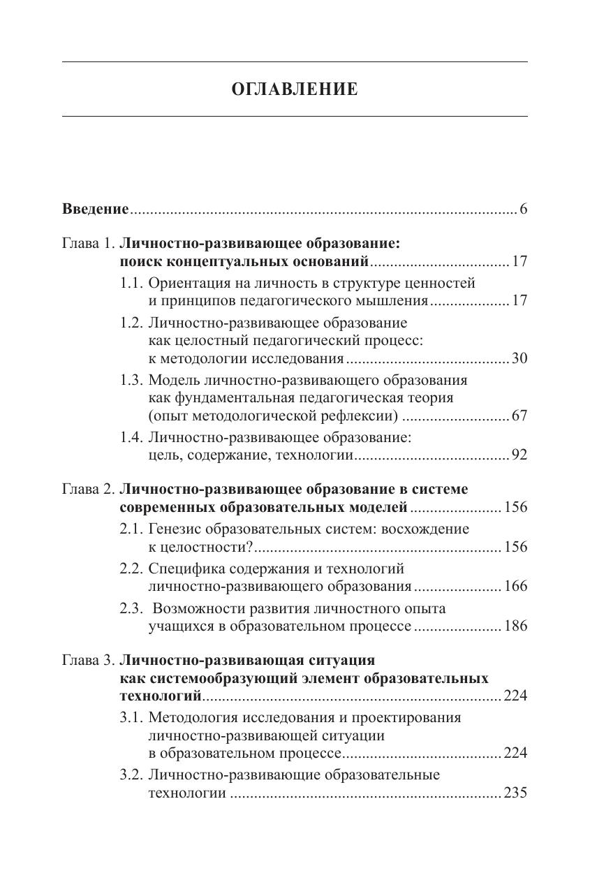 Раскрывает теоретические основы личностно-развивающего образования, методологию исследования и проектирования целей, содержания и технологий образования, ориентированного на развитие личностной сферы ребенка. Рассмотрены философские и методологические аспекты проблемы, показано применение идей современной психологии личности к разработке психологических механизмов и педагогического инструментария создания ситуации развития личности в образовательном процессе, психолого педагогического сопровождения становления личностного опыта учащихся. В работе раскрывается новое понимание педагогической деятельности, функций и критериев профессиональной компетентности учителя в личностно-развивающем педагогическом процессе, выявляются стратегии совершенствования педагогического образования и управления развивающимися педагогическими системами. Для преподавателей, аспирантов и студентов педагогических специальностей, а также практических педагогов и руководителей образовательных учреждений.