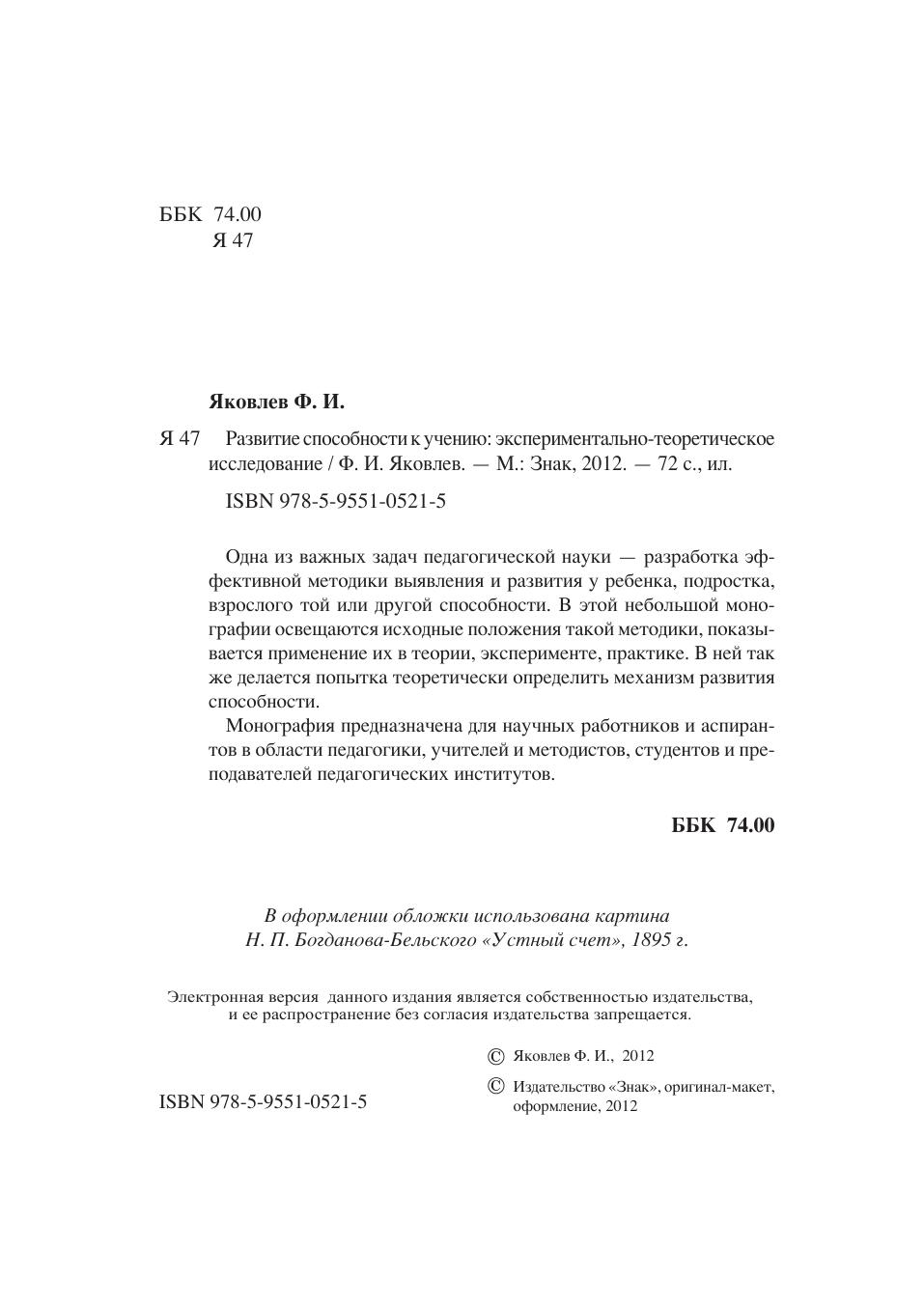 Одна из важных задач педагогической науки - разработка эффективной методики выявления и развития у ребенка, подростка, взрослого той или другой способности. В этой небольшой монографии освещаются исходные положения такой методики, показывается применение их в теории, эксперименте, практике. В ней так же делается попытка теоретически определить механизм развития способности. Монография предназначена для научных работников и аспирантов в области педагогики, учителей и методистов, студентов и преподавателей педагогических институтов.
