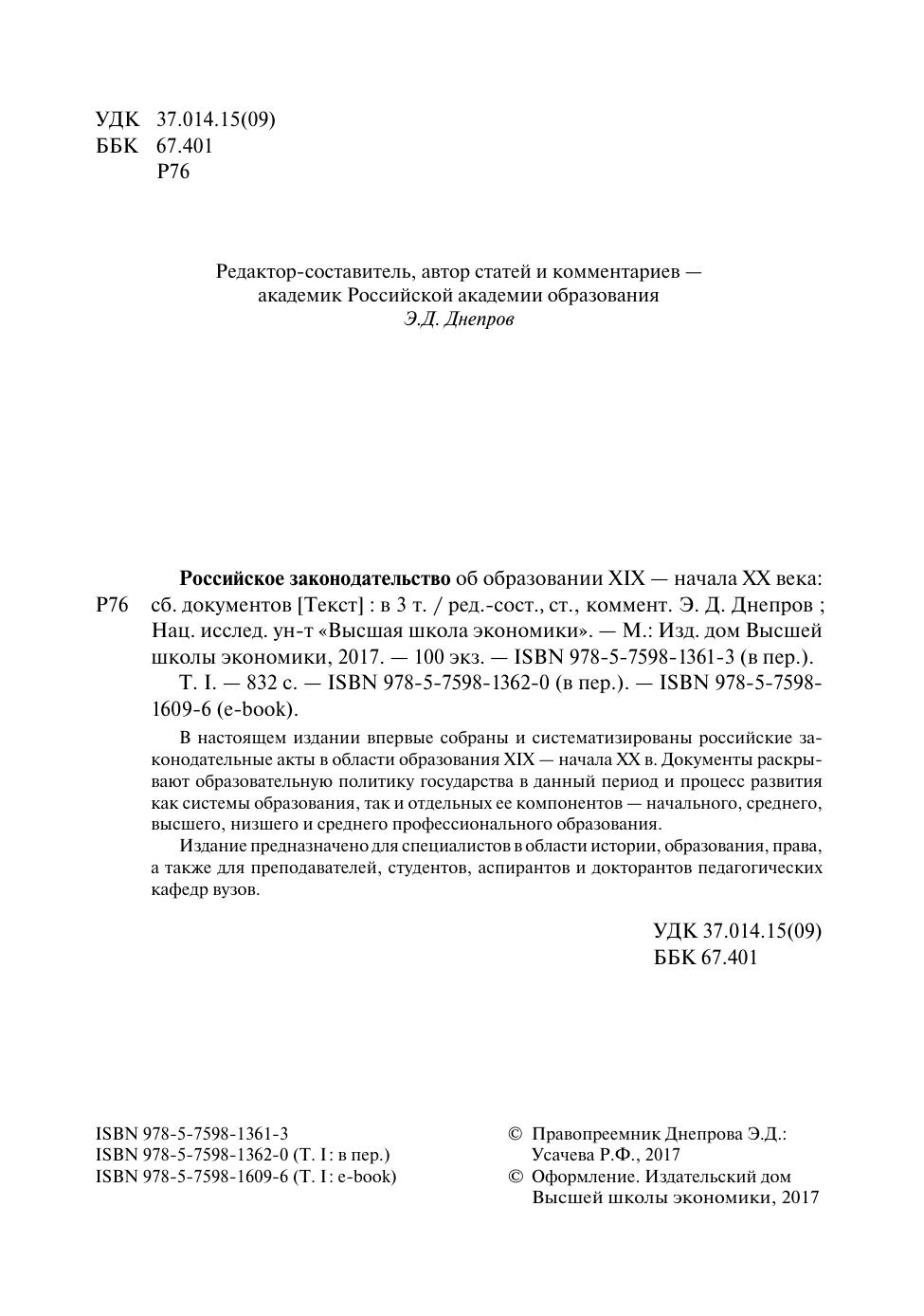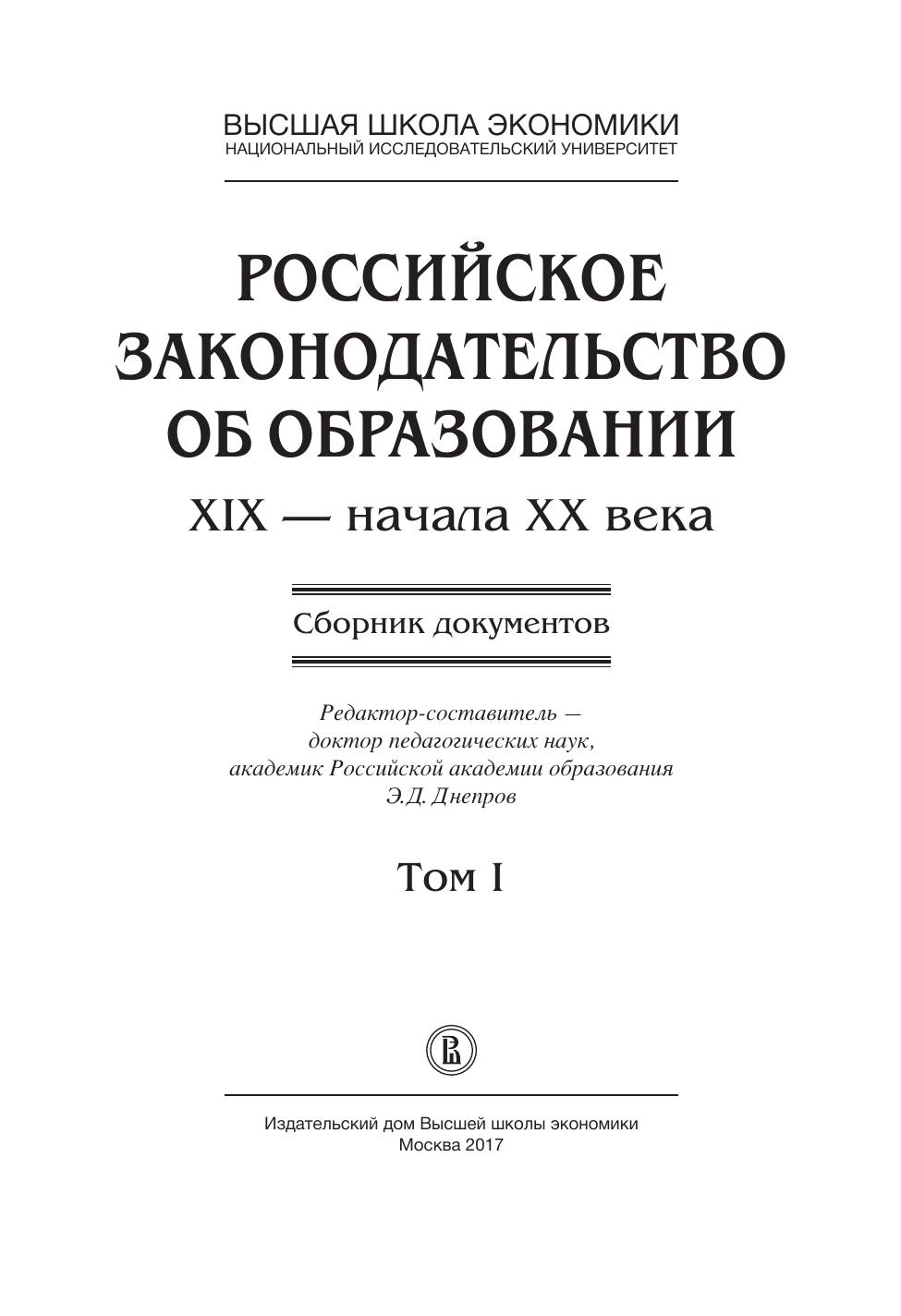 Российское законодательство об образовании XIX — начала XX века: сб. документов: в 3 т. Т. I