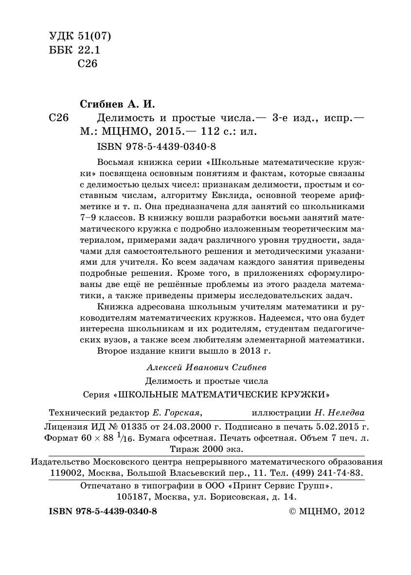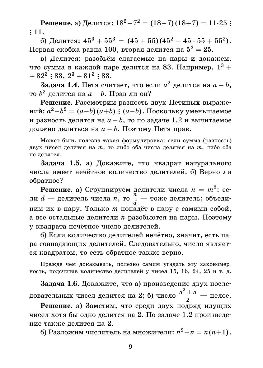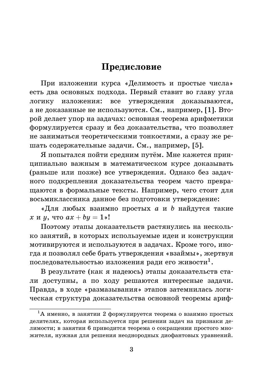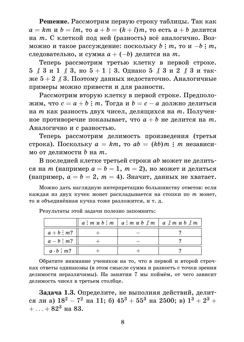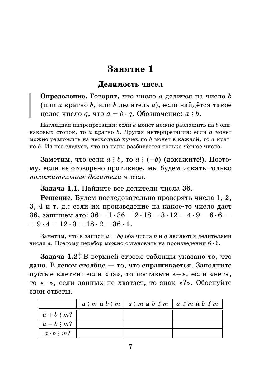 Восьмая книжка серии «Школьные математические кружки» посвящена основным понятиям и фактам, которые связаны с делимостью целых чисел: признакам делимости, простым и составным числам, алгоритму Евклида, основной теореме арифметике и т. п. Она предназначена для занятий со школьниками 7–9 классов. В книжку вошли разработки восьми занятий математического кружка с подробно изложенным теоретическим материалом, примерами задач различного уровня трудности, задачами для самостоятельного решения и методическими указаниями для учителя. Ко всем задачам каждого занятия приведены подробные решения. Кроме того, в приложениях сформулированы две ещё не решённые проблемы из этого раздела математики, а также приведены примеры исследовательских задач. Книжка адресована школьным учителям математики и руководителям математических кружков. Надеемся, что она будет интересна школьникам и их родителям, студентам педагогических вузов, а также всем любителям элементарной математики. Второе издание книги вышло в 2013 г.