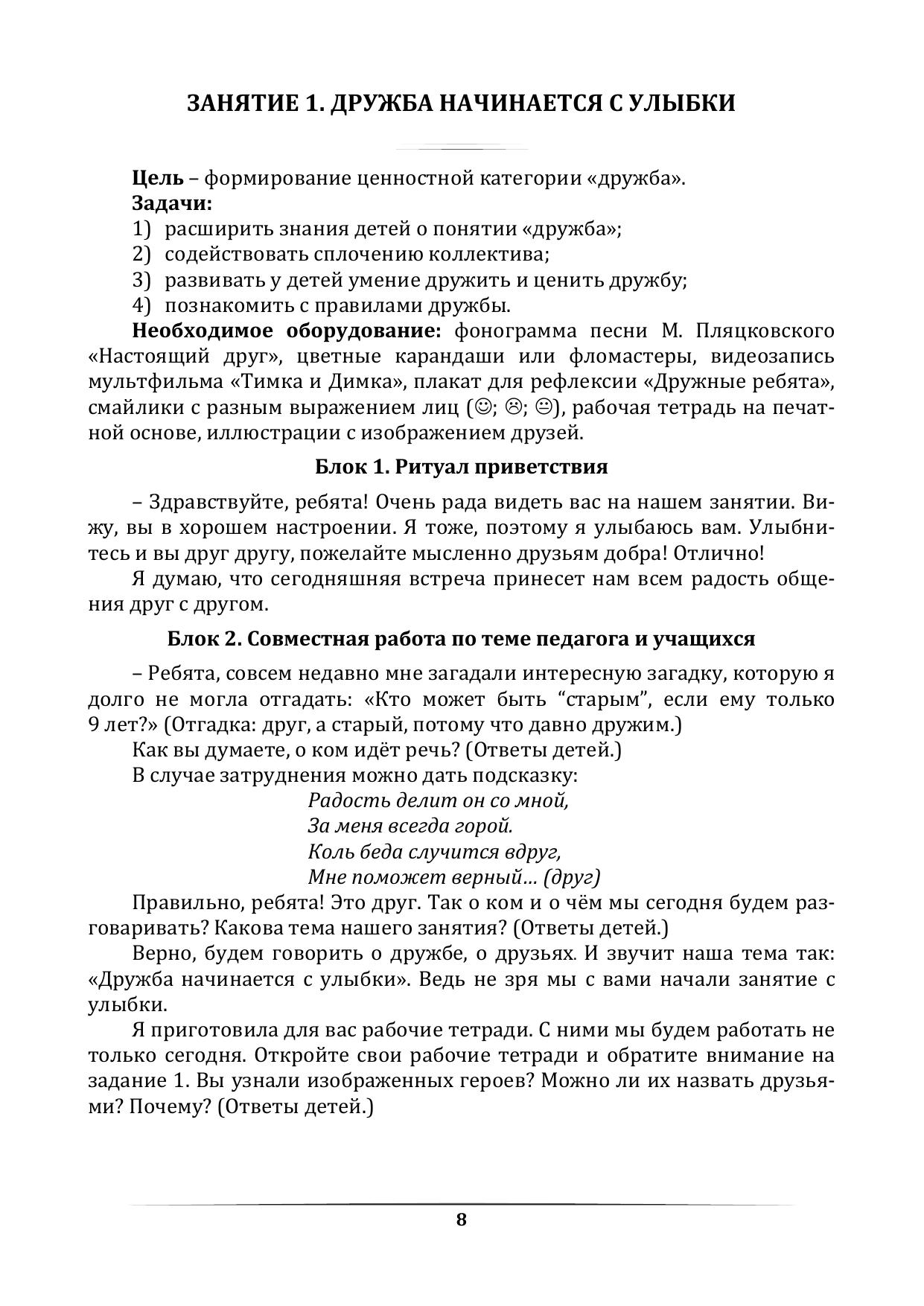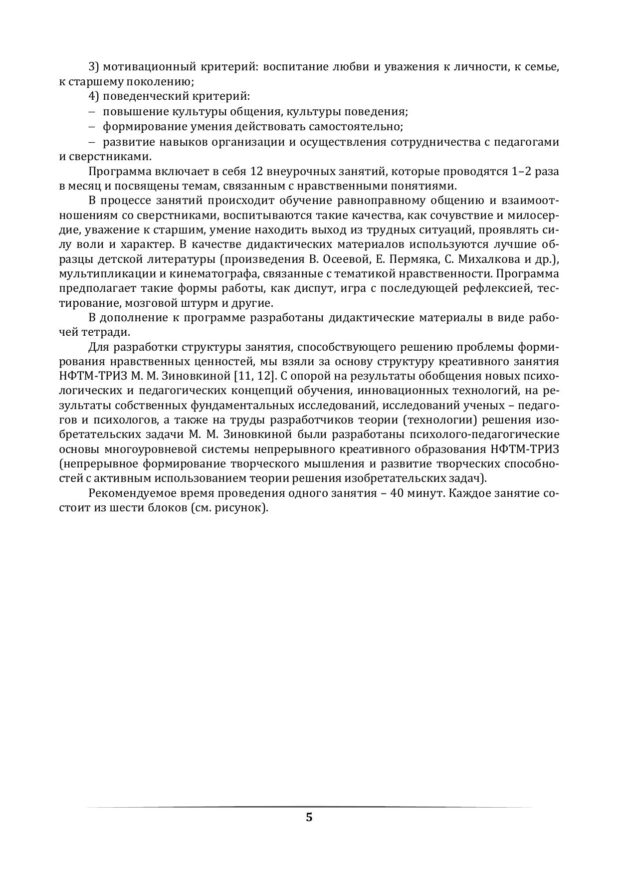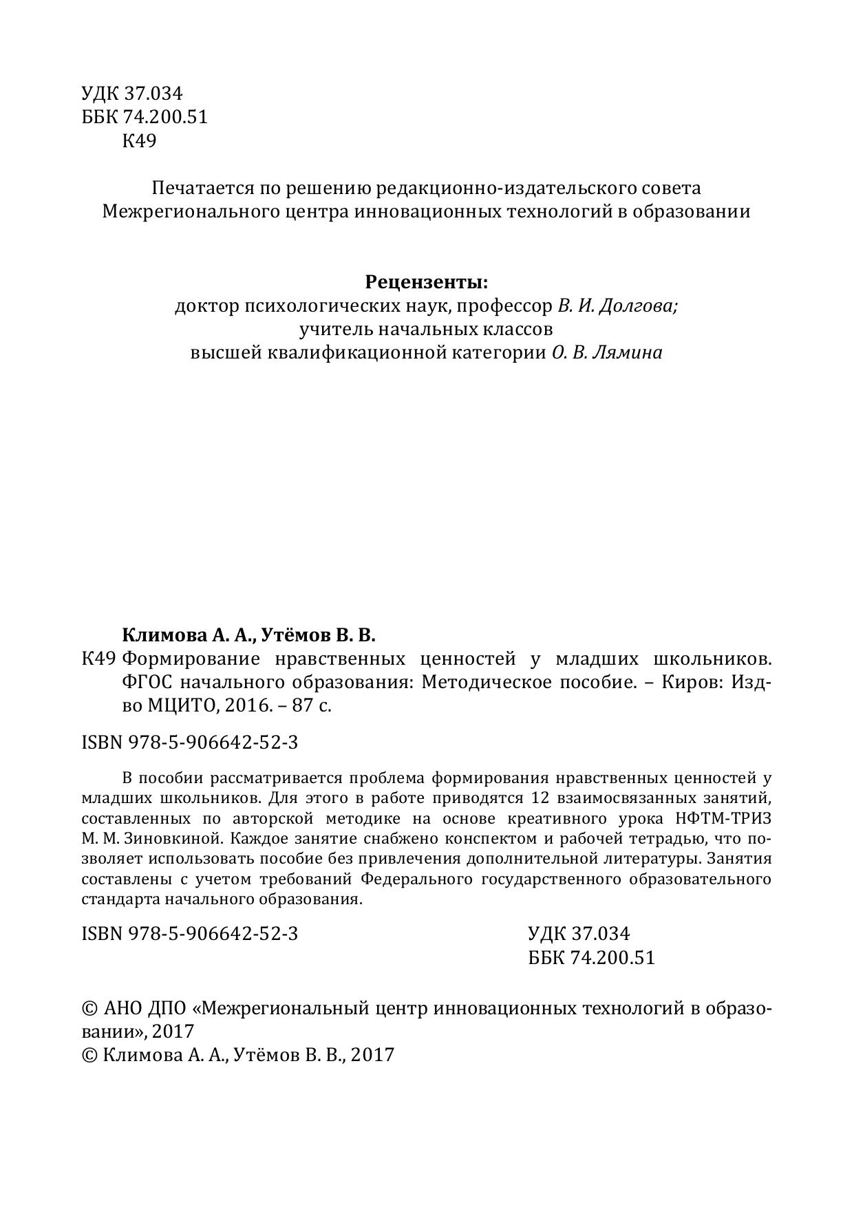 В пособии рассматривается проблема формирования нравственных ценностей у младших школьников. Для этого в работе приводятся 12 взаимосвязанных занятий, составленных по авторской методике на основе креативного урока НФТМ-ТРИЗ М. М. Зиновкиной. Каждое занятие снабжено конспектом и рабочей тетрадью, что позволяет использовать пособие без привлечения дополнительной литературы. Занятия составлены с учетом требований Федерального государственного образовательного стандарта начального образования