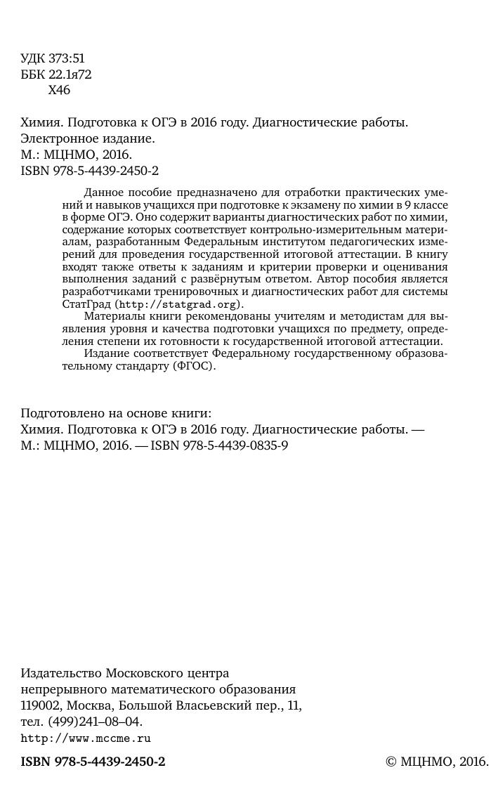 Данное пособие предназначено для отработки практических умений и навыков учащихся при подготовке к экзамену по химии в 9 классе в форме ОГЭ. Оно содержит варианты диагностических работ по химии, содержание которых соответствует контрольно-измерительным материалам, разработанным Федеральным институтом педагогических измерений для проведения государственной итоговой аттестации. В книгу входят также ответы к заданиям и критерии проверки и оценивания выполнения заданий с развёрнутым ответом. Автор пособия является разработчиками тренировочных и диагностических работ для системы СтатГрад (http://statgrad.org). Материалы книги рекомендованы учителям и методистам для выявления уровня и качества подготовки учащихся по предмету, определения степени их готовности к государственной итоговой аттестации. Издание соответствует Федеральному государственному образовательному стандарту (ФГОС).