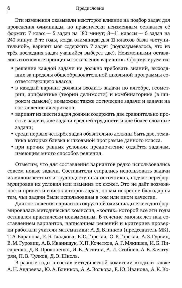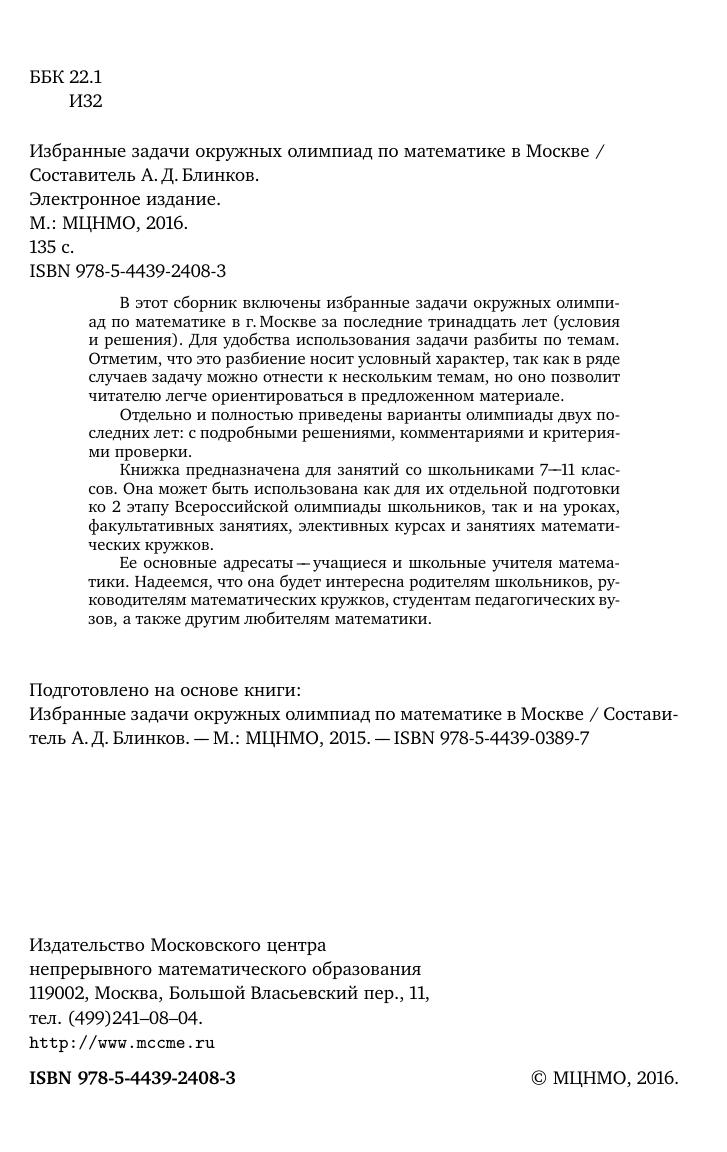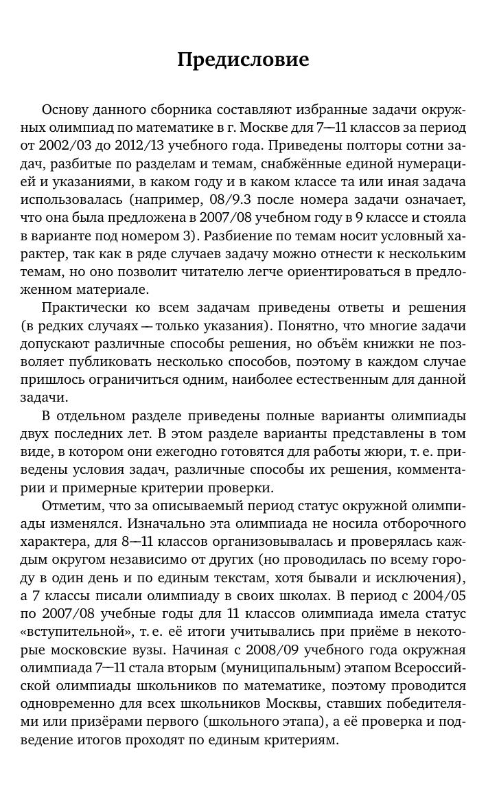 В этот сборник включены избранные задачи окружных олимпиад по математике в г. Москве за последние тринадцать лет (условия и решения). Для удобства использования задачи разбиты по темам. Отметим, что это разбиение носит условный характер, так как в ряде случаев задачу можно отнести к нескольким темам, но оно позволит читателю легче ориентироваться в предложенном материале. Отдельно и полностью приведены варианты олимпиады двух последних лет: с подробными решениями, комментариями и критериями проверки. Книжка предназначена для занятий со школьниками 7––11 классов. Она может быть использована как для их отдельной подготовки ко 2 этапу Всероссийской олимпиады школьников, так и на уроках, факультативных занятиях, элективных курсах и занятиях математических кружков. Ее основные адресаты –– учащиеся и школьные учителя математики. Надеемся, что она будет интересна родителям школьников, руководителям математических кружков, студентам педагогических вузов, а также другим любителям математики.