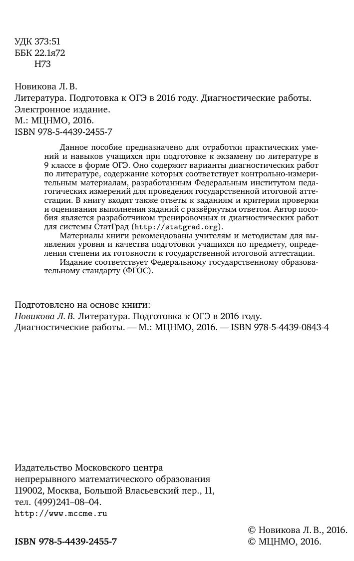 Данное пособие предназначено для отработки практических умений и навыков учащихся при подготовке к экзамену по литературе в 9 классе в форме ОГЭ. Оно содержит варианты диагностических работ по литературе, содержание которых соответствует контрольно-измерительным материалам, разработанным Федеральным институтом педагогических измерений для проведения государственной итоговой аттестации. В книгу входят также ответы к заданиям и критерии проверки и оценивания выполнения заданий с развёрнутым ответом. Автор пособия является разработчиком тренировочных и диагностических работ для системы СтатГрад (http://statgrad.org). Материалы книги рекомендованы учителям и методистам для выявления уровня и качества подготовки учащихся по предмету, определения степени их готовности к государственной итоговой аттестации. Издание соответствует Федеральному государственному образовательному стандарту (ФГОС).
