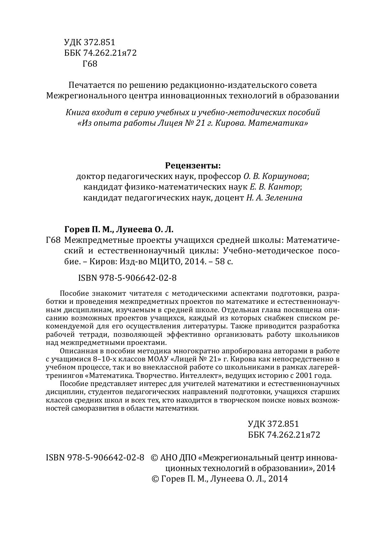 Пособие знакомит читателя с методическими аспектами подготовки, разработки и проведения межпредметных проектов по математике и естественнонаучным дисциплинам, изучаемым в средней школе. Отдельная глава посвящена описанию возможных проектов учащихся, каждый из которых снабжен списком рекомендуемой для его осуществления литературы. Также приводится разработка рабочей тетради, позволяющей эффективно организовать работу школьников над межпредметными проектами. Описанная в пособии методика многократно апробирована авторами в работе с учащимися 8-10-х классов МОАУ «Лицей № 21» г. Кирова как непосредственно в учебном процессе, так и во внеклассной работе со школьниками в рамках лагерей-тренингов «Математика. Творчество. Интеллект», ведущих историю с 2001 года. Пособие представляет интерес для учителей математики и естественнонаучных дисциплин, студентов педагогических направлений подготовки, учащихся старших классов средних школ и всех тех, кто находится в творческом поиске новых возможностей саморазвития в области математики