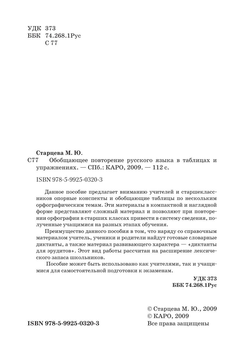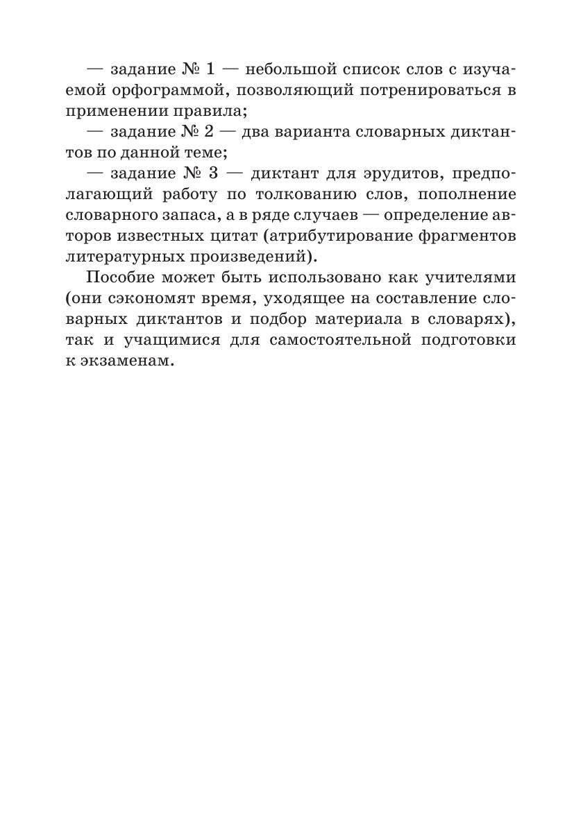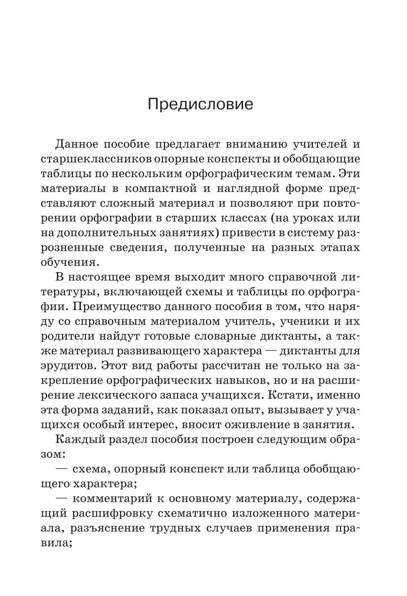 Данное пособие предлагает вниманию учителей и старшеклассников опорные конспекты и обобщающие таблицы по нескольким орфографическим темам. Эти материалы в компактной и наглядной форме представляют сложный материал и позволяют при повторении орфографии в старших классах привести в систему сведения, полученные учащимися на разных этапах обучения. Преимущество данного пособия в том, что наряду со справочным материалом учитель, ученики и родители найдут готовые словарные диктанты, а также материал развивающего характера — «диктанты для эрудитов». Этот вид работы рассчитан на расширение лексического запаса школьников. Пособие может быть использовано как учителями, так и учащимися для самостоятельной подготовки к экзаменам.