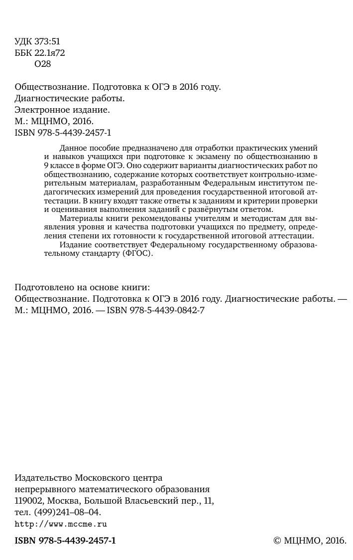 Данное пособие предназначено для отработки практических умений и навыков учащихся при подготовке к экзамену по обществознанию в 9 классе в форме ОГЭ. Оно содержит варианты диагностических работ по обществознанию, содержание которых соответствует контрольно-измерительным материалам, разработанным Федеральным институтом педагогических измерений для проведения государственной итоговой аттестации. В книгу входят также ответы к заданиям и критерии проверки и оценивания выполнения заданий с развёрнутым ответом. Материалы книги рекомендованы учителям и методистам для выявления уровня и качества подготовки учащихся по предмету, определения степени их готовности к государственной итоговой аттестации. Издание соответствует Федеральному государственному образовательному стандарту (ФГОС).