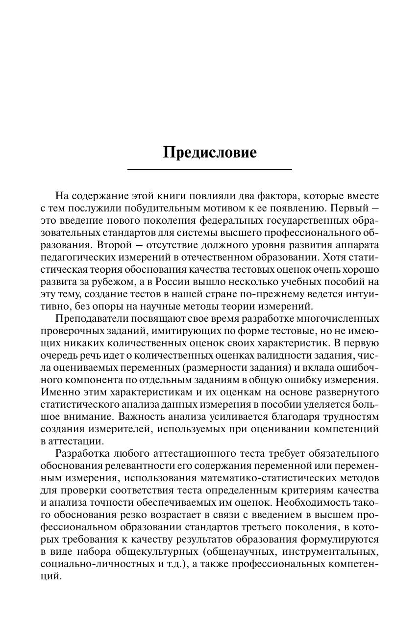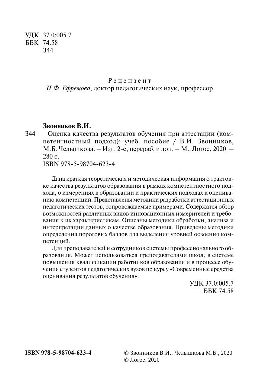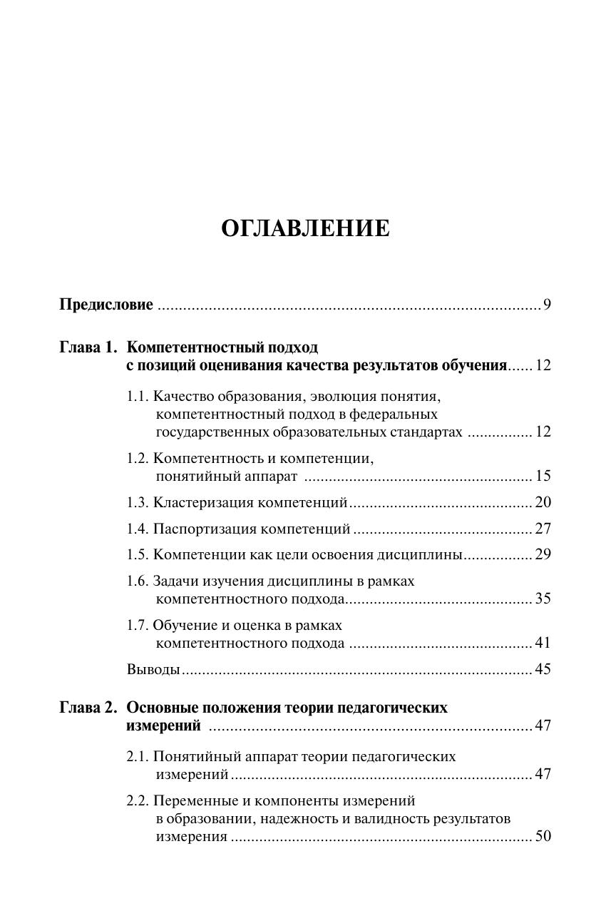 Дана краткая теоретическая и методическая информация о трактовке качества результатов образования в рамках компетентностного подхода, о измерениях в образовании и практических подходах к оцениванию компетенций. Представлены методики разработки аттестационных педагогических тестов, сопровождаемые примерами. Содержатся обзор возможностей различных видов инновационных измерителей и требования к их характеристикам. Описаны методики обработки, анализа и интерпретации данных о качестве образования. Приведены методики определения пороговых баллов для выделения уровней освоения компетенций. Для преподавателей и сотрудников системы профессионального образования. Может использоваться преподавателями школ, в системе повышения квалификации работников образования и в процессе обучения студентов педагогических вузов по курсу «Современные средства оценивания результатов обучения».