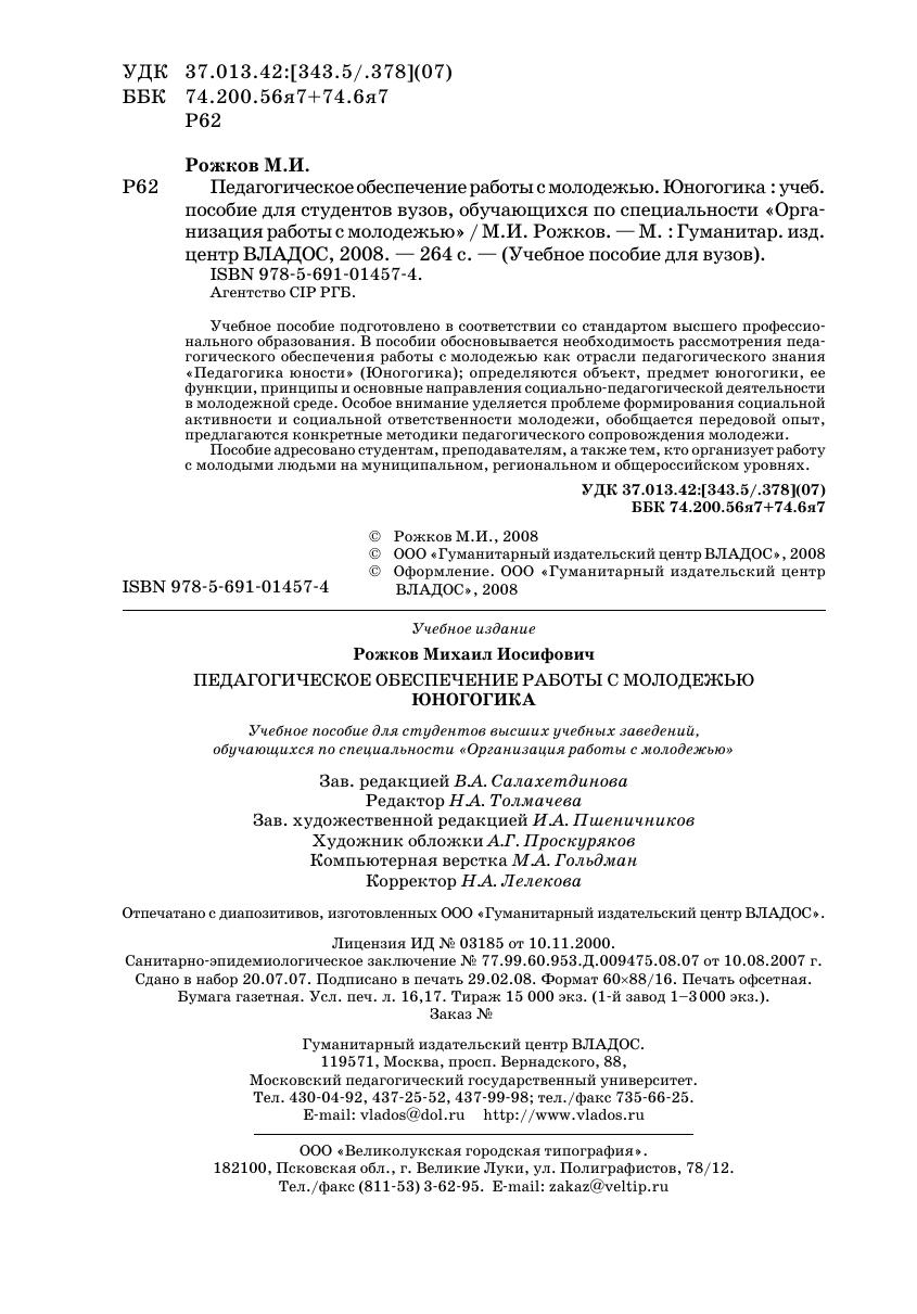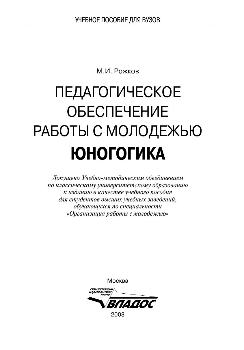 Педагогическое обеспечение работы с молодежью. Юногогика, учебно-методическое пособие