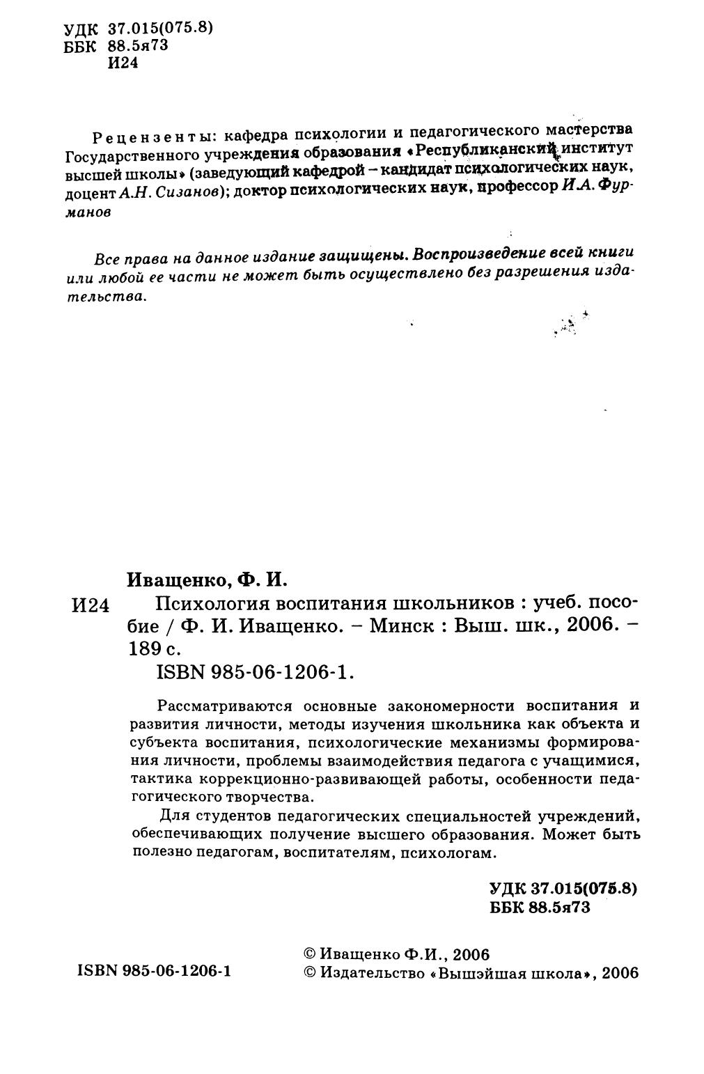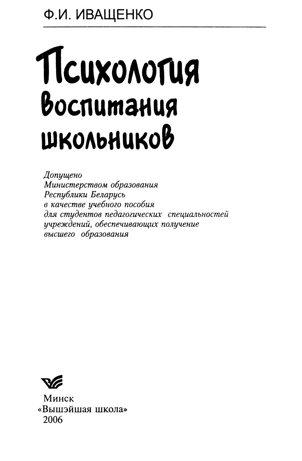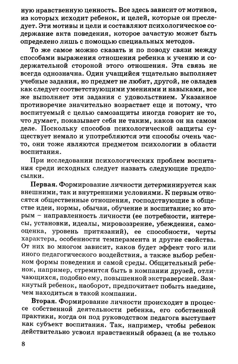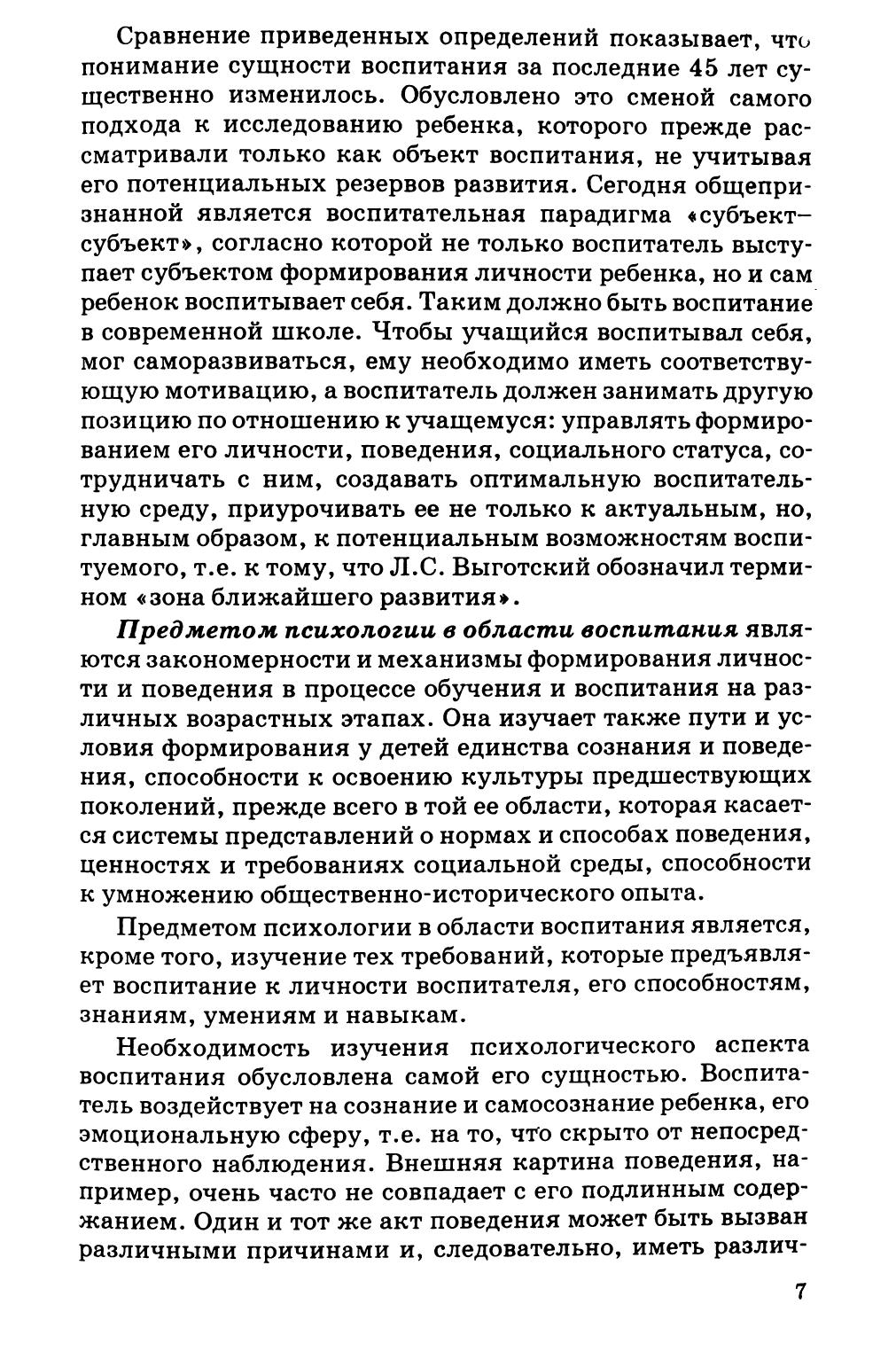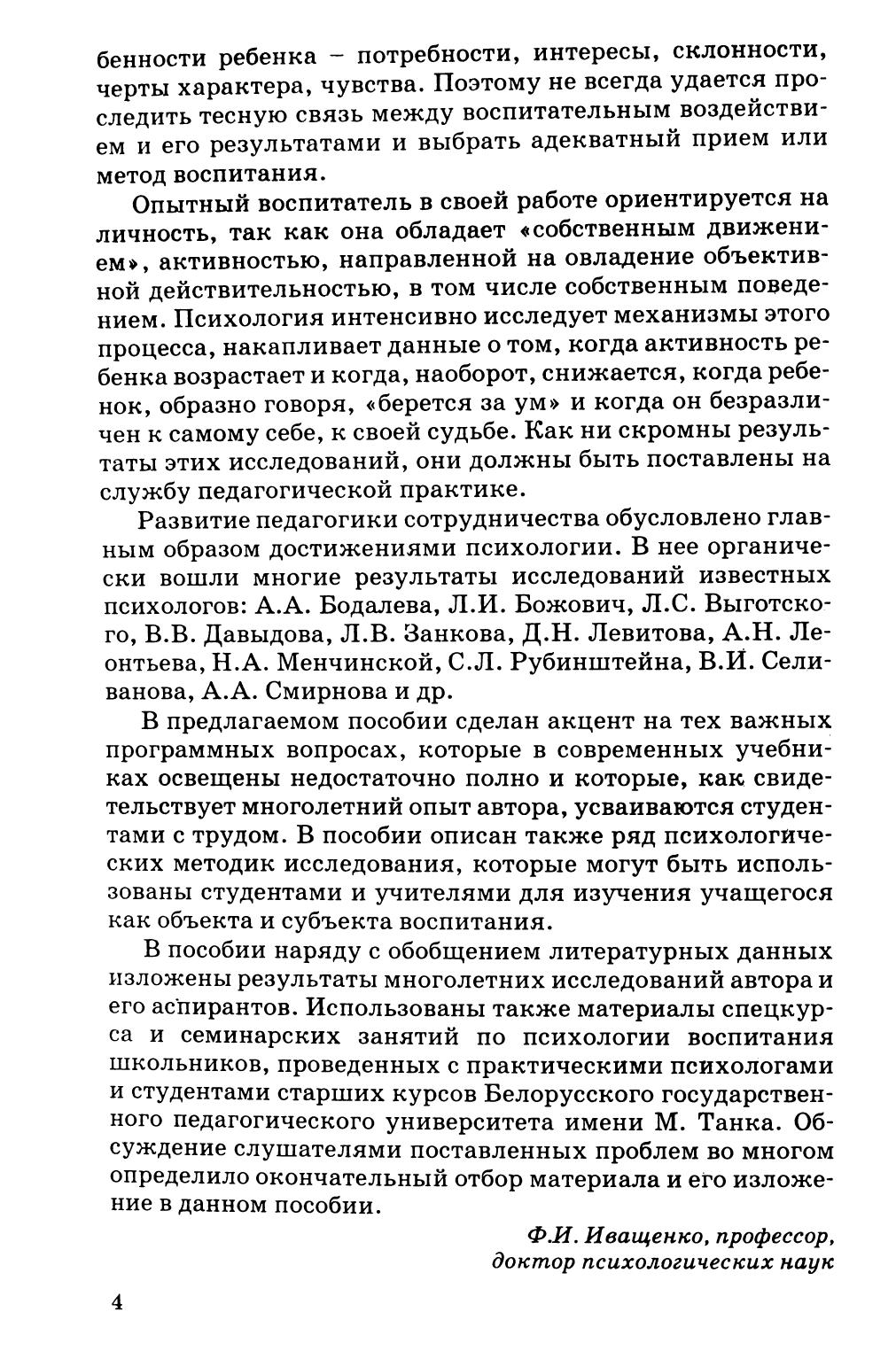 Рассматриваются основные закономерности воспитания и развития личности, методы изучения школьника как объекта и субъекта воспитания, психологические механизмы формирования личности, проблемы взаимодействия педагога с учащимися, тактика коррекционно-развивающей работы, особенности педагогического творчества. Для студентов педагогических специальностей вузов. Может быть полезно педагогам, воспитателям, психологам.