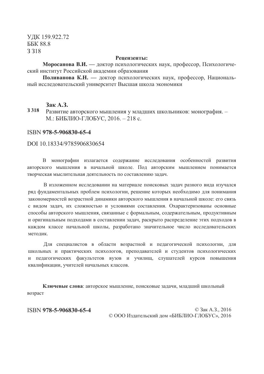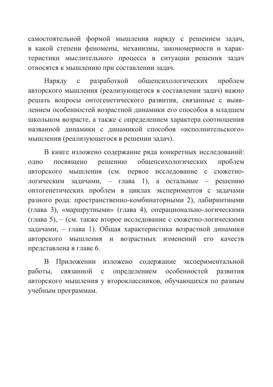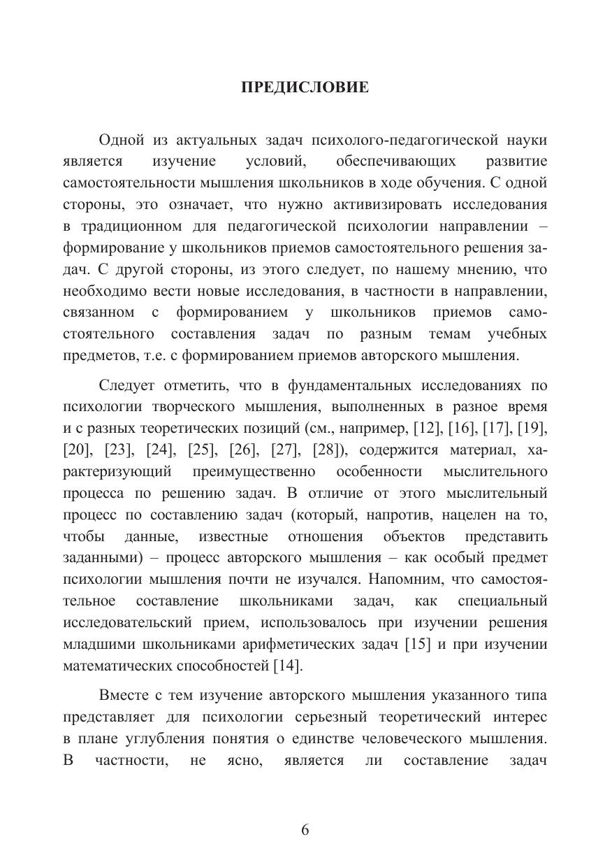 В монографии излагается содержание исследования особенностей развития авторского мышления в начальной школе. Под авторским мышлением понимается творческая мыслительная деятельность по составлению задач. В изложенном исследовании на материале поисковых задач разного вида изучался ряд фундаментальных проблем психологии, решение которых необходимо для понимания закономерностей возрастной динамики авторского мышления в начальной школе: его связь с видом задач, их сложностью и условиями составления. Охарактеризованы основные способы авторского мышления, связанные с формальным, содержательным, продуктивным и оригинальным подходами в составлении задач, раскрыто распределение этих подходов в каждом классе начальной школы, разработано значительное число исследовательских методик. Для специалистов в области возрастной и педагогической психологии, для школьных и практических психологов, преподавателей и студентов психологических и педагогических факультетов вузов и училищ, слушателей курсов повышения квалификации, учителей начальных классов.