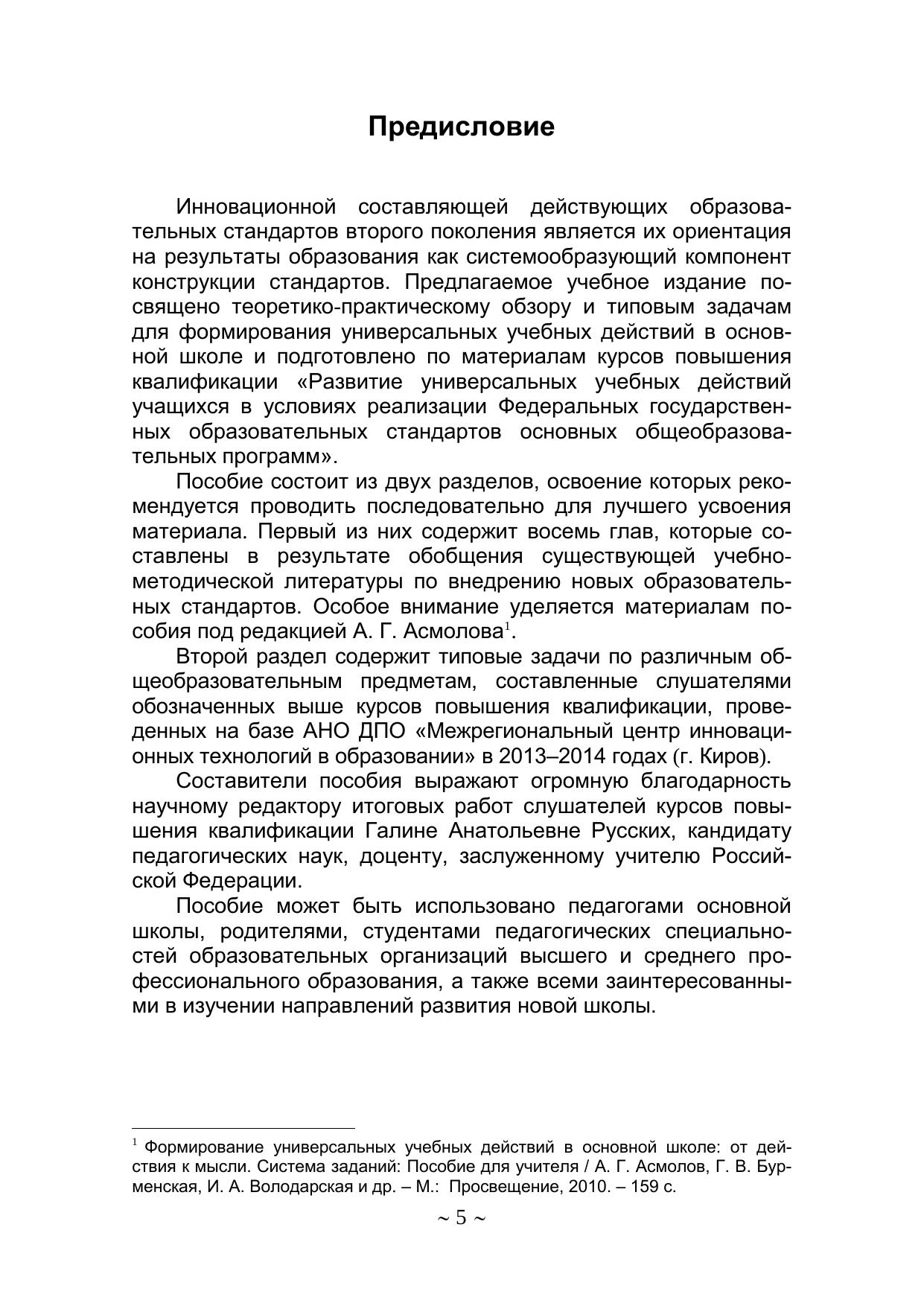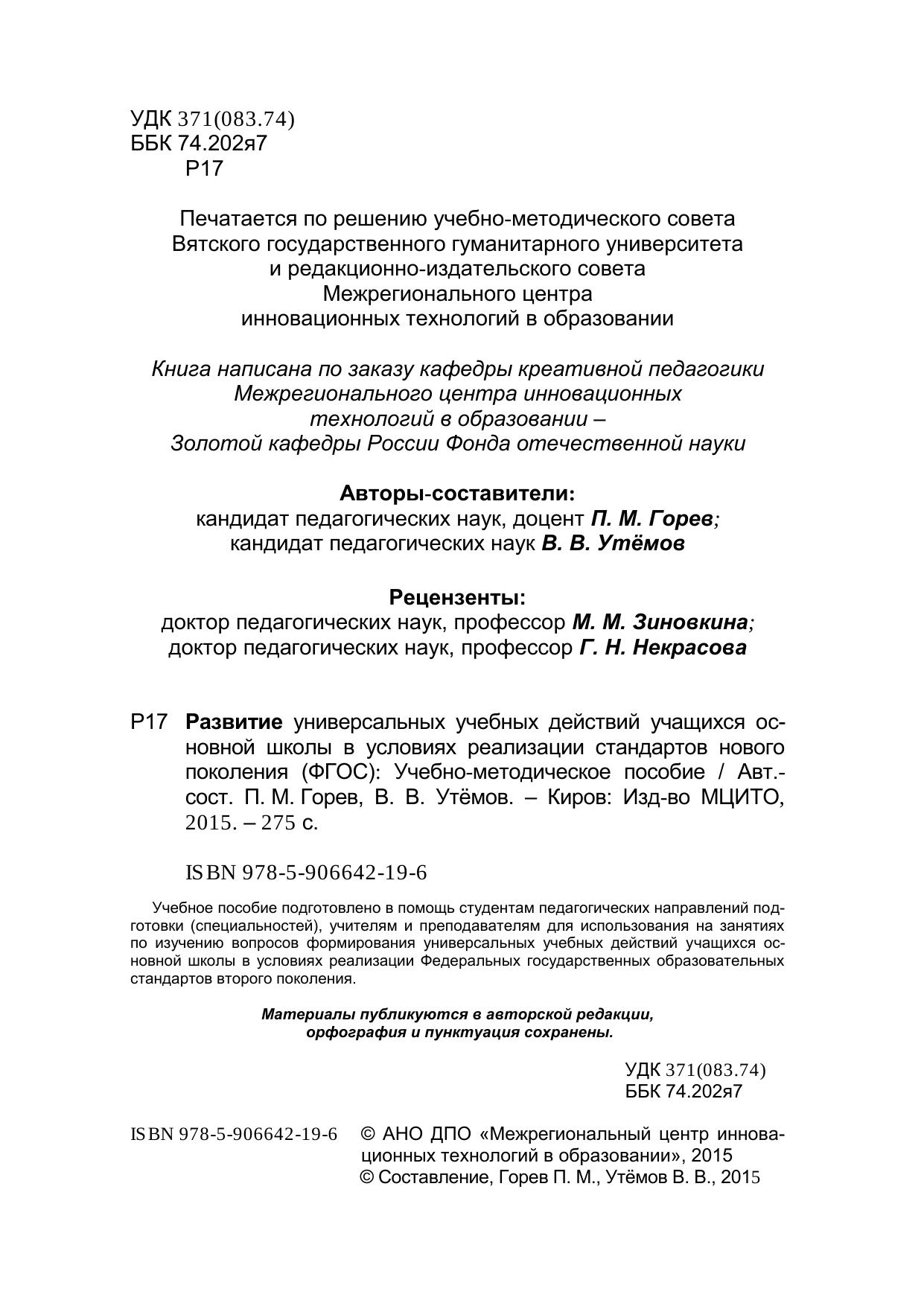 Учебное пособие подготовлено в помощь студентам педагогических направлений подготовки (специальностей), учителям и преподавателям для использования на занятиях по изучению вопросов формирования универсальных учебных действий учащихся основной школы в условиях реализации Федеральных государственных образовательных стандартов второго поколения.
