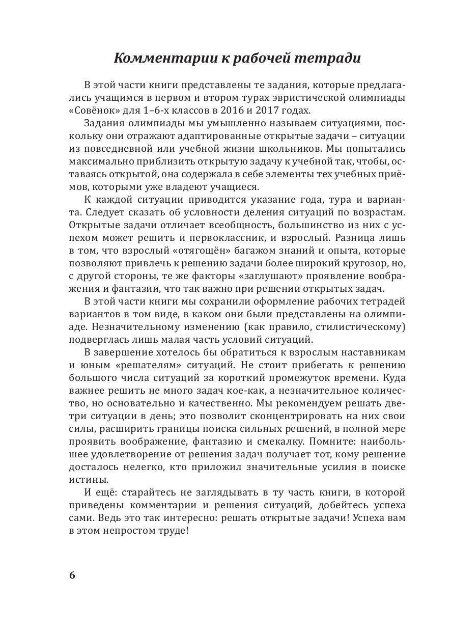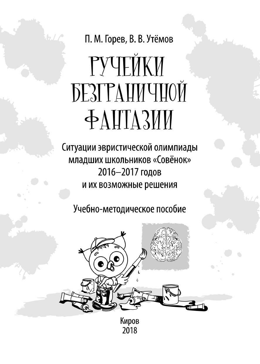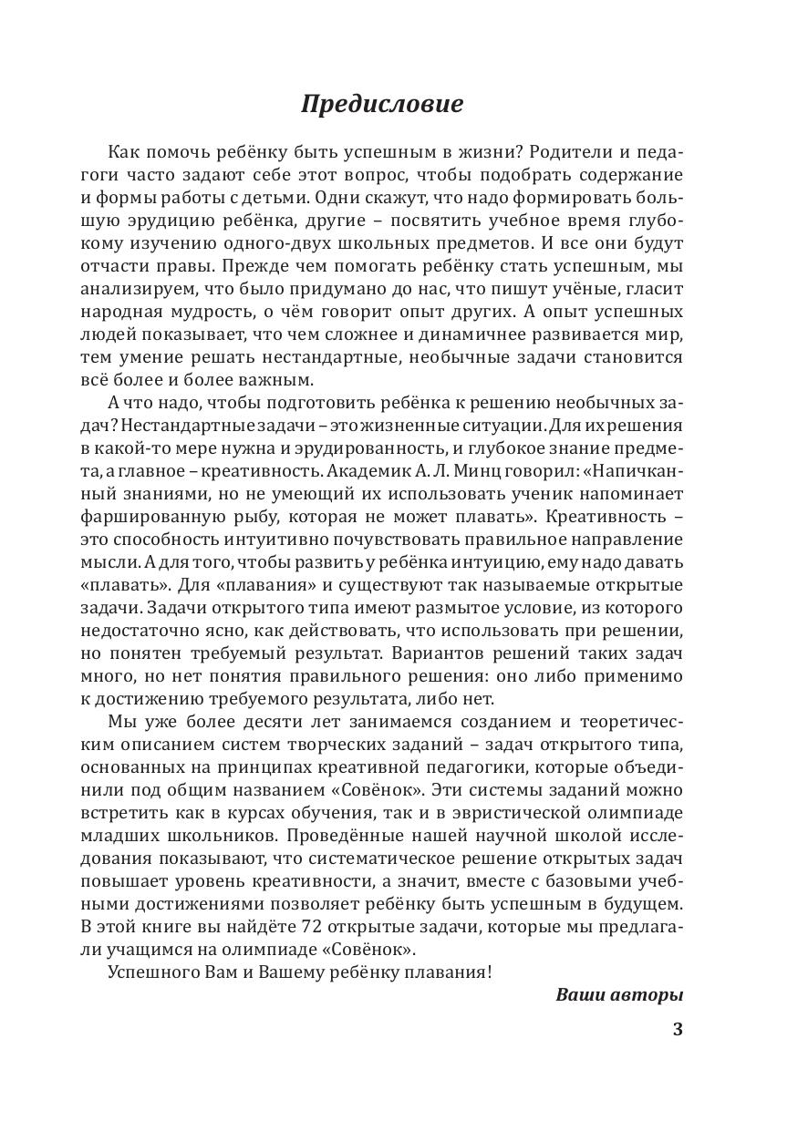 Учебно-методическое пособие обобщает и систематизирует опыт проведения авторами эвристической олимпиады младших школьников «Совёнок» в 2016–2017 годах, основная часть заданий которой построена на теории открытых задач. В пособии приводятся все задания, предлагавшиеся на олимпиаде за два года, ответы и комментарии к ним. Книга является продолжением пособий «Формула творчества» и «Радуга творческих идей». Учебно-методическое пособие может быть интересно учащимся средней школы, их учителям, воспитателям и родителям, студентам, а также всем тем, кто хочет развить творческую составляющую своего мышления.
