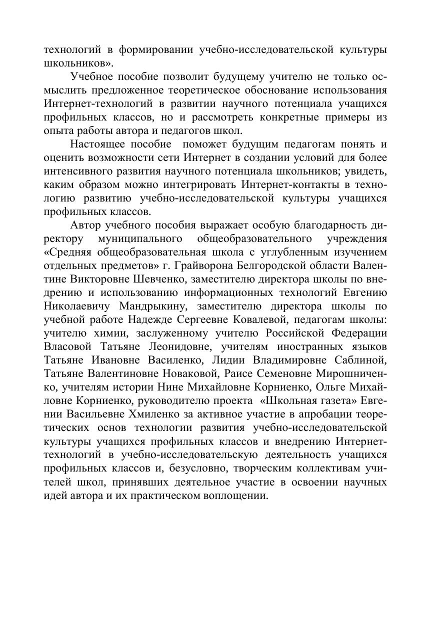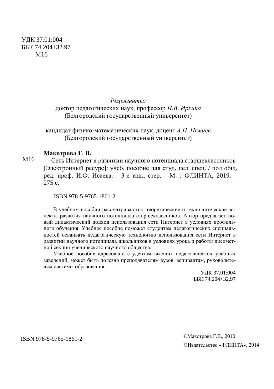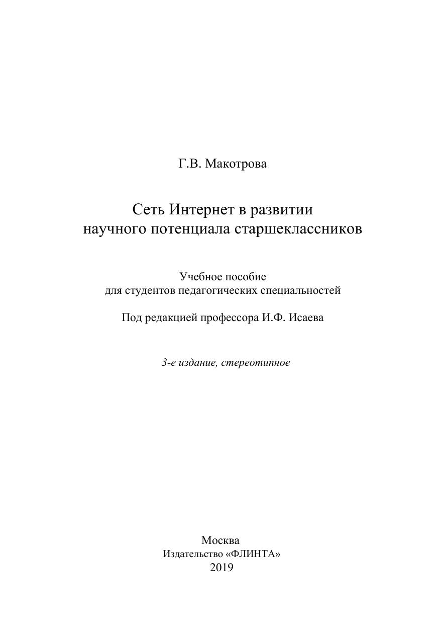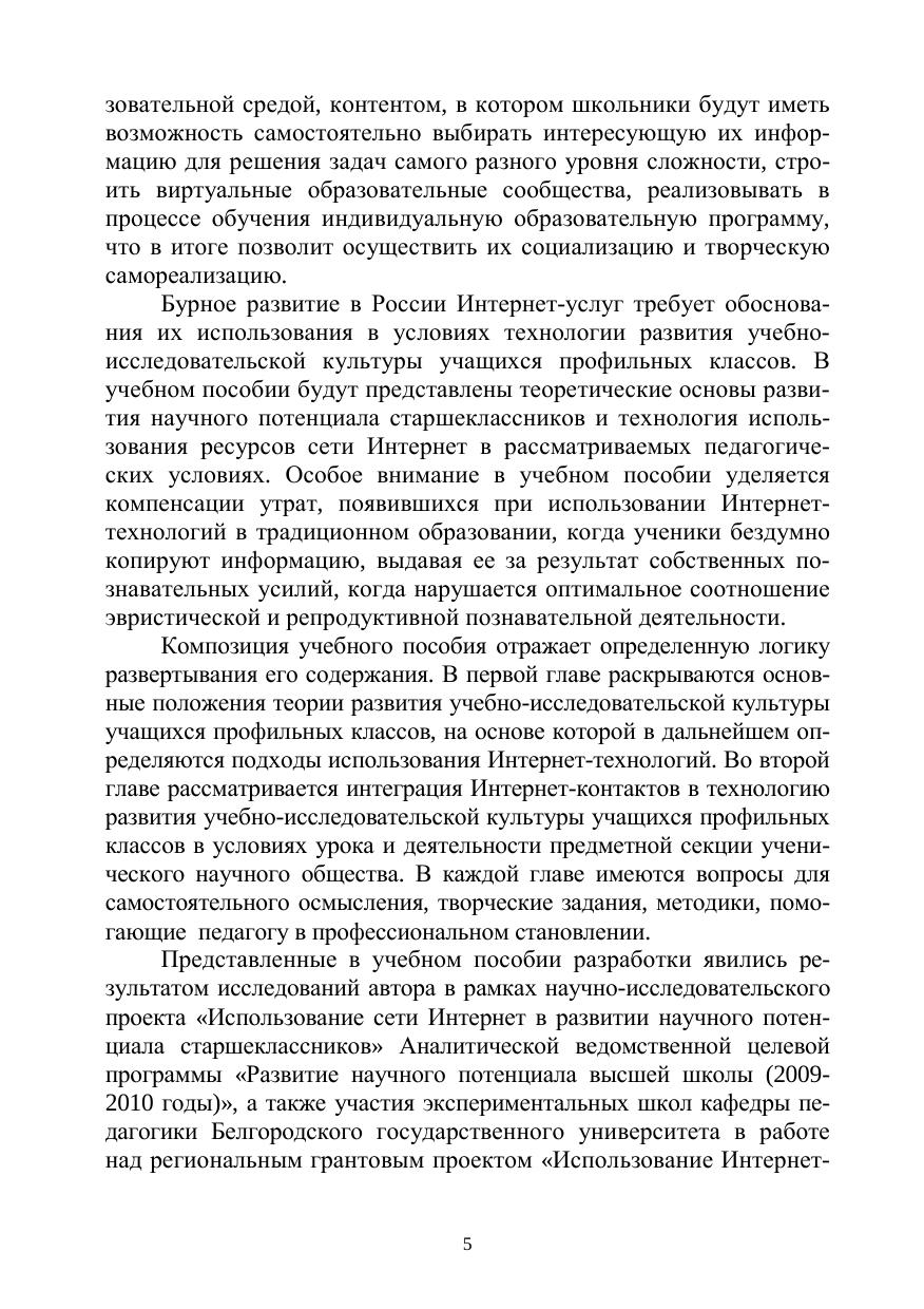 В учебном пособии рассматриваются теоретические и технологические аспекты развития научного потенциала старшеклассников. Автор предлагает новый дидактический подход использования сети Интернет в условиях профильного обучения. Учебное пособие поможет студентам педагогических специальностей осваивать педагогическую технологию использования сети Интернет в развитии научного потенциала школьников в условиях урока и работы предметной секции ученического научного общества.
