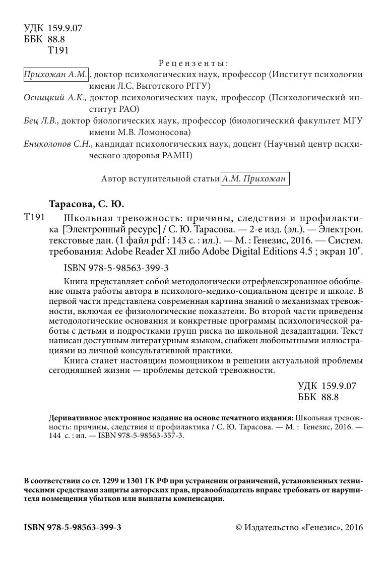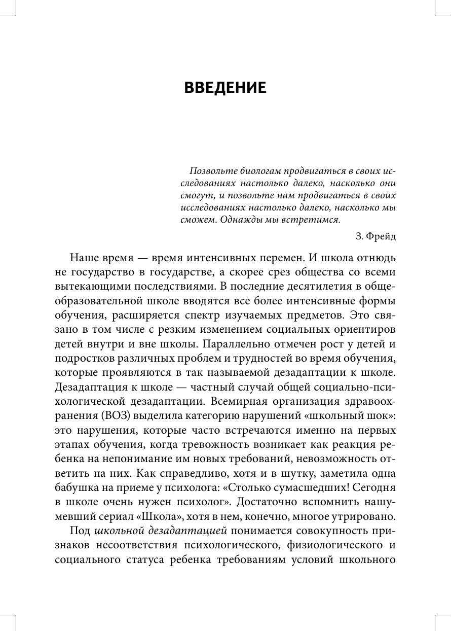 Книга представляет собой методологически отрефлексированное обобщение опыта работы автора в психолого-медико-социальном центре и школе. В первой части представлена современная картина знаний о механизмах тревожности, включая ее физиологические показатели. Во второй части приведены методологические основания и конкретные программы психологической работы с детьми и подростками групп риска по школьной дезадаптации. Текст написан доступным литературным языком, снабжен любопытными иллюстрациями из личной консультативной практики.