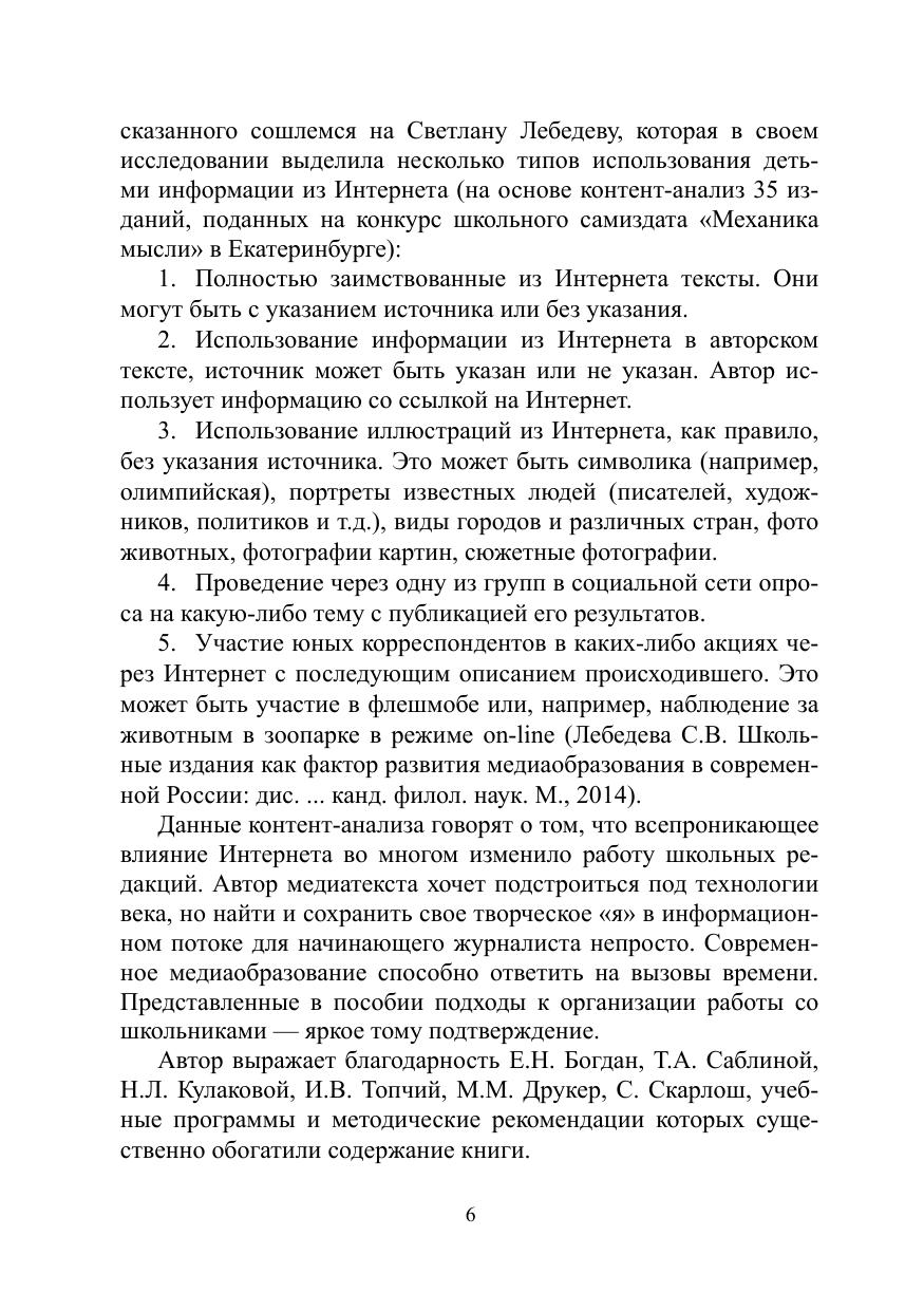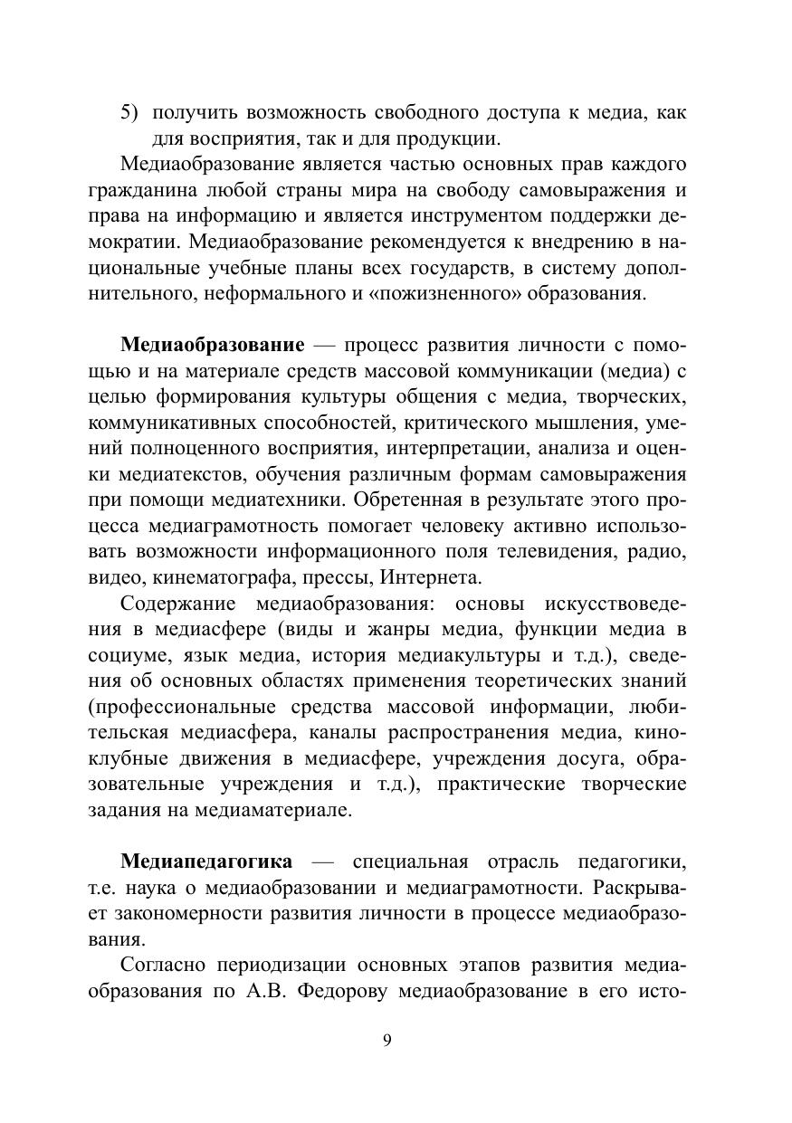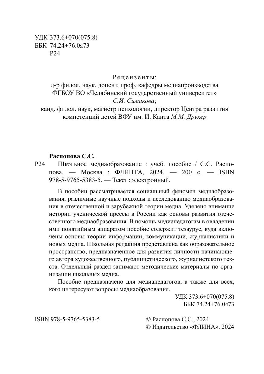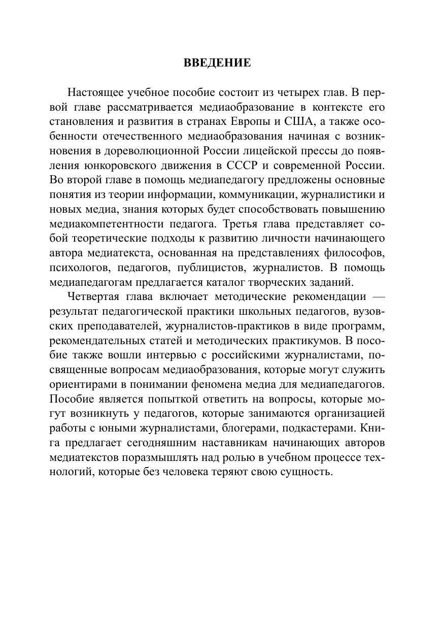 В пособии рассматривается социальный феномен медиаобразования, различные научные подходы к исследованию медиаобразования в отечественной и зарубежной теории медиа. Уделено внимание истории ученической прессы в России как основы развития отечественного медиаобразования. В помощь медиапедагогам в овладении ими понятийным аппаратом пособие содержит тезаурус, куда включены основы теории информации, коммуникации, журналистики и новых медиа. Школьная редакция представлена как образовательное пространство, предназначенное для развития личности начинающего автора художественного, публицистического, журналистского текста. Отдельный раздел занимают методические материалы по организации школьных медиа.