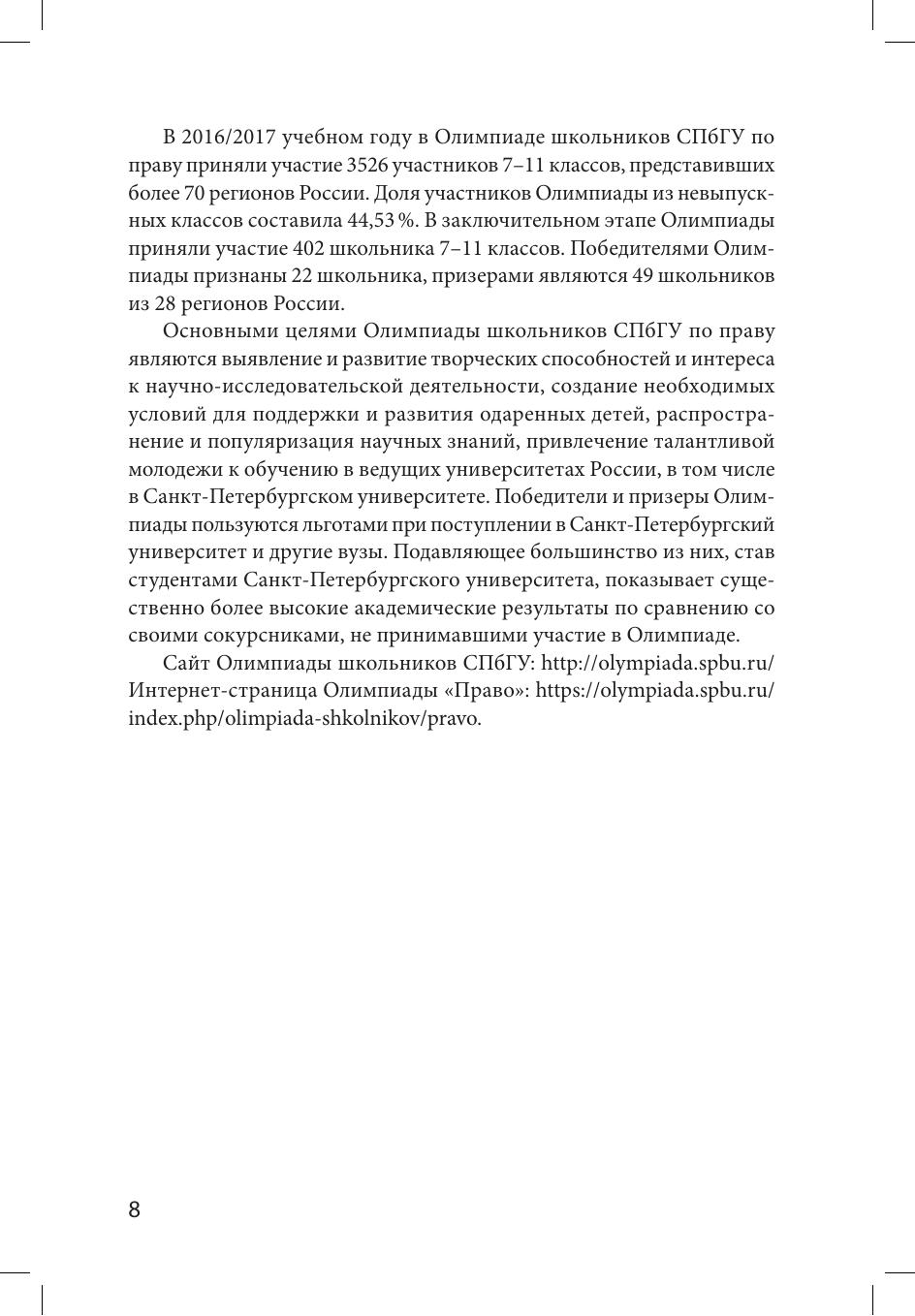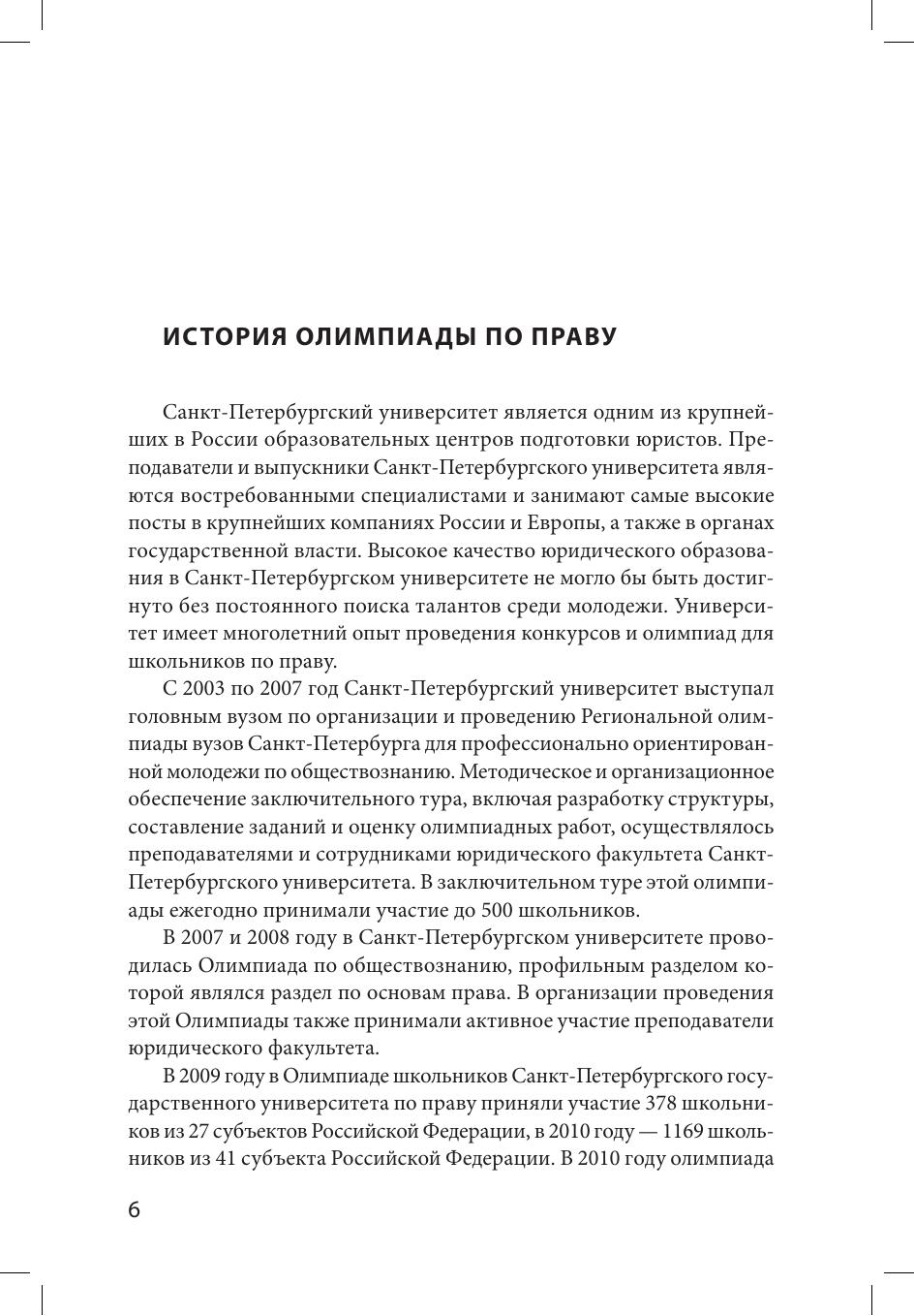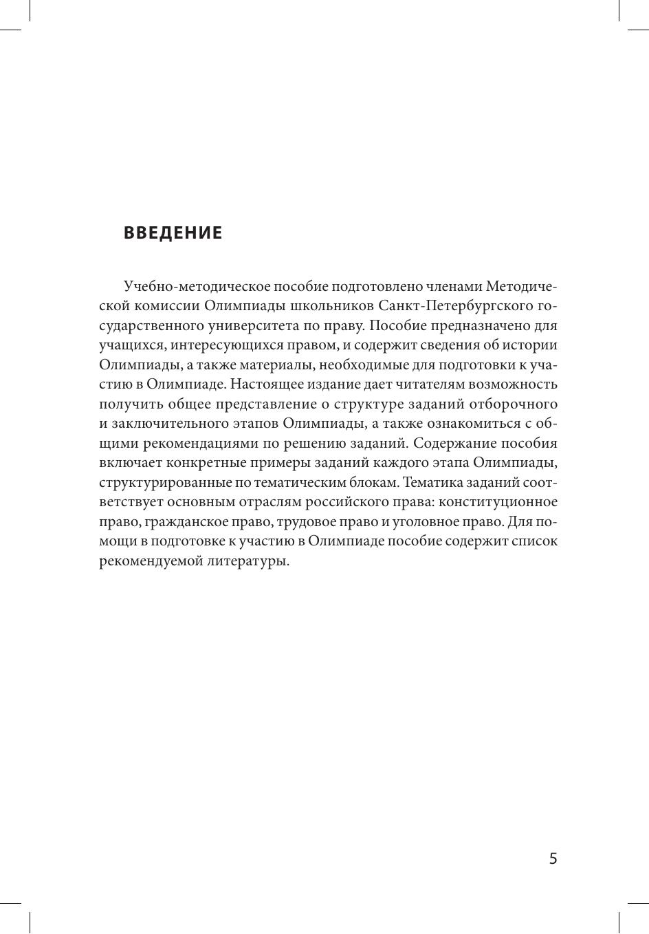 Издание подготовлено членами Методической комиссии Олимпиады школьников Санкт-Петербургского государственного университета по праву. Пособие содержит материалы, необходимые для подготовки к участию в Олимпиаде. Дает читателям возможность получить общее представление о структуре заданий отборочного и заключительного этапов Олимпиады, а также ознакомиться с общими рекомендациями по решению заданий. Пособие включает конкретные примеры заданий каждого этапа Олимпиады. Издание предназначено для подготовки к участию в Олимпиадах школьников СПбГУ.