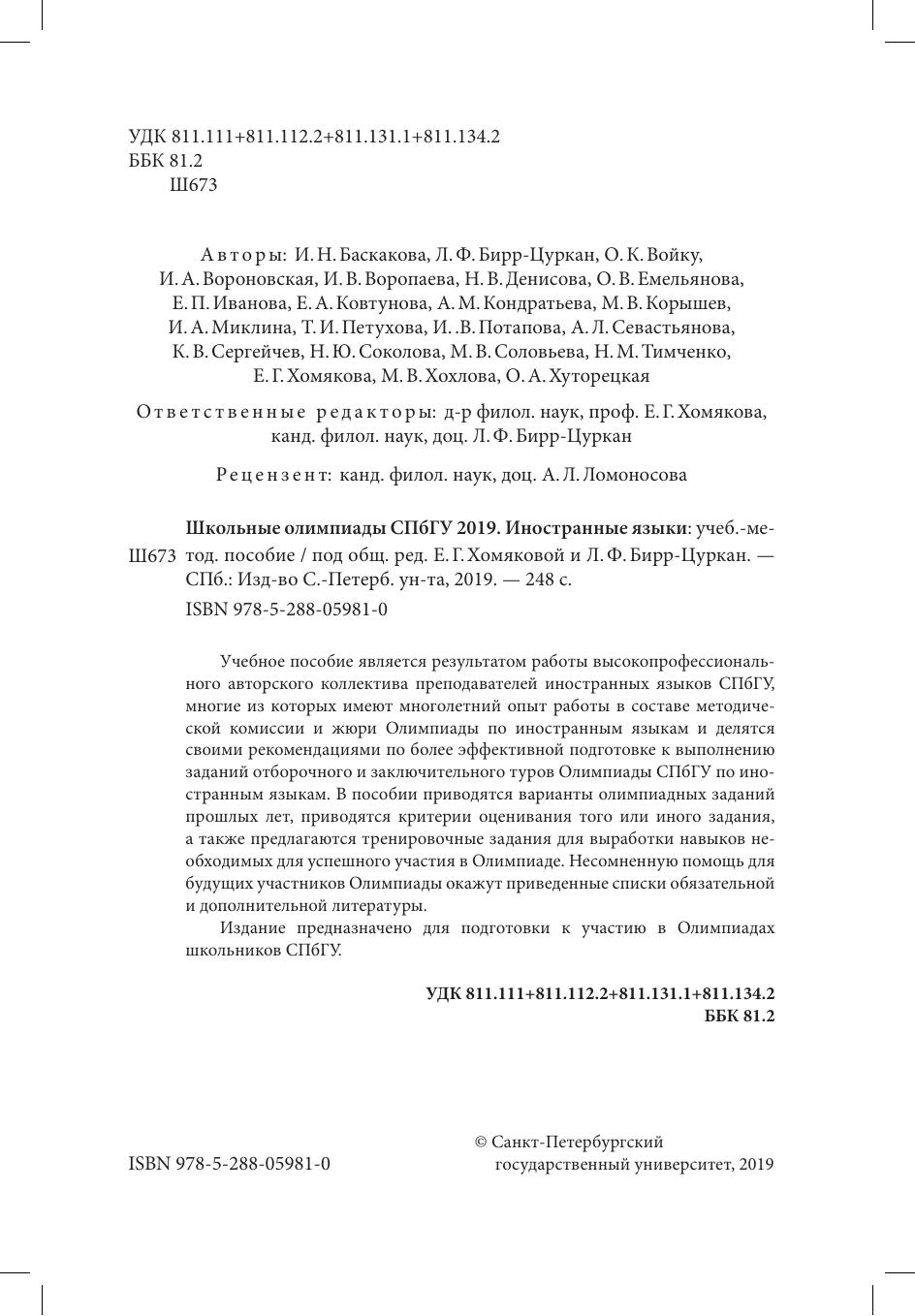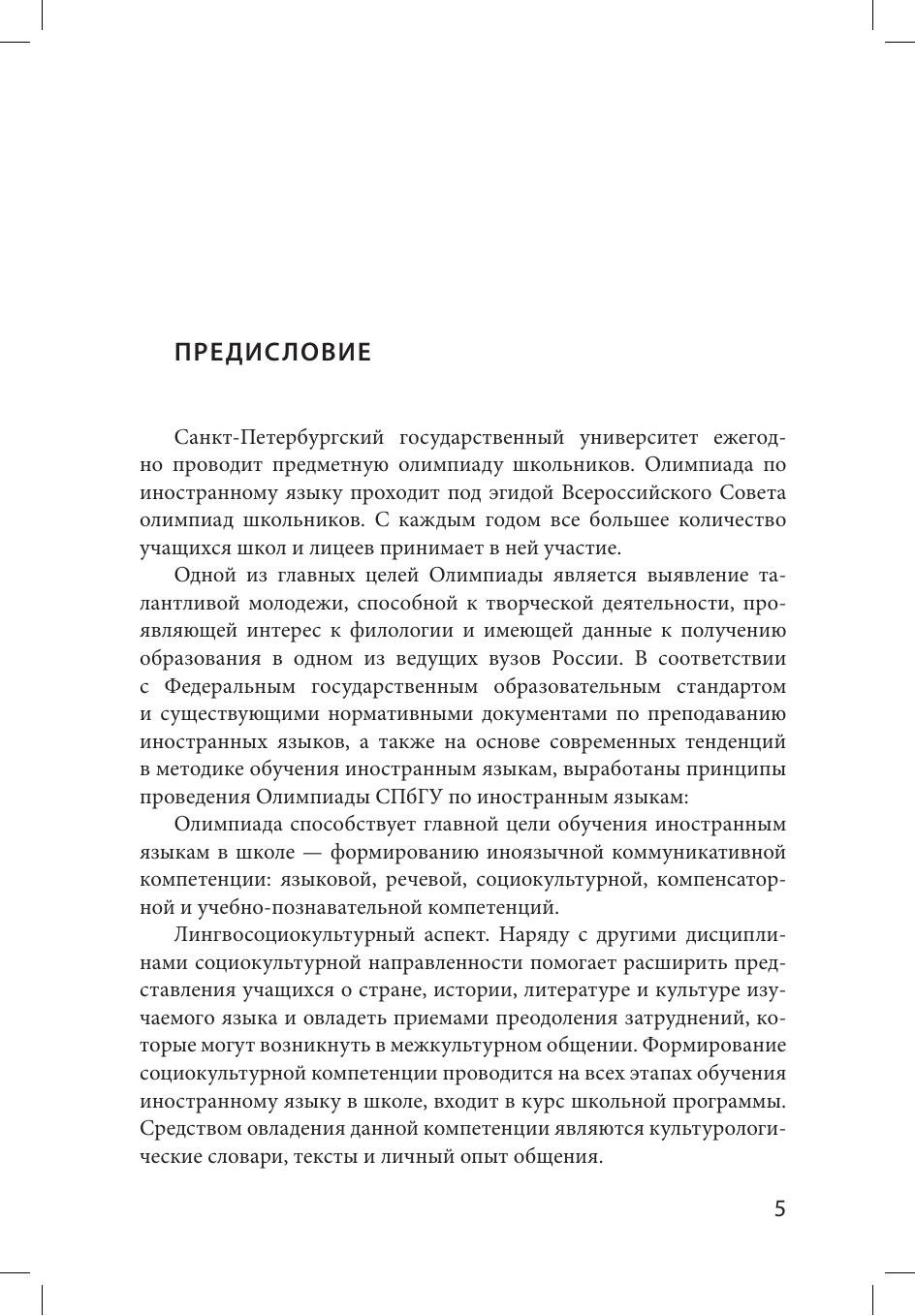 Учебное пособие является результатом работы высокопрофессионального коллектива преподавателей иностранных языков СПбГУ, многие из которых имеют многолетний опыт работы в составе методической комиссии и жюри Олимпиады по иностранным языкам и делятся своими рекомендациями по более эффективной подготовке к выполнению заданий отборочного и заключительного туров Олимпиады СПбГУ по иностранным языкам. В пособии приводятся варианты олимпиадных заданий прошлых лет, приводятся критерии оценивания того или иного задания, а также предлагаются тренировочные задания для выработки навыков необходимых для успешного участия в Олимпиаде. Несомненную помощь для будущих участников Олимпиады окажут приведенные списки обязательной и дополнительной литературы.