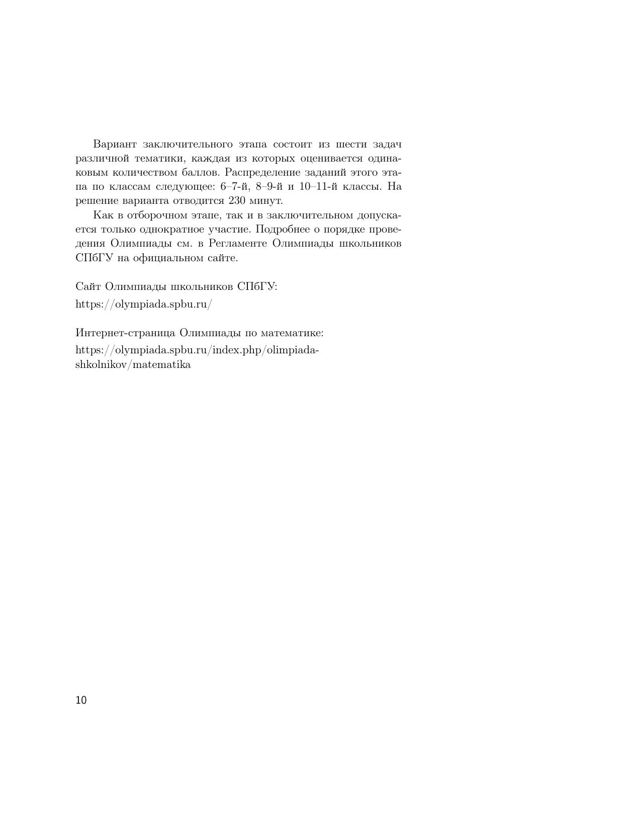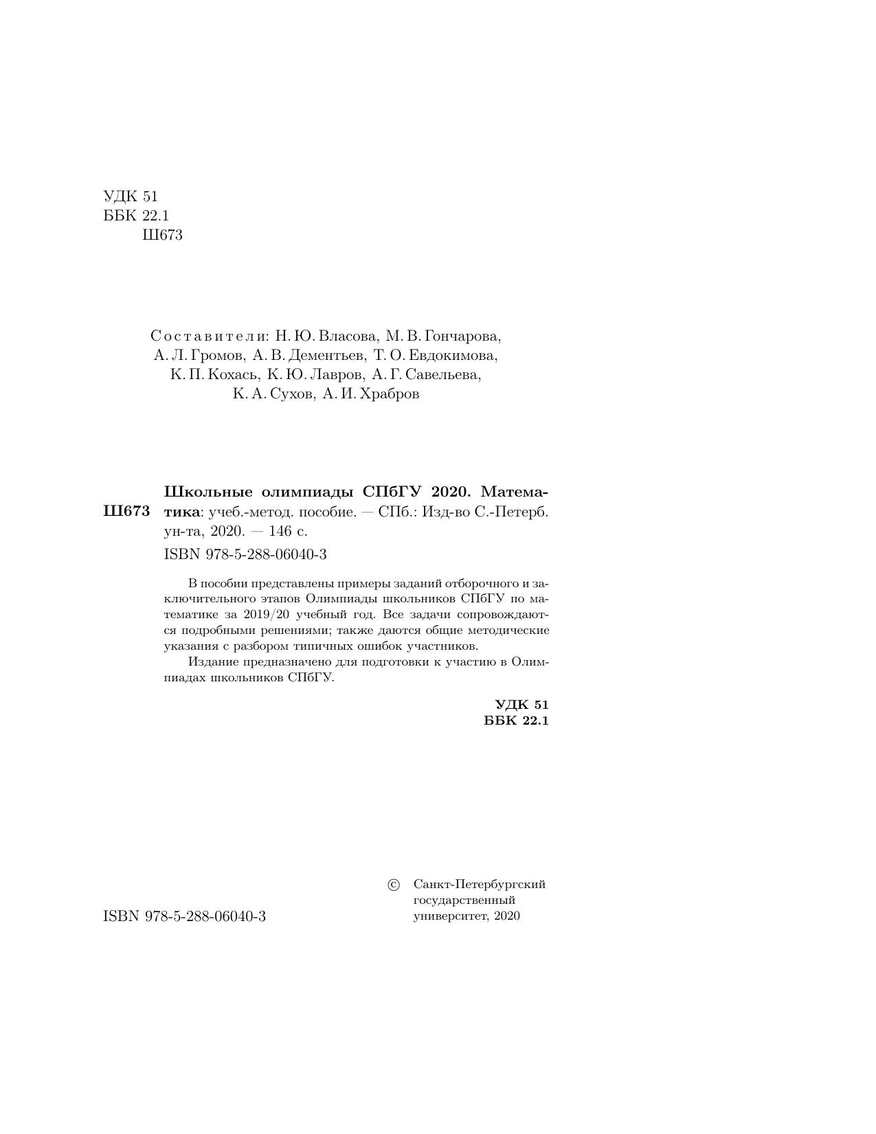 В пособии представлены примеры заданий отборочного и заключительного этапов Олимпиады школьников СПбГУ по математике за 2019/20 учебный год. Все задачи сопровождаются подробными решениями; также даются общие методические указания с разбором типичных ошибок участников. Издание предназначено для подготовки к участию в Олимпиадах школьников СПбГУ.