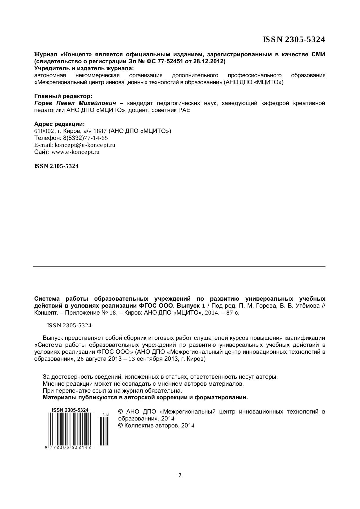 Выпуск представляет собой сборник итоговых работ слушателей курсов повышения квалификации «Система работы образовательных учреждений по развитию универсальных учебных действий в условиях реализации ФГОС ООО» (АНО ДПО «Межрегиональный центр инновационных технологий в образовании», 26 августа 2013 – 13 сентября 2013, г. Киров)