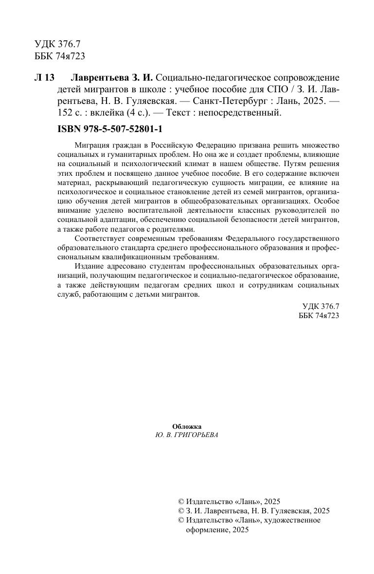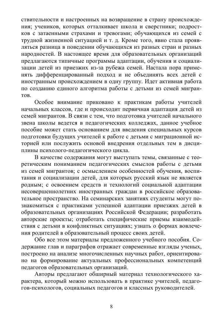 Миграция граждан в Российскую Федерацию призвана решить множество социальных и гуманитарных проблем. Но она же и создает проблемы, влияющие на социальный и психологический климат в нашем обществе. Путям решения этих проблем и посвящено данное учебное пособие. В его содержание включен материал, раскрывающий педагогическую сущность миграции, ее влияние на психологическое и социальное становление детей из семей мигрантов, организацию обучения детей мигрантов в общеобразовательных организациях. Особое внимание уделено воспитательной деятельности классных руководителей по социальной адаптации, обеспечению социальной безопасности детей мигрантов, а также работе педагогов с родителями. Соответствует современным требованиям Федерального государственного образовательного стандарта среднего профессионального образования и профессиональным квалификационным требованиям. Издание адресовано студентам профессиональных образовательных организаций, получающим педагогическое и социально-педагогическое образование, а также действующим педагогам средних школ и сотрудникам социальных служб, работающим с детьми мигрантов.
