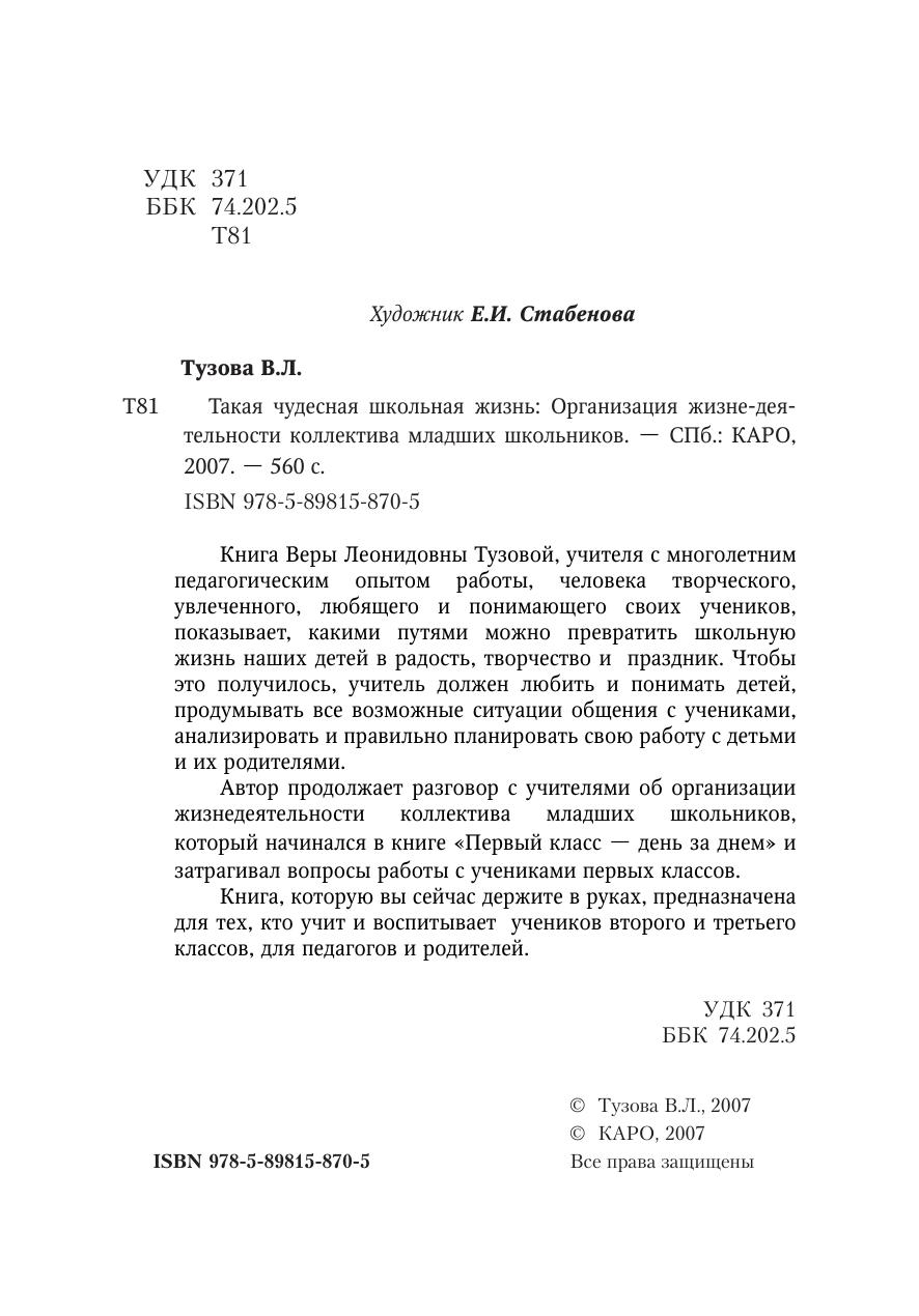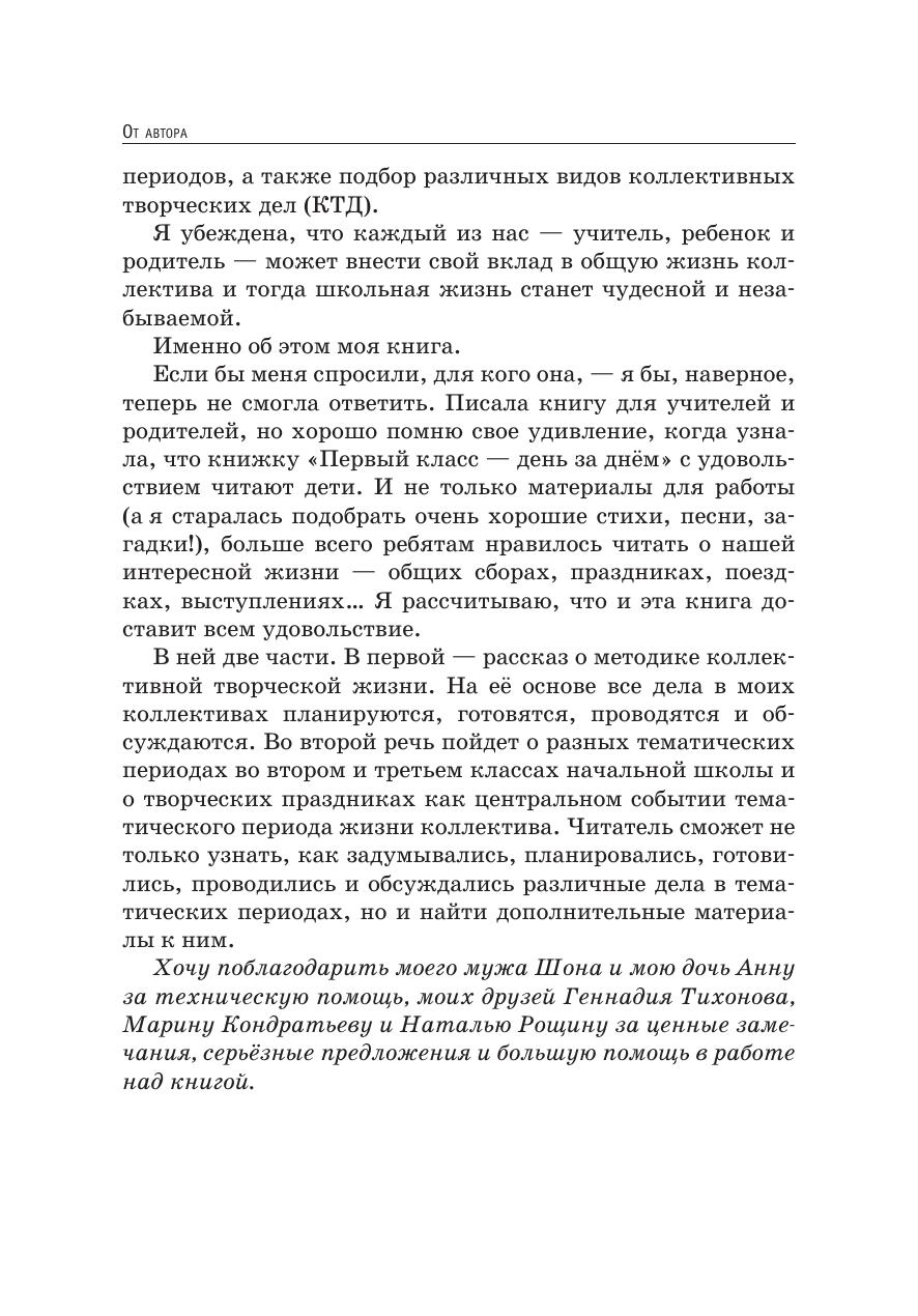 Книга Веры Леонидовны Тузовой, учителя с многолетним педагогическим опытом работы, человека творческого, увлеченного, любящего и понимающего своих учеников, показывает, какими путями можно превратить школьную жизнь наших детей в радость, творчество и праздник. Чтобы это получилось, учитель должен любить и понимать детей, продумывать все возможные ситуации общения с учениками, анализировать и правильно планировать свою работу с детьми и их родителями. Автор продолжает разговор с учителями об организации жизнедеятельности коллектива младших школьников, который начинался в книге «Первый класс — день за днем» и затрагивал вопросы работы с учениками первых классов. Книга, которую вы сейчас держите в руках, предназначена для тех, кто учит и воспитывает учеников второго и третьего классов, для педагогов и родителей.