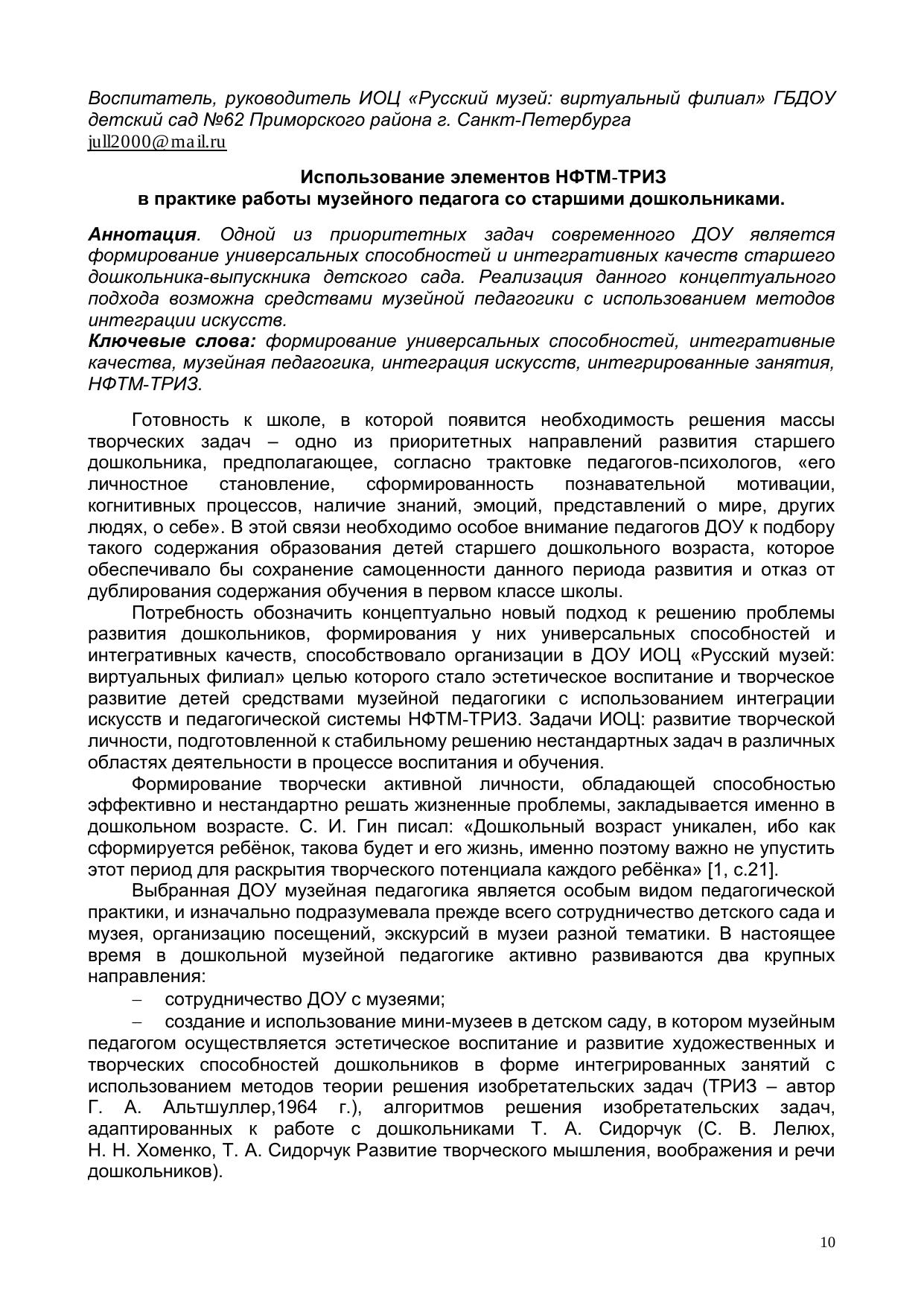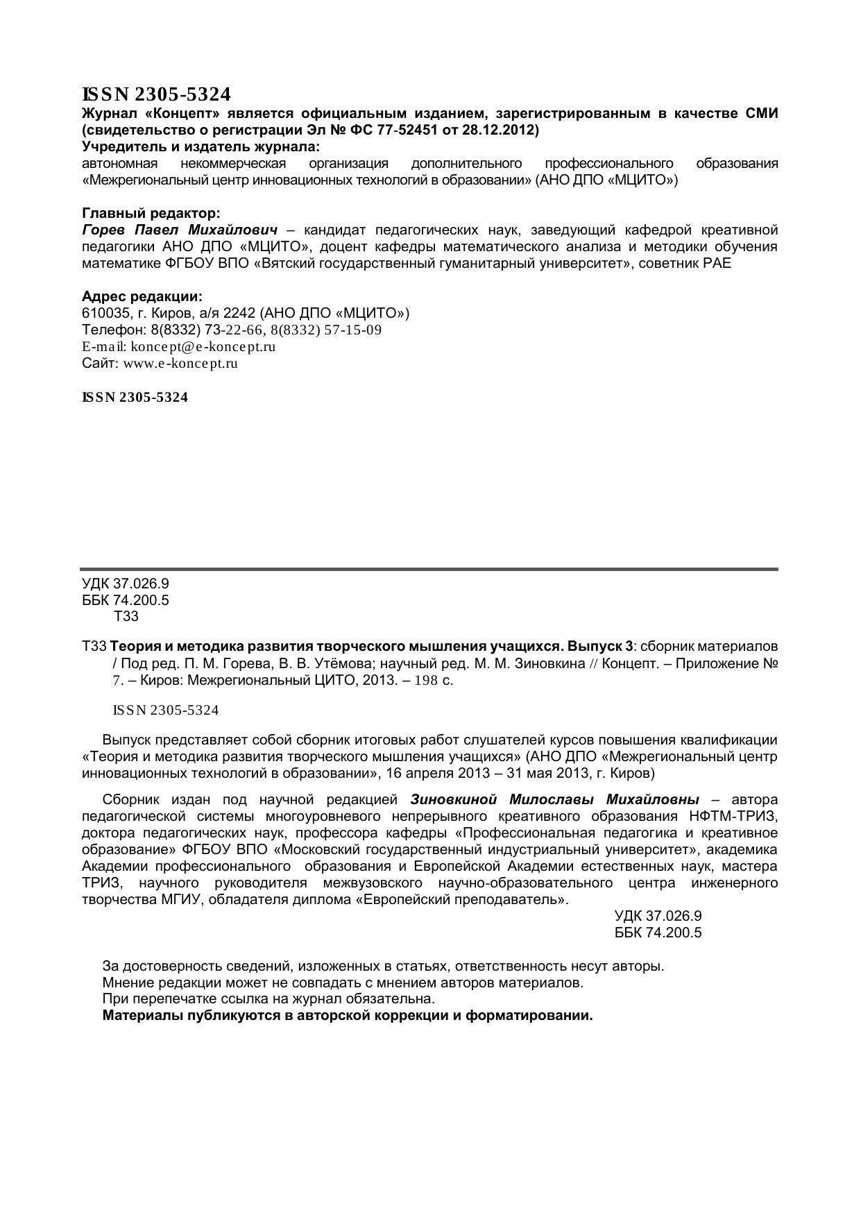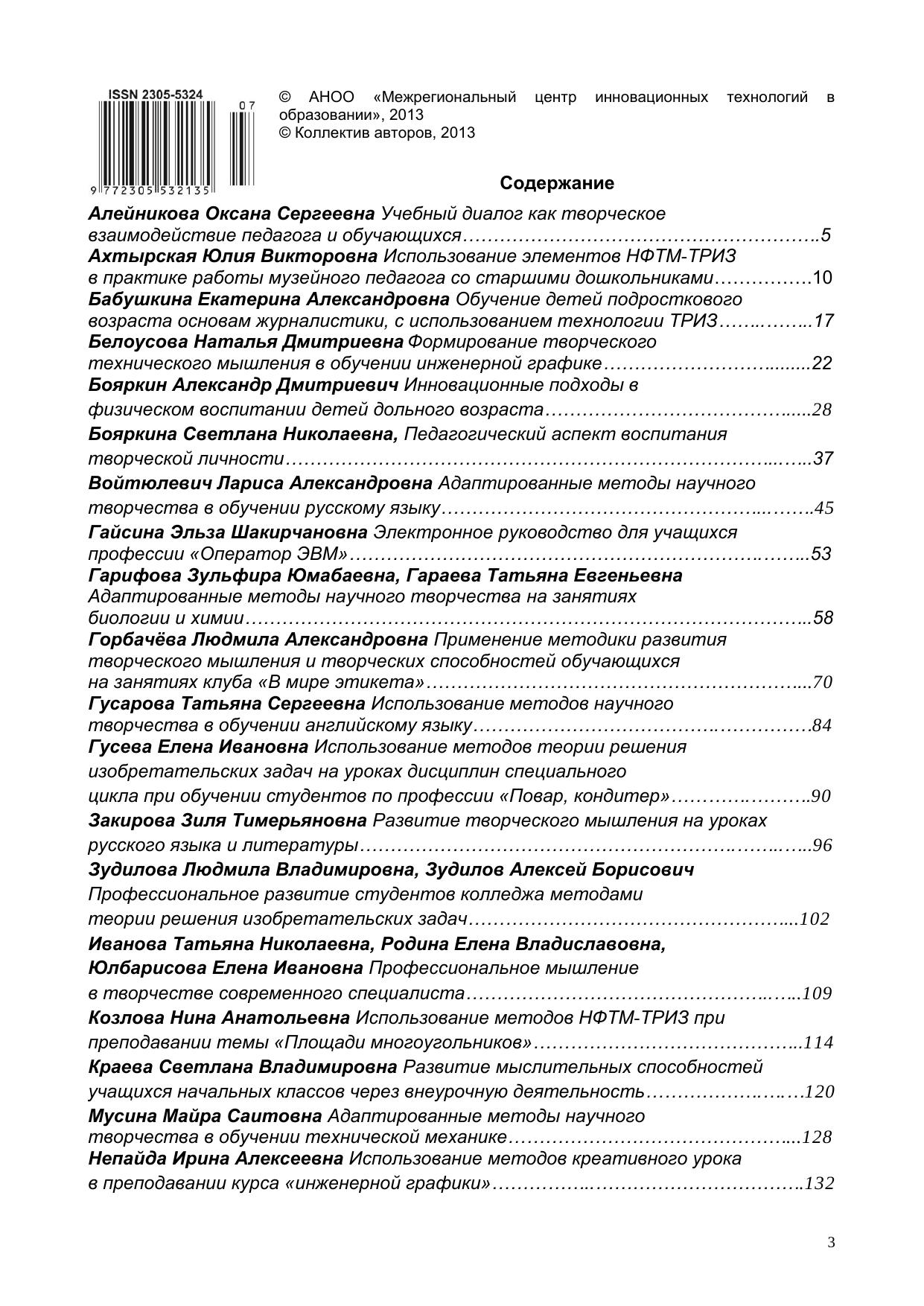 Выпуск представляет собой сборник итоговых работ слушателей курсов повышения квалификации «Теория и методика развития творческого мышления учащихся» (АНО ДПО «Межрегиональный центр инновационных технологий в образовании», 16 апреля 2013 – 31 мая 2013, г. Киров) Сборник издан под научной редакцией Зиновкиной Милославы Михайловны – автора педагогической системы многоуровневого непрерывного креативного образования НФТМ-ТРИЗ, доктора педагогических наук, профессора кафедры «Профессиональная педагогика и креативное образование» ФГБОУ ВПО «Московский государственный индустриальный университет», академика Академии профессионального образования и Европейской Академии естественных наук, мастера ТРИЗ, научного руководителя межвузовского научно-образовательного центра инженерного творчества МГИУ, обладателя диплома «Европейский преподаватель»