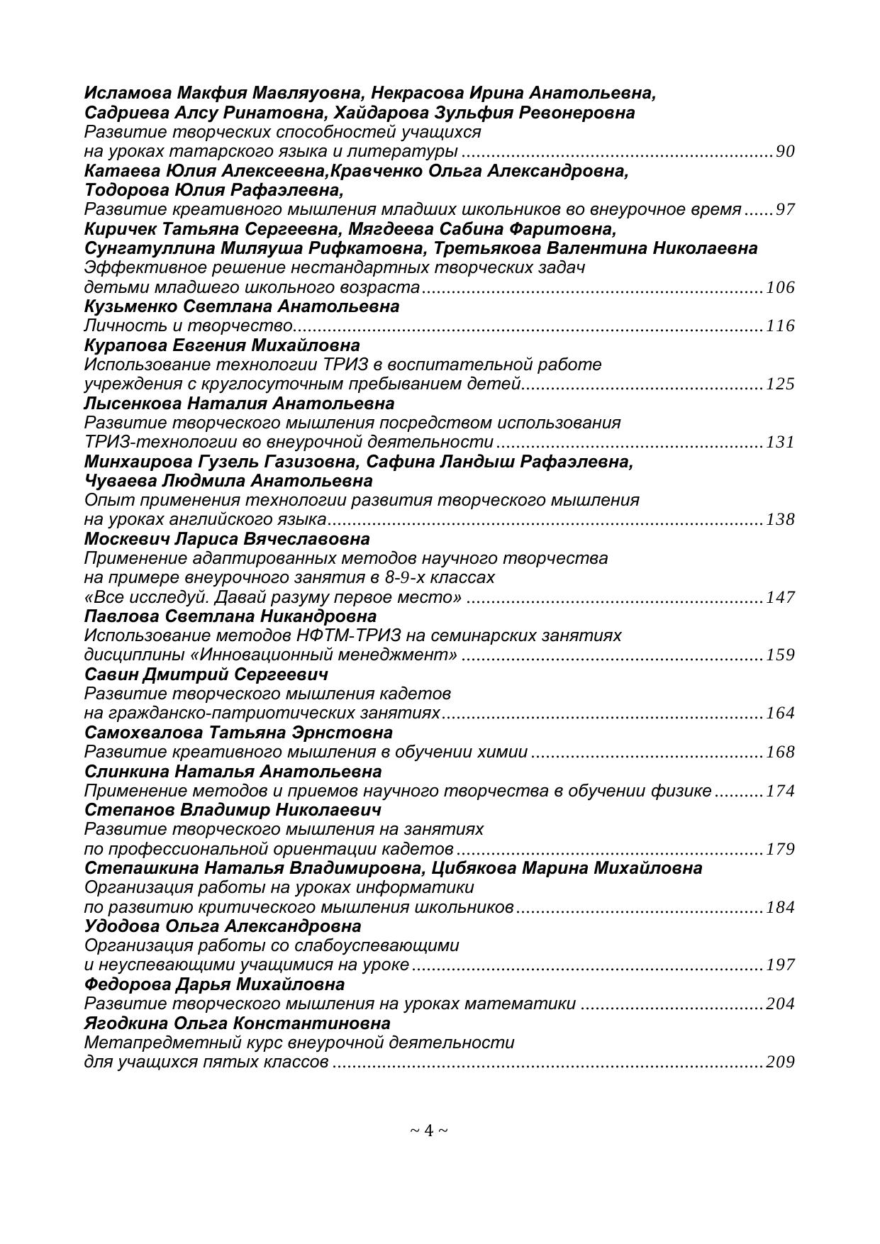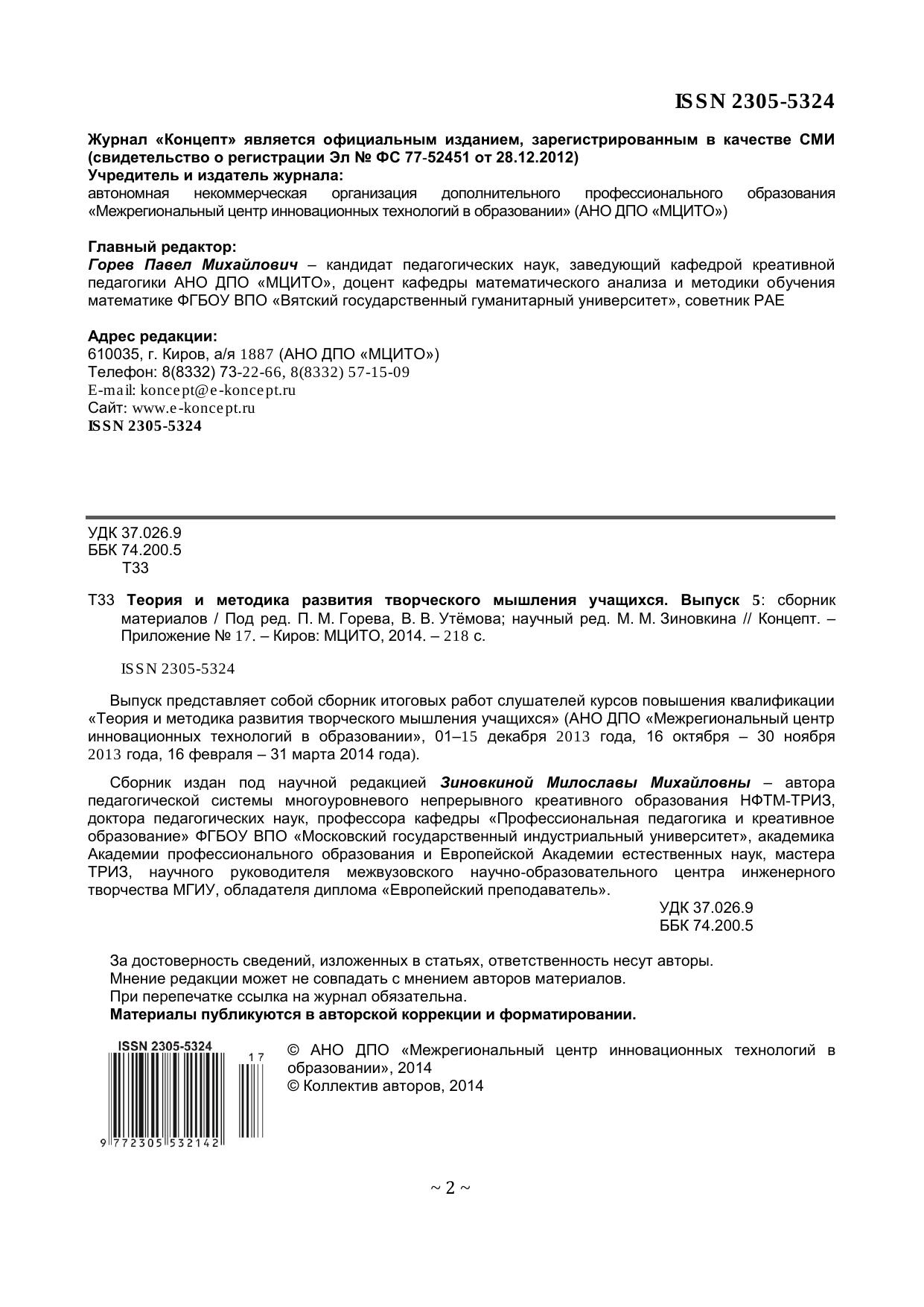 Выпуск представляет собой сборник итоговых работ слушателей курсов повышения квалификации «Теория и методика развития творческого мышления учащихся» (АНО ДПО «Межрегиональный центр инновационных технологий в образовании», 01–15 декабря 2013 года, 16 октября – 30 ноября 2013 года, 16 февраля – 31 марта 2014 года). Сборник издан под научной редакцией Зиновкиной Милославы Михайловны – автора педагогической системы многоуровневого непрерывного креативного образования НФТМ-ТРИЗ, доктора педагогических наук, профессора кафедры «Профессиональная педагогика и креативное образование» ФГБОУ ВПО «Московский государственный индустриальный университет», академика Академии профессионального образования и Европейской Академии естественных наук, мастера ТРИЗ, научного руководителя межвузовского научно-образовательного центра инженерного творчества МГИУ, обладателя диплома «Европейский преподаватель».
