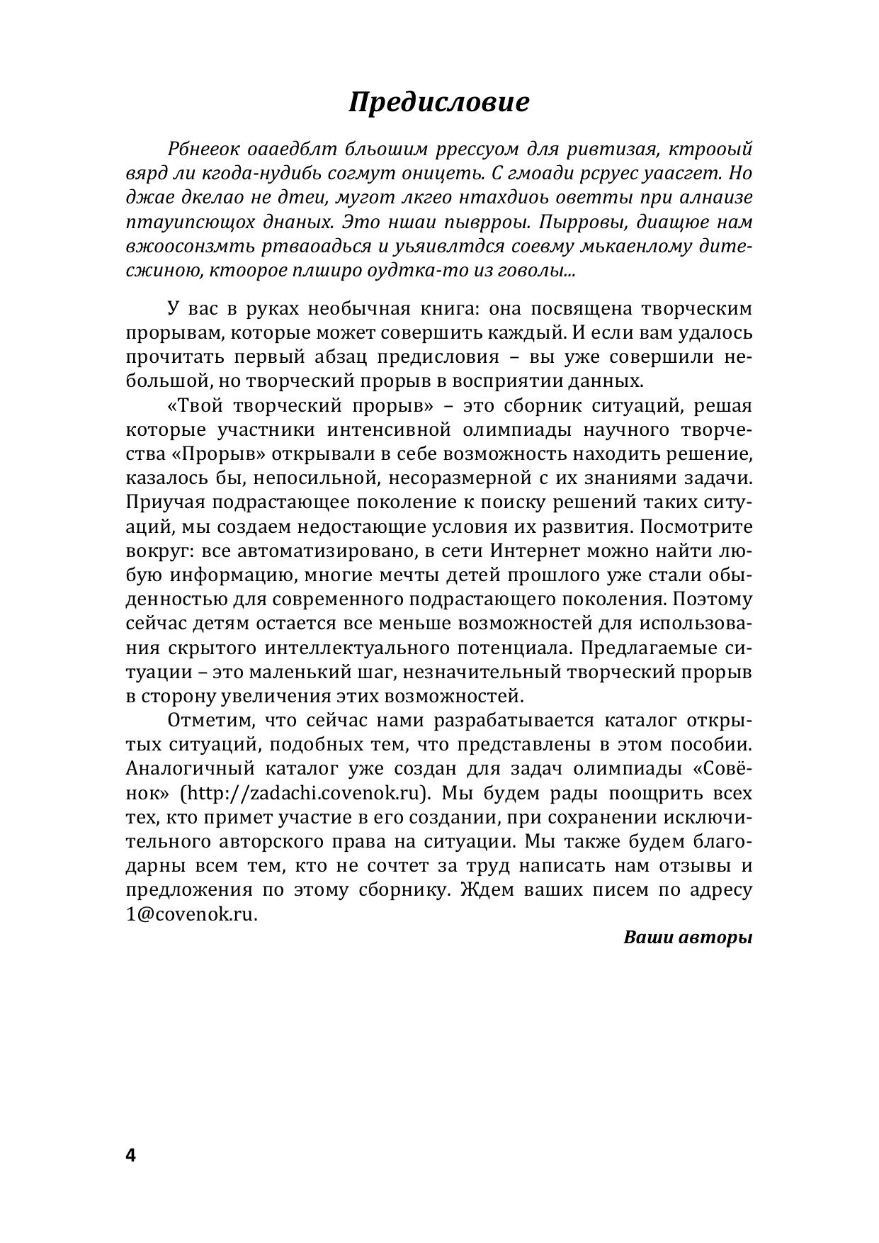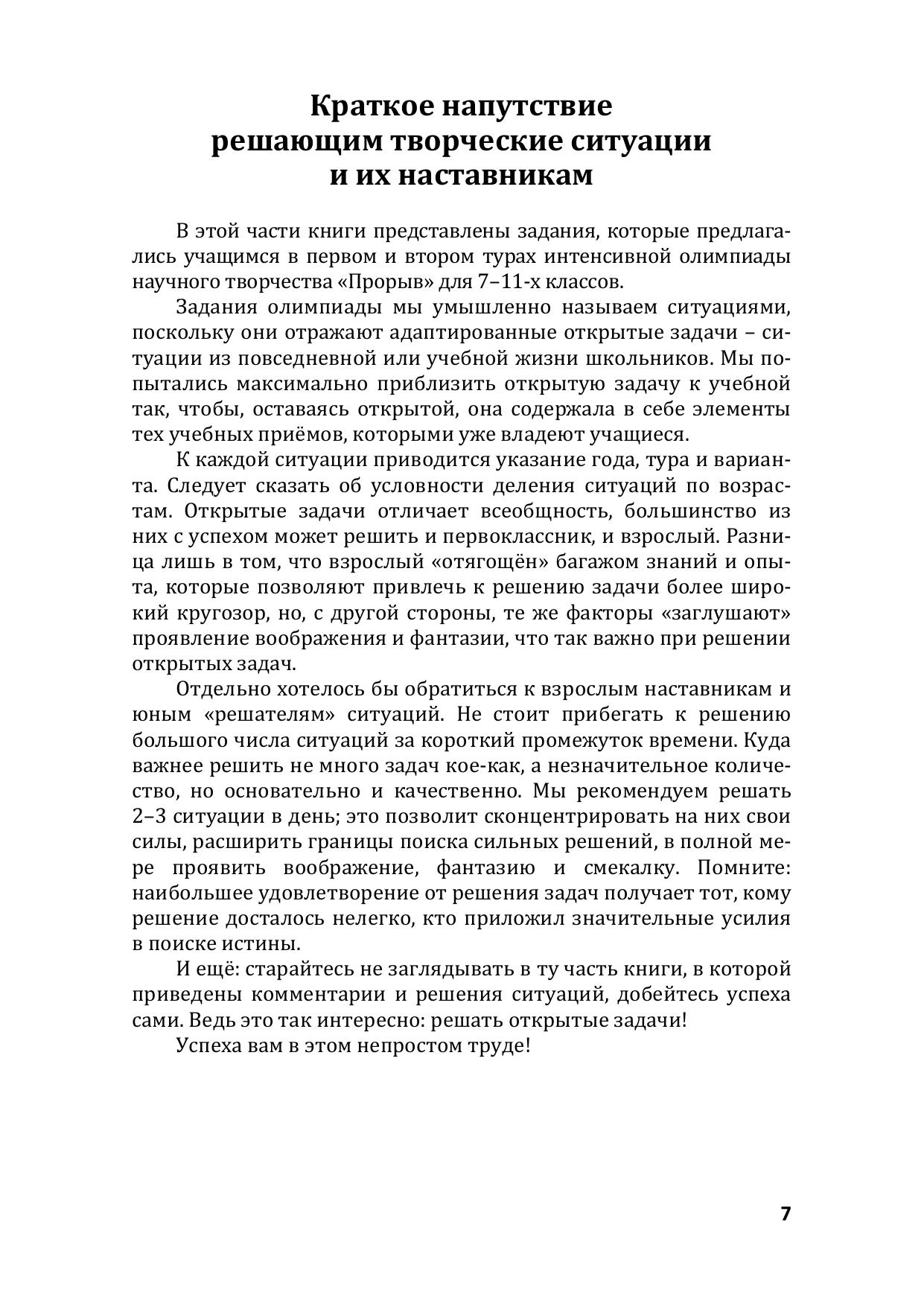 Учебно-методическое пособие обобщает и систематизирует опыт проведения авторами интенсивной олимпиады научного творчества «Прорыв» в 2009-2016 годах, основная часть заданий которой построена на теории открытых задач. В пособии приводятся все задания, предлагавшиеся на олимпиаде за эти восемь лет, контрольные ответы, комментарии и ответы учеников 5-11-х классов, принявших участие в конкурсном отборе. Учебно-методическое пособие может быть интересно учащимся средней школы, их учителям, наставникам и родителям, студентам, а также всем тем, кто хочет развить творческую составляющую своего мышления.