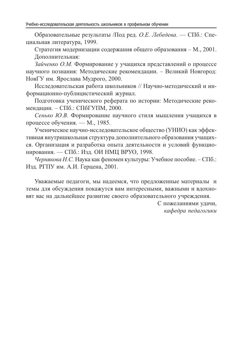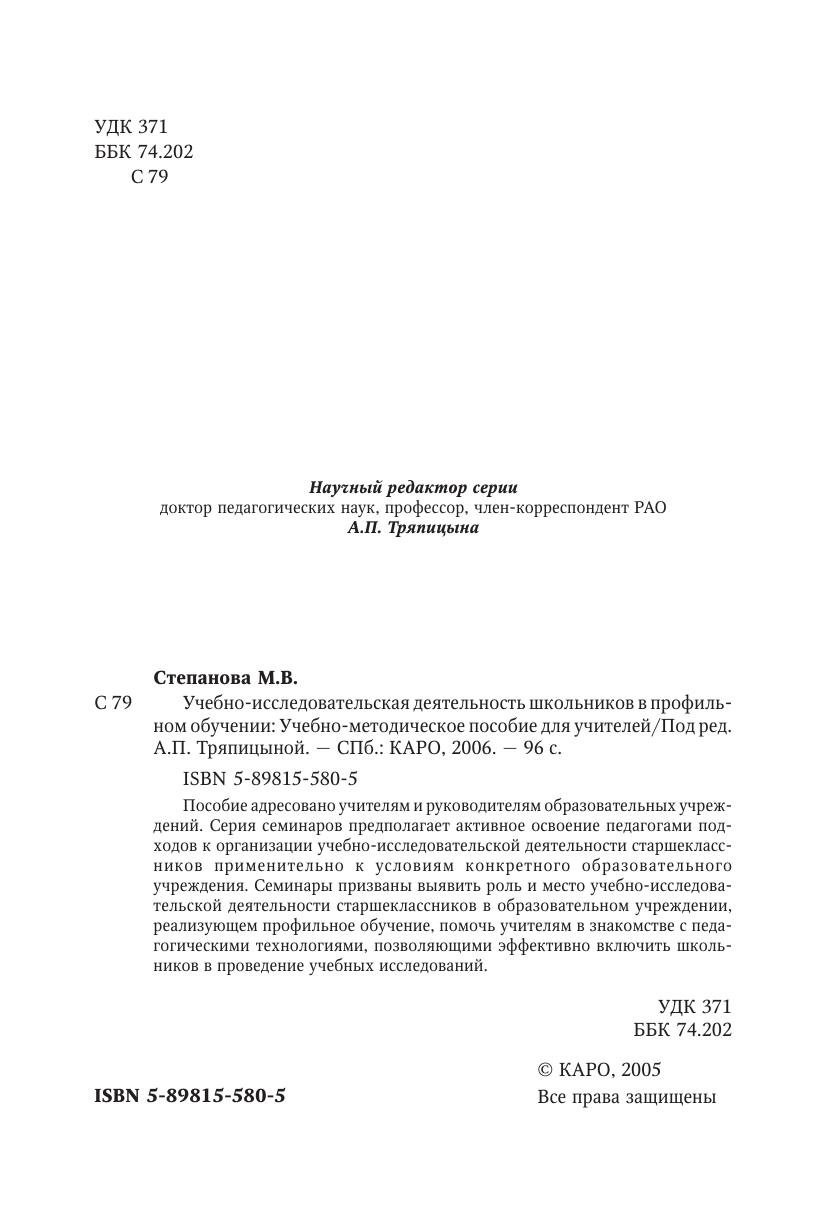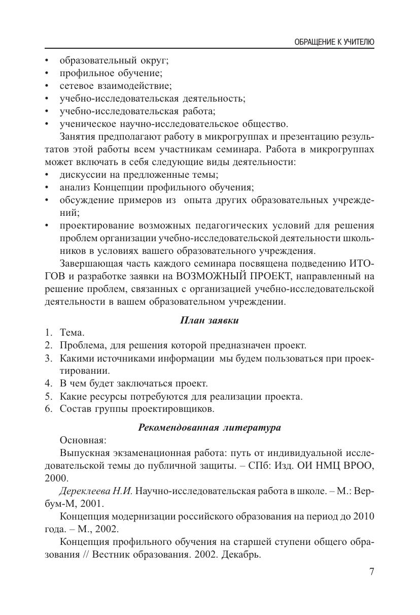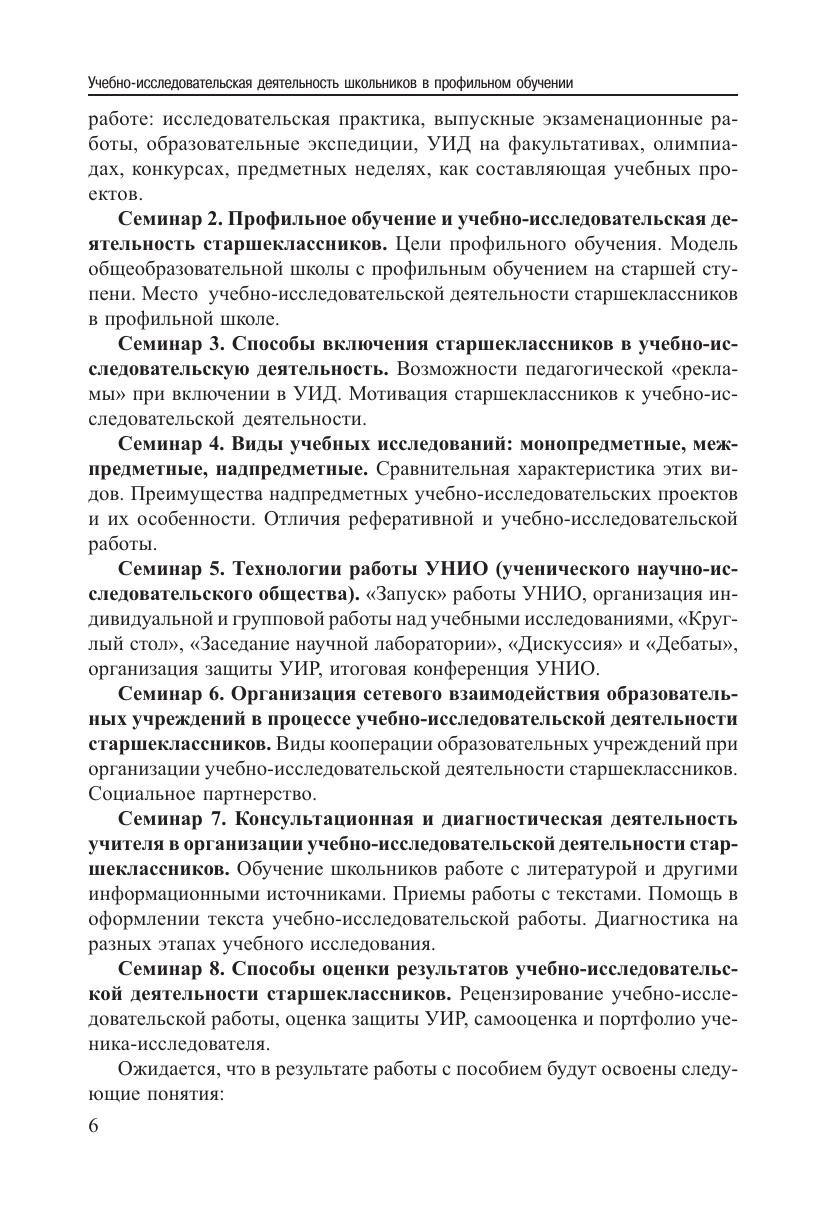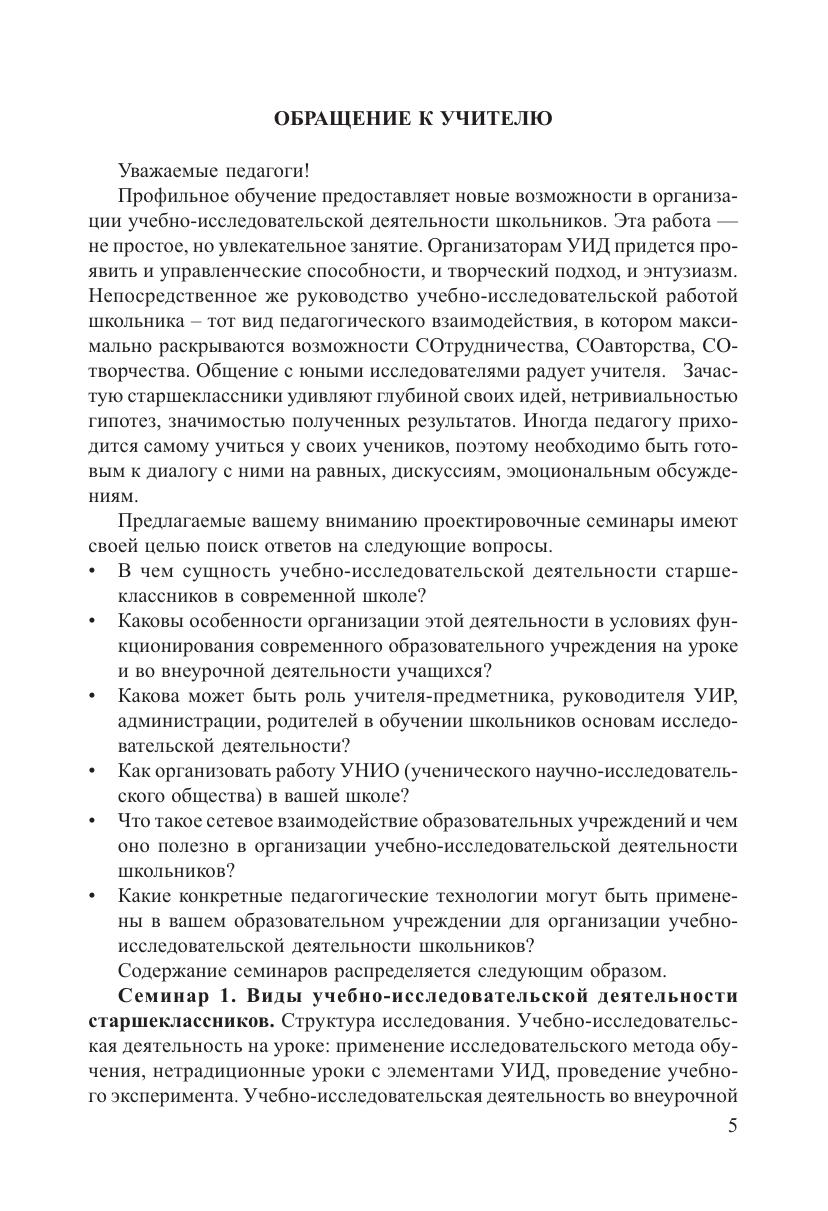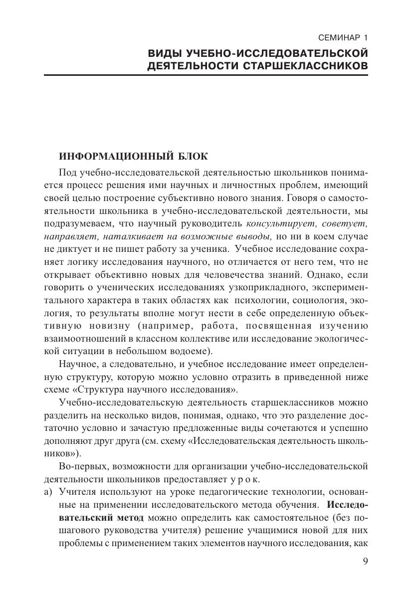 Пособие адресовано учителям и руководителям образовательных учреждений. Серия семинаров предполагает активное освоение педагогами подходов к организации учебно-исследовательской деятельности старшеклассников применительно к условиям конкретного образовательного учреждения. Семинары призваны выявить роль и место учебно-исследовательской деятельности старшеклассников в образовательном учреждении, реализующем профильное обучение, помочь учителям в знакомстве с педагогическими технологиями, позволяющими эффективно включить школьников в проведение учебных исследований.