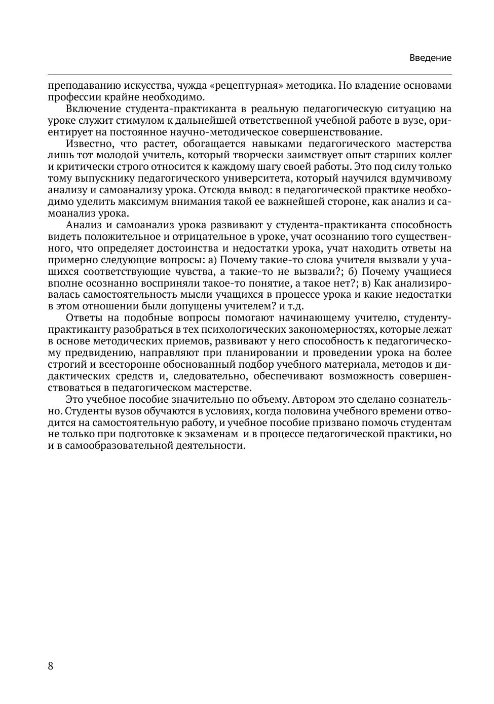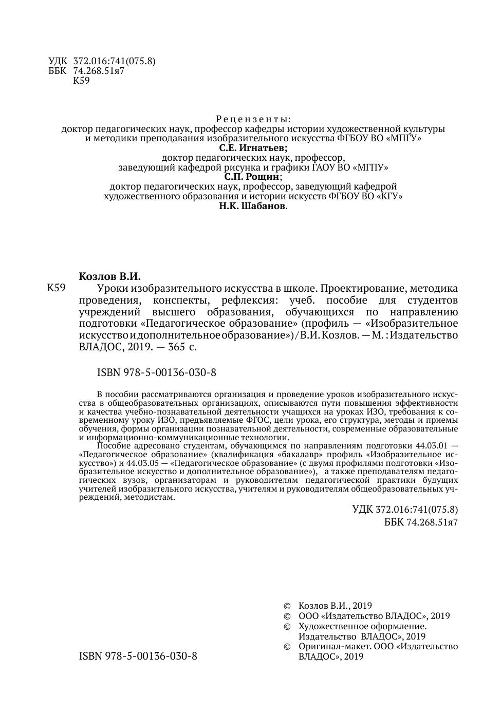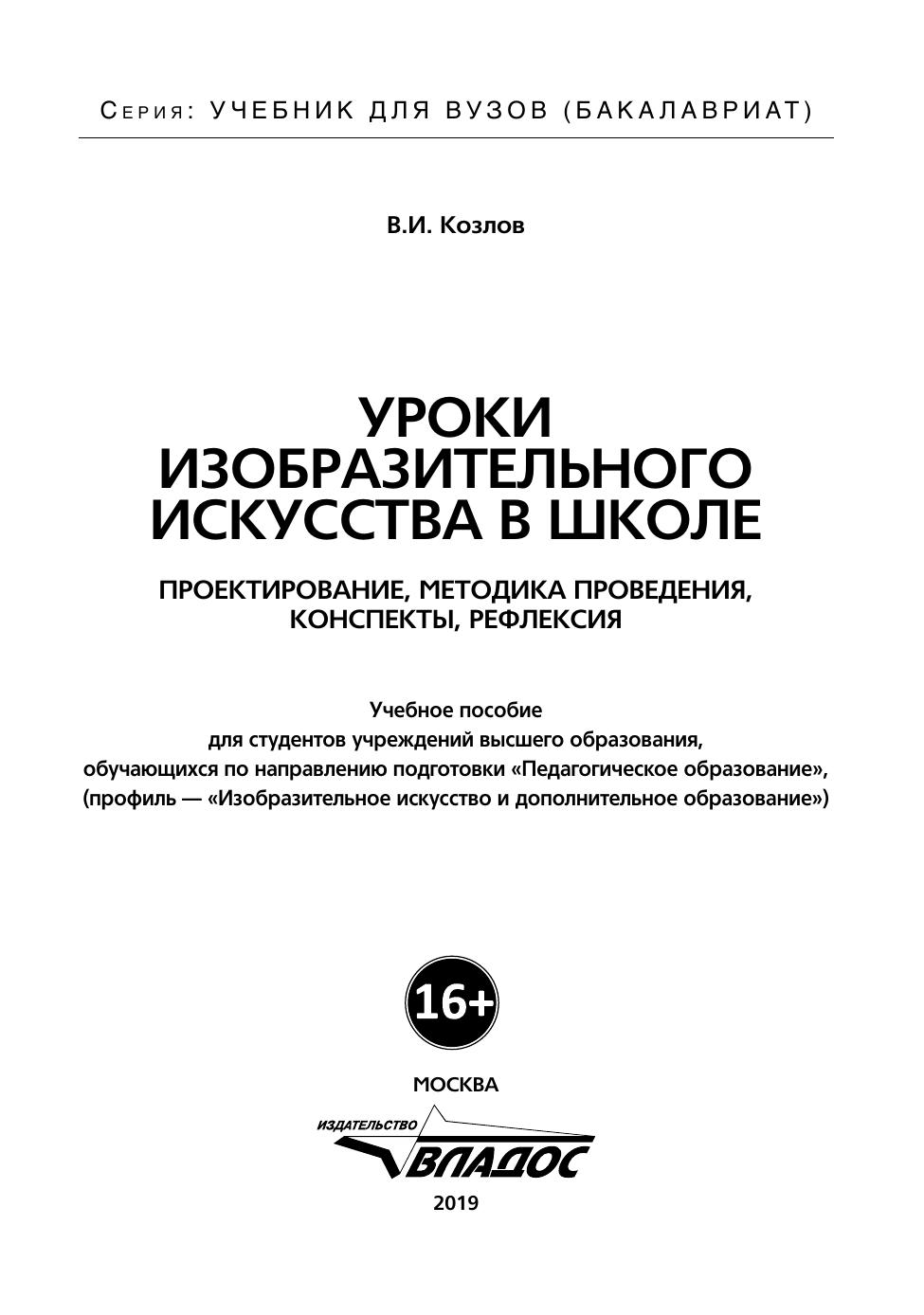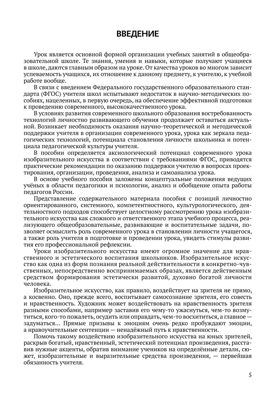 В пособии рассматриваются организация и проведение уроков изобразительного искусства в общеобразовательных организациях, описываются пути повышения эффективности и качества учебно-познавательной деятельности учащихся на уроках ИЗО, требования к современному уроку ИЗО, предъявляемые ФГОС, цели урока, его структура, методы и приемы обучения, формы организации познавательной деятельности, современные образовательные и информационно-коммуникационные технологии. Пособие адресовано студентам, обучающимся по направлениям подготовки 44.03.01 — «Педагогическое образование» (квалификация «бакалавр» профиль «Изобразительное искусство») и 44.03.05 — «Педагогическое образование» (с двумя профилями подготовки «Изобразительное искусство и дополнительное образование»), а также преподавателям педагогических вузов, организаторам и руководителям педагогической практики будущих учителей изобразительного искусства, учителям и руководителям общеобразовательных учреждений, методистам.