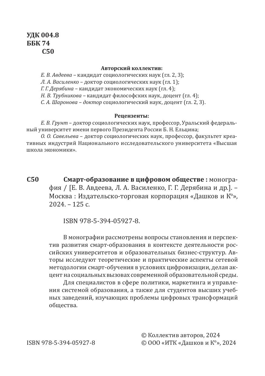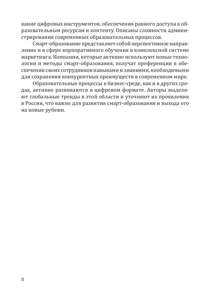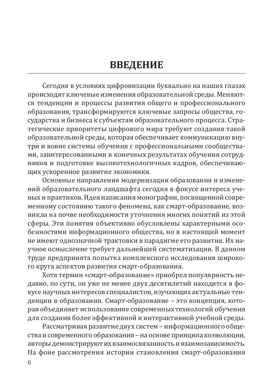 В монографии рассмотрены вопросы становления и перспектив развития смарт-образования в контексте деятельности российских университетов и образовательных бизнес-структур. Авторы исследуют теоретические и практические аспекты сетевой методологии смарт-обучения в условиях цифровизации, делая акцент на социальных вызовах современной образовательной среды.