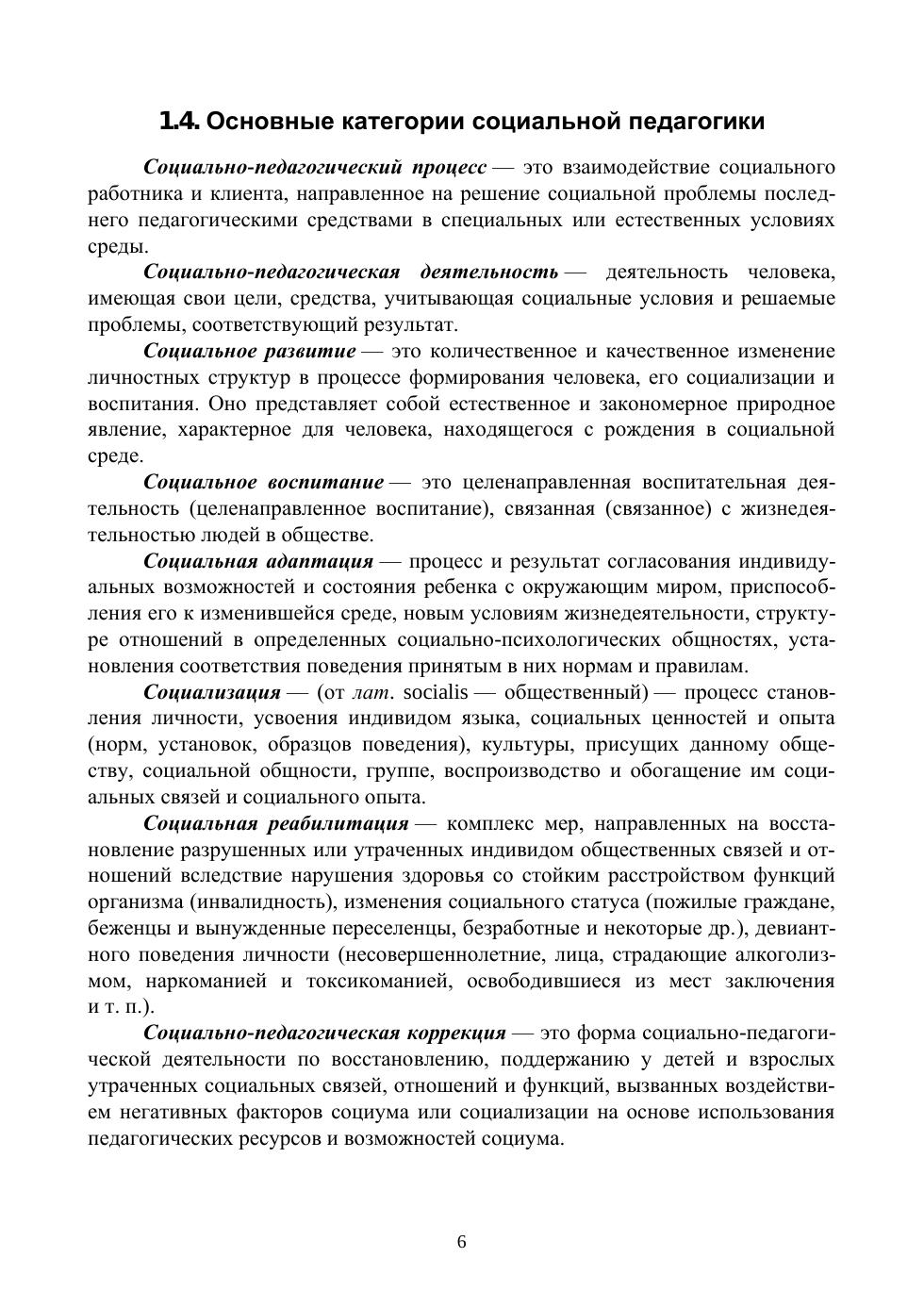 Учебный курс «Социальная педагогика» относится к базовой части дисциплин профессионального цикла подготовки педагогов. В пособии рассматриваются основные темы курса, такие как: социальная педагогика как наука, воспитание и социальное воспитание, социализация как социально-педагогическое явление, современная семья и ее проблемы, социально-педагогическая деятельность с детьми сиротами и детьми, оставшимися без попечения родителей, профессиональная деятельность социального педагога. Настоящее пособие может использоваться для самостоятельной работы студентов как иллюстративный материал к теоретическим лекциям и семинарским занятиям, как концентрированное изложение самой сути дисциплины при подготовке к экзамену, а также в условиях дистанционного обучения. Соответствует современным требованиям Федерального государственного образовательного стандарта среднего профессионального образования и профессиональным квалификационным требованиям. Предлагаемое учебное пособие предназначено для студентов профессиональных образовательных организаций, а также может быть полезно преподавателям этой дисциплины и практическим работникам воспитательной и образовательной сферы.