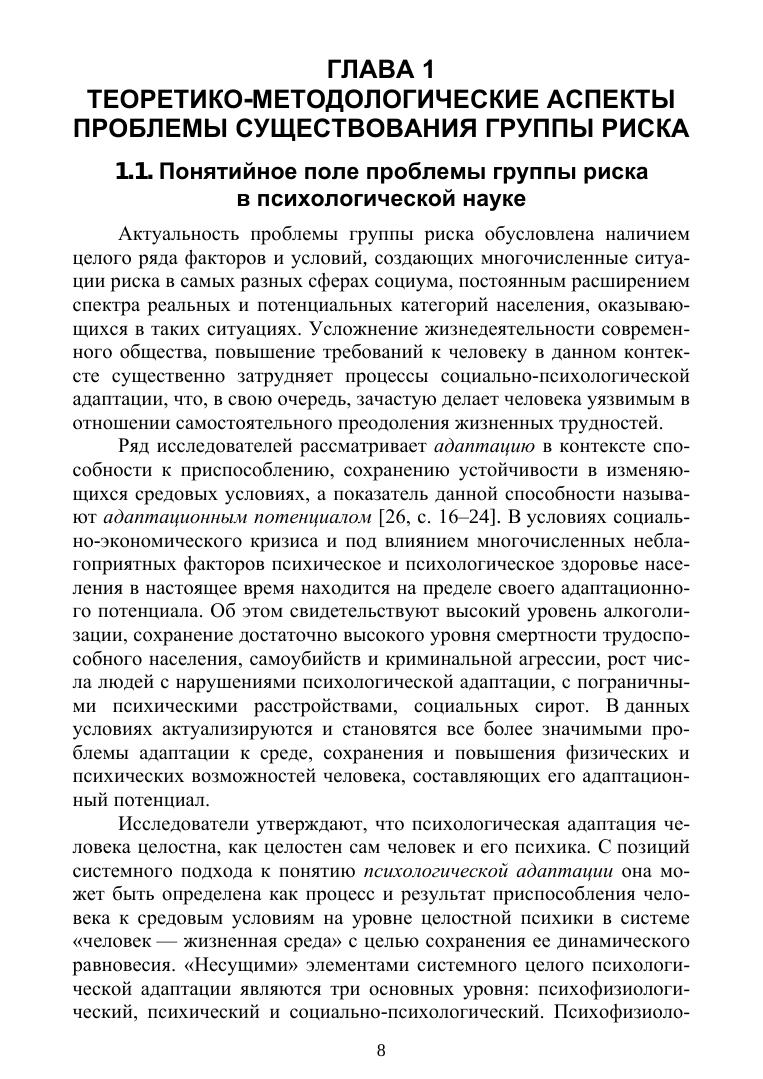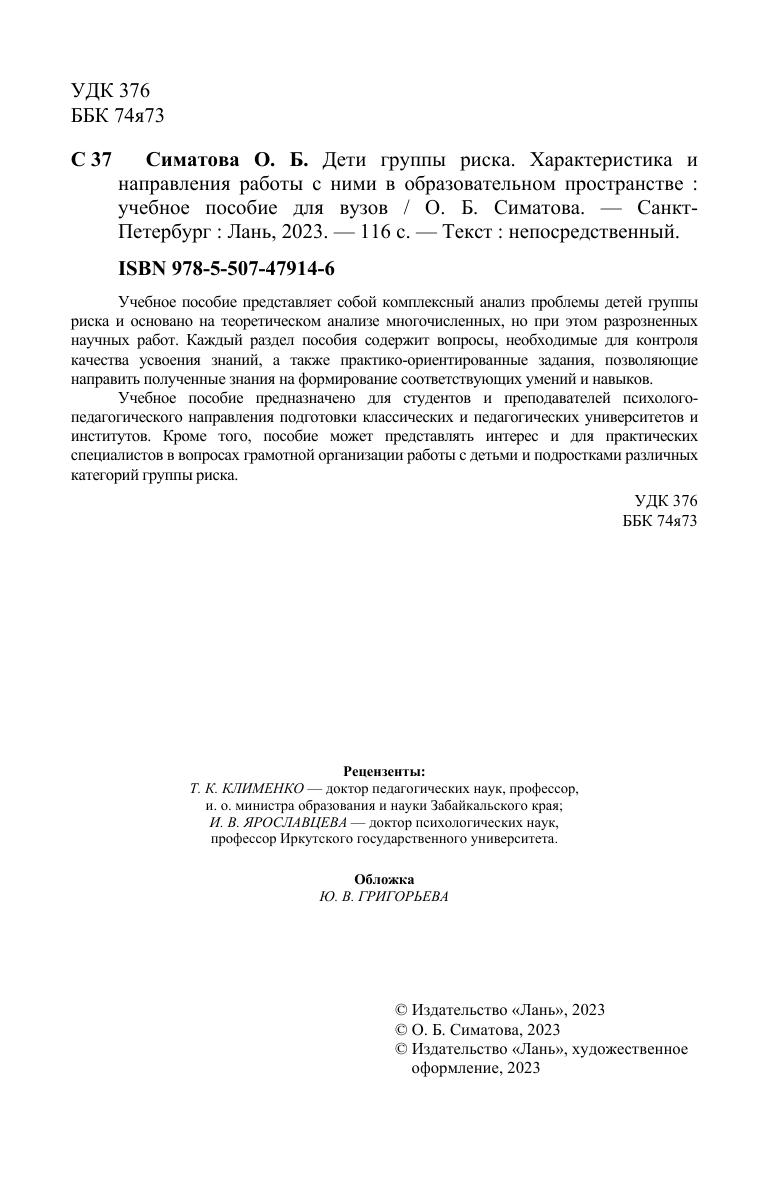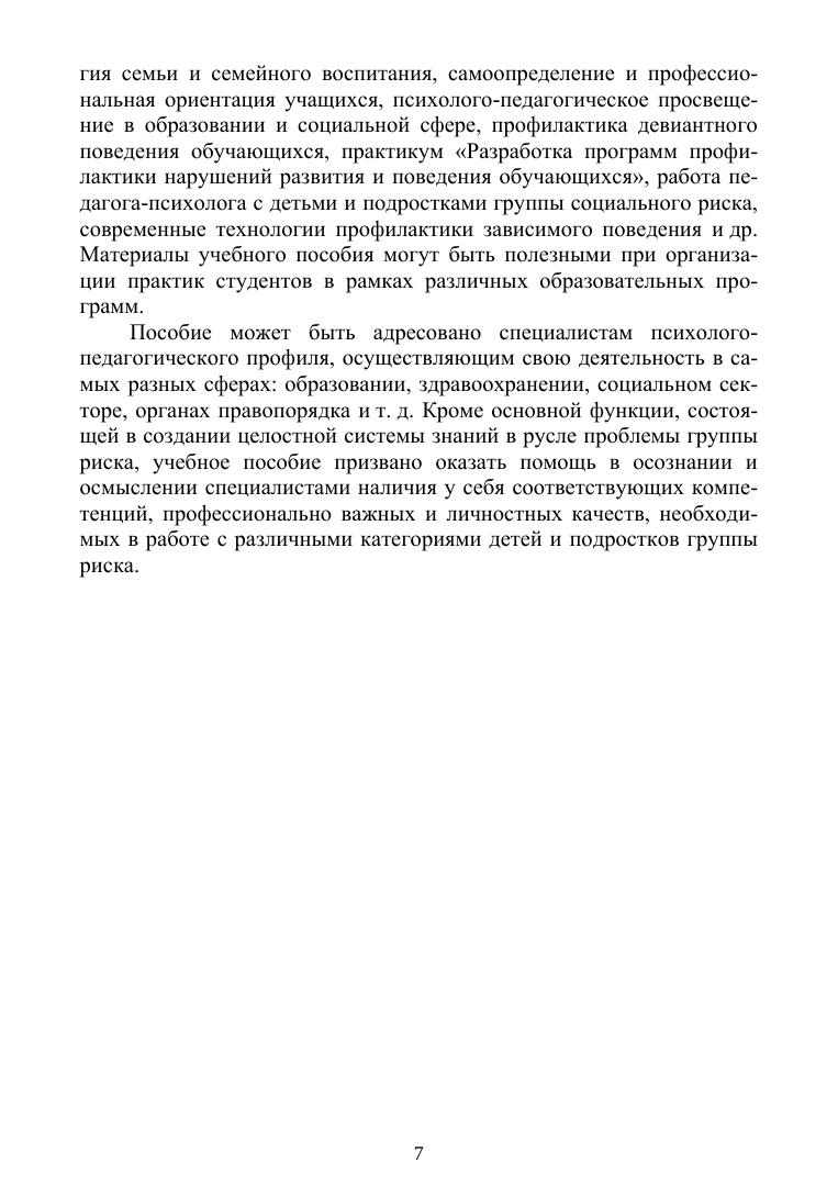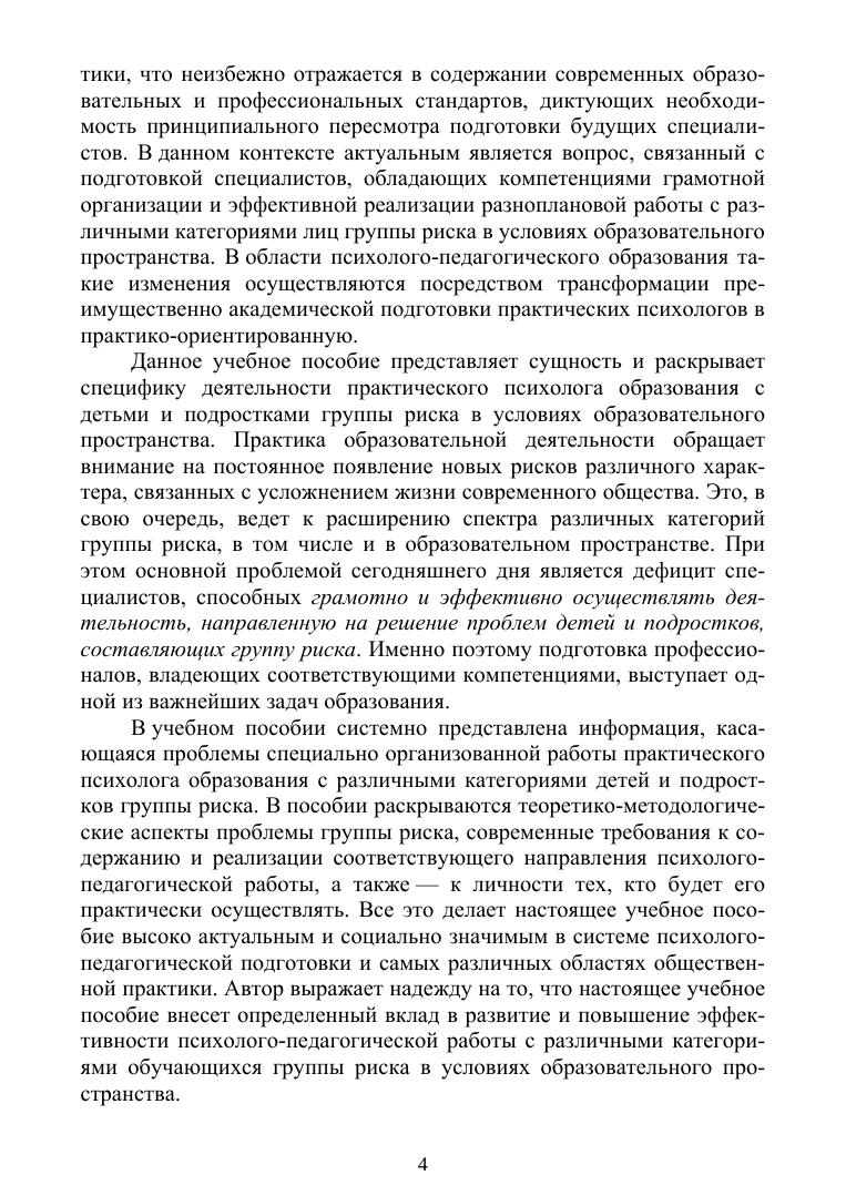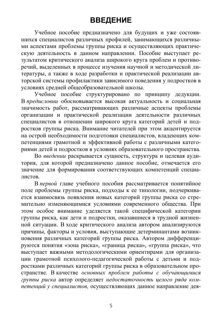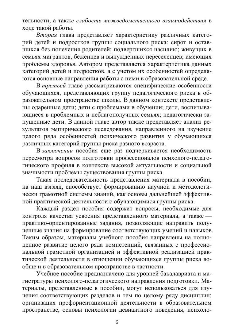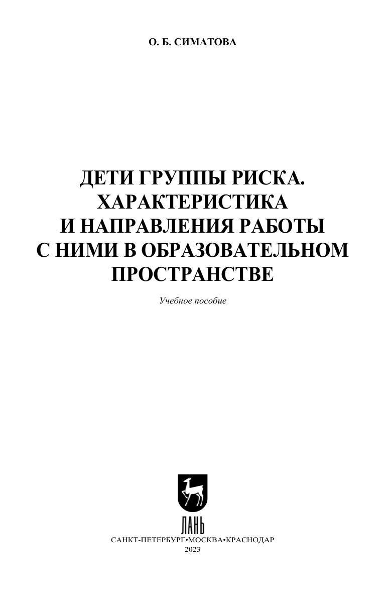 Учебное пособие представляет собой комплексный анализ проблемы детей группы риска и основано на теоретическом анализе многочисленных, но при этом разрозненных научных работ. Каждый раздел пособия содержит вопросы, необходимые для контроля качества усвоения знаний, а также практико-ориентированные задания, позволяющие направить полученные знания на формирование соответствующих умений и навыков. Учебное пособие предназначено для студентов и преподавателей психолого-педагогического направления подготовки классических и педагогических университетов и институтов. Кроме того, пособие может представлять интерес и для практических специалистов в вопросах грамотной организации работы с детьми и подростками различных категорий группы риска.