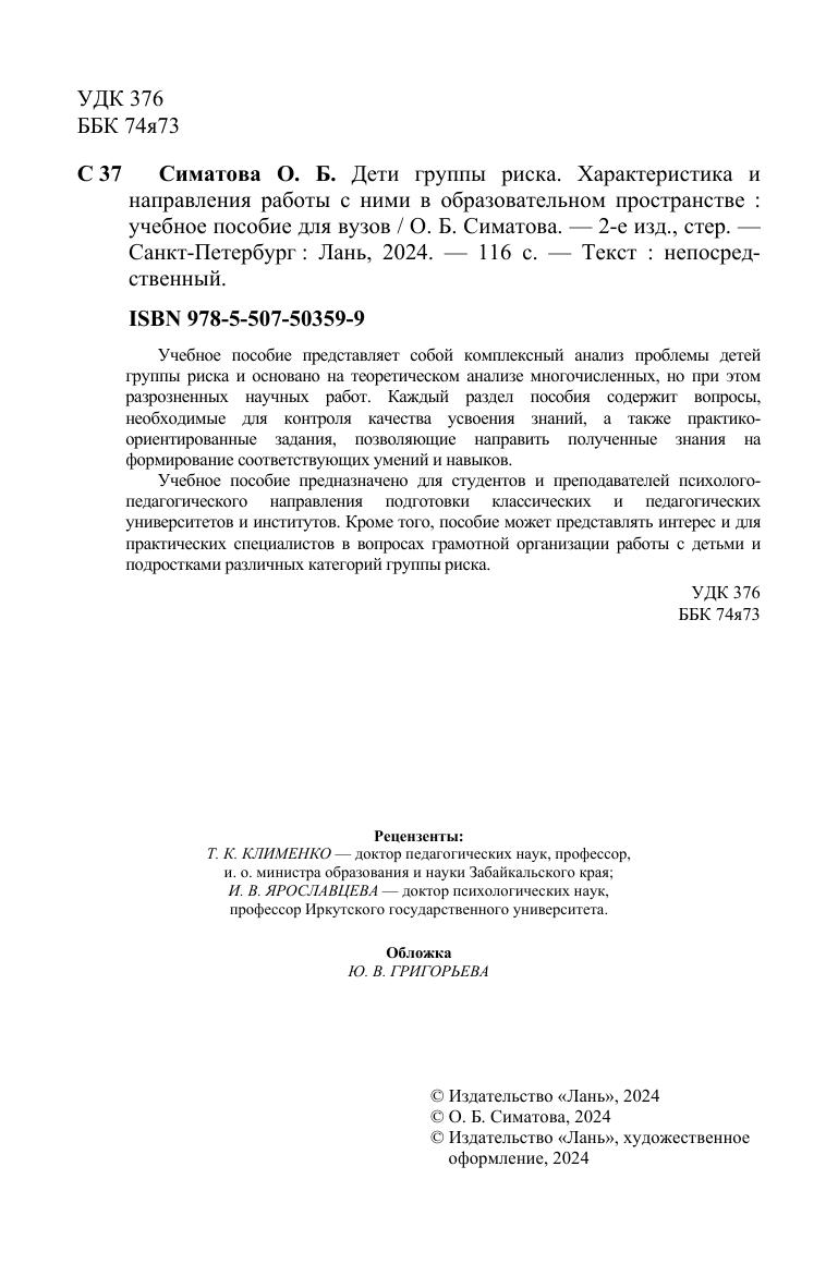 Учебное пособие представляет собой комплексный анализ проблемы детей группы риска и основано на теоретическом анализе многочисленных, но при этом разрозненных научных работ. Каждый раздел пособия содержит вопросы, необходимые для контроля качества усвоения знаний, а также практико-ориентированные задания, позволяющие направить полученные знания на формирование соответствующих умений и навыков. Учебное пособие предназначено для студентов и преподавателей психолого-педагогического направления подготовки классических и педагогических университетов и институтов. Кроме того, пособие может представлять интерес и для практических специалистов в вопросах грамотной организации работы с детьми и подростками различных категорий группы риска.