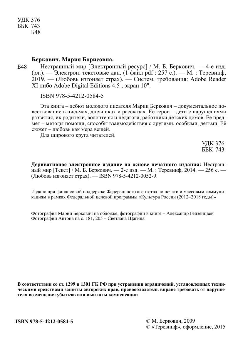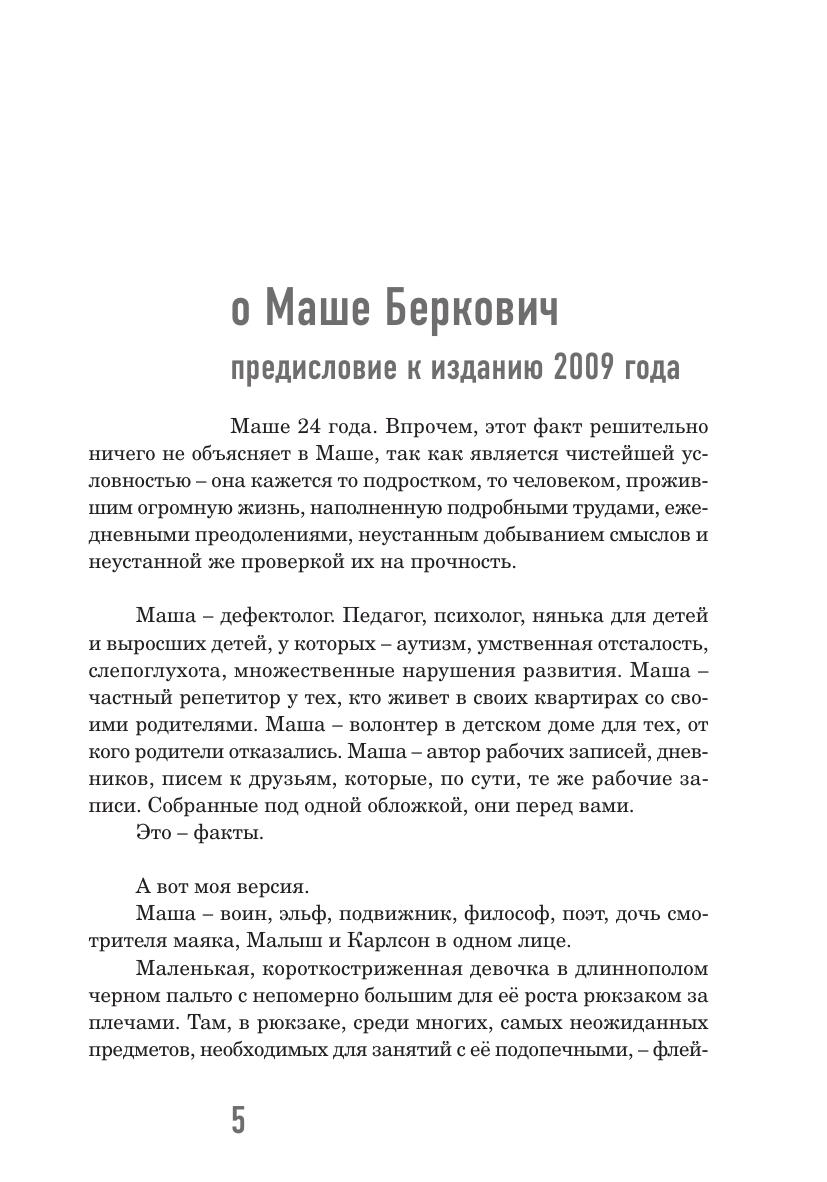 Эта книга — дебют молодого писателя Марии Беркович — документальное повествование в письмах, дневниках и рассказах. Ее герои — дети с нарушениями развития, их родители, волонтеры и педагоги, работники детских домов. Ее предмет — методы помощи, способы взаимодействия с другими, особыми детьми. Ее сюжет — любовь как мера вещей.