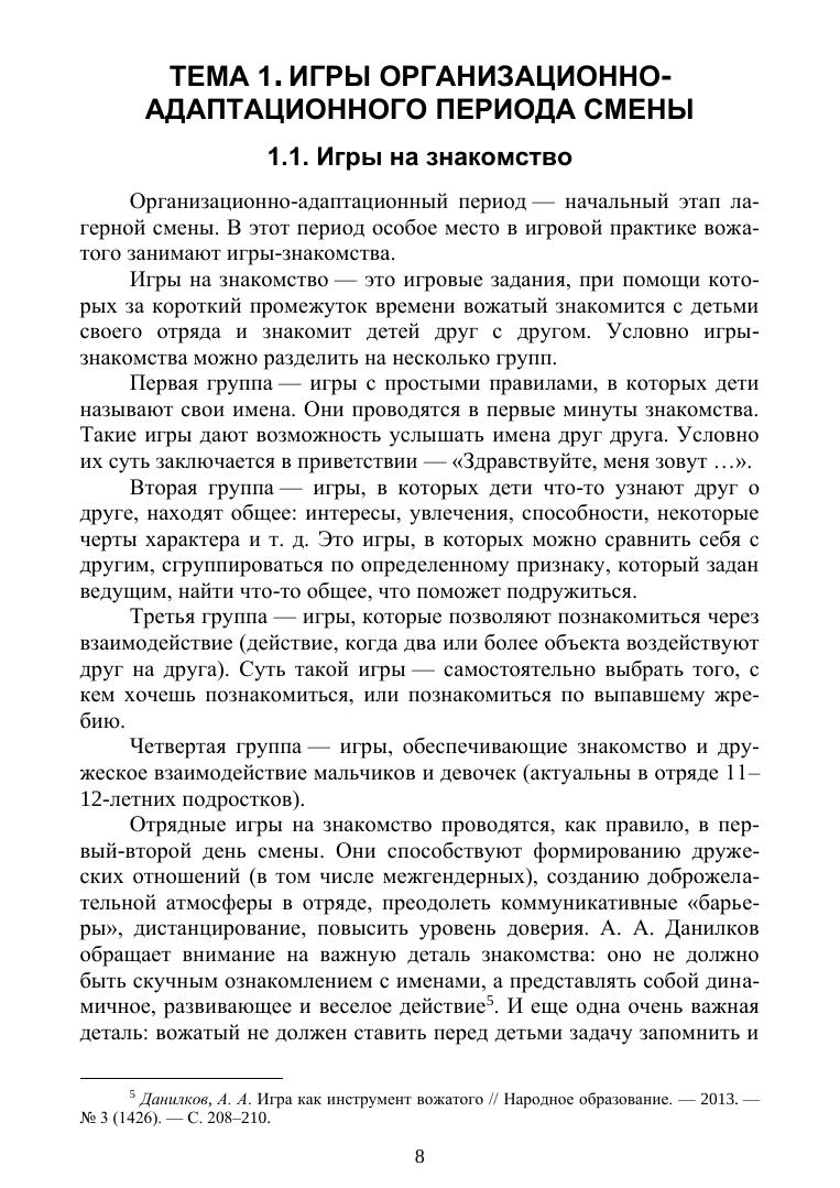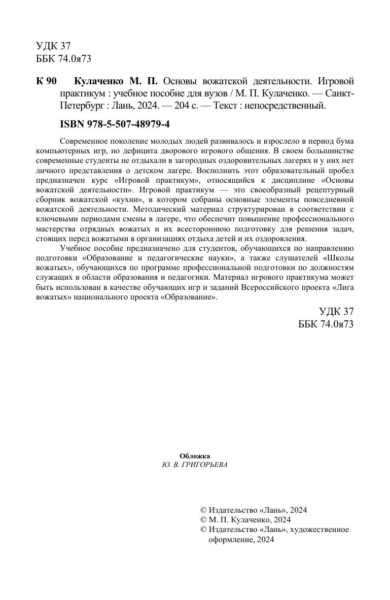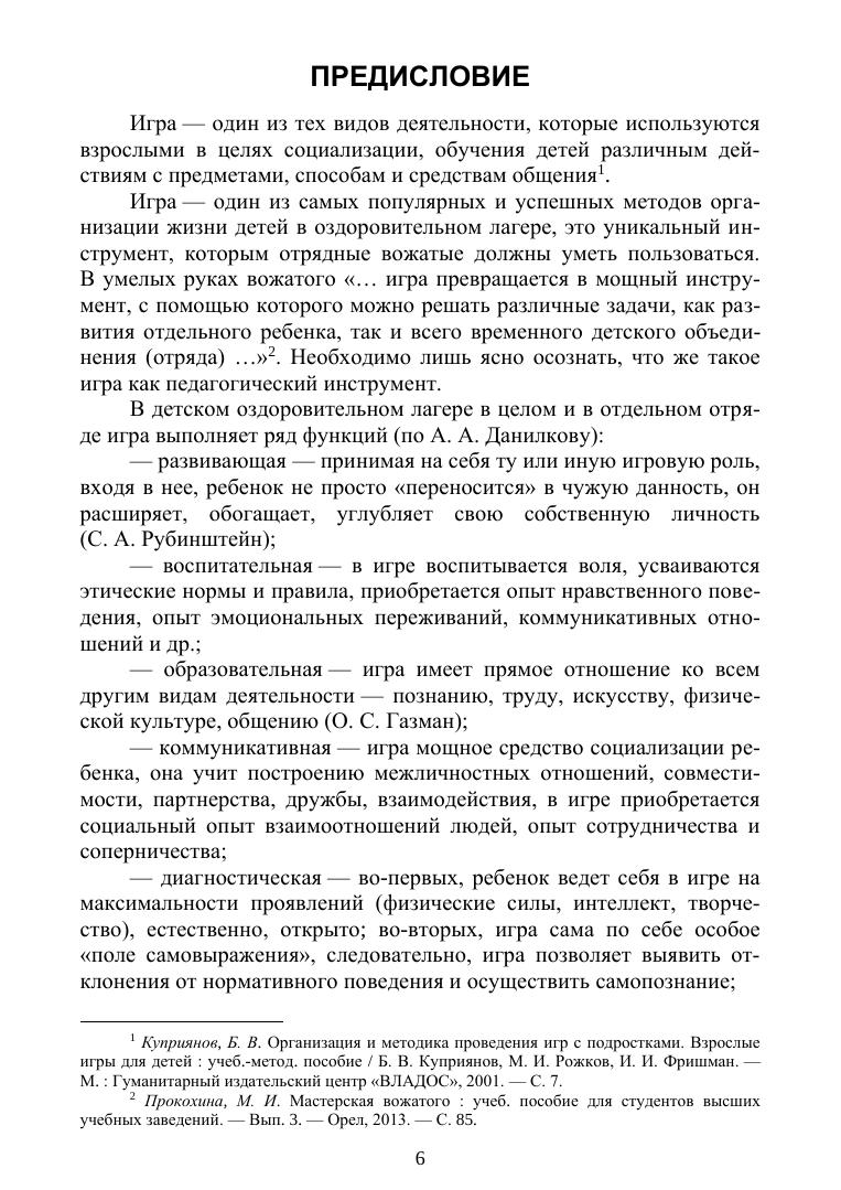 Современное поколение молодых людей развивалось и взрослело в период бума компьютерных игр, но дефицита дворового игрового общения. В своем большинстве современные студенты не отдыхали в загородных оздоровительных лагерях и у них нет личного представления о детском лагере. Восполнить этот образовательный пробел предназначен курс «Игровой практикум», относящийся к дисциплине «Основы вожатской деятельности». Игровой практикум — это своеобразный рецептурный сборник вожатской «кухни», в котором собраны основные элементы повседневной вожатской деятельности. Методический материал структурирован в соответствии с ключевыми периодами смены в лагере, что обеспечит повышение профессионального мастерства отрядных вожатых и их всестороннюю подготовку для решения задач, стоящих перед вожатыми в организациях отдыха детей и их оздоровления. Учебное пособие предназначено для студентов, обучающихся по направлению подготовки «Образование и педагогические науки», а также слушателей «Школы вожатых», обучающихся по программе профессиональной подготовки по должностям служащих в области образования и педагогики. Материал игрового практикума может быть использован в качестве обучающих игр и заданий Всероссийского проекта «Лига вожатых» национального проекта «Образование».