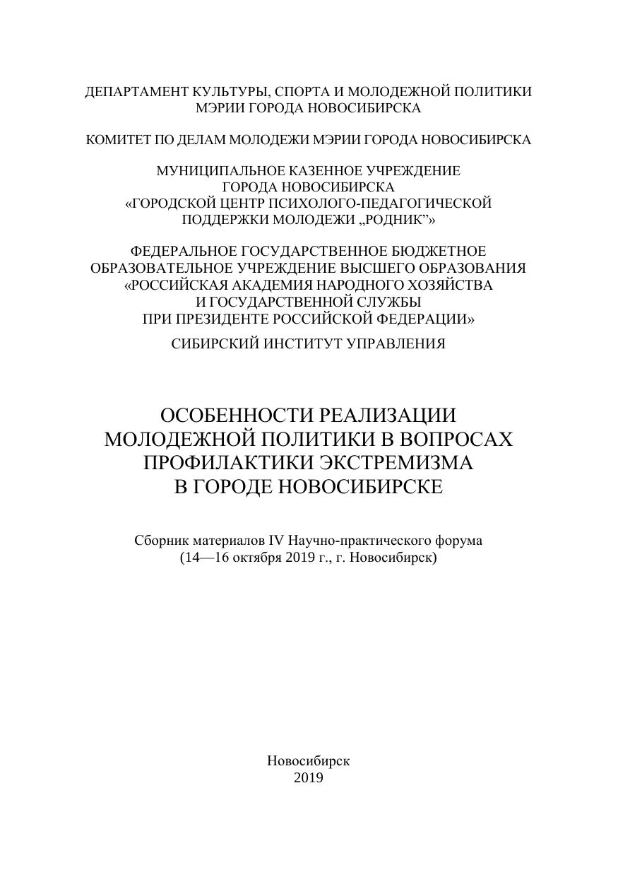 Особенности реализации молодежной политики в вопросах профилактики экстремизма в городе Новосибирске: сб. материалов IV Науч.-практ. форума, 14—16 окт. 2019 г., г. Новосибирск