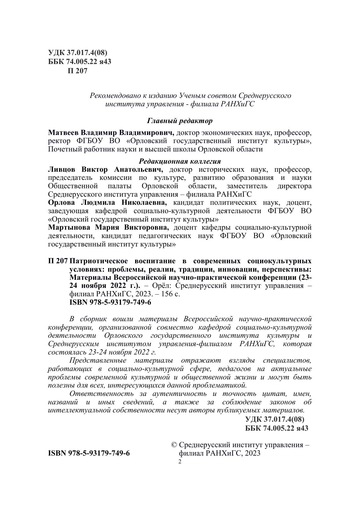 В сборник вошли материалы Всероссийской научно-практической конференции, организованной совместно кафедрой социально-культурной деятельности Орловского государственного института культуры и Среднерусским институтом управления-филиалом РАНХиГС, которая состоялась 23-24 ноября 2022 г. Представленные материалы отражают взгляды специалистов, работающих в социально-культурной сфере, педагогов на актуальные проблемы современной культурной и общественной жизни и могут быть полезны для всех, интересующихся данной проблематикой. Ответственность за аутентичность и точность цитат, имен, названий и иных сведений, а также за соблюдение законов об интеллектуальной собственности несут авторы публикуемых материалов.