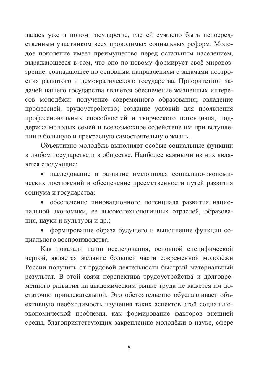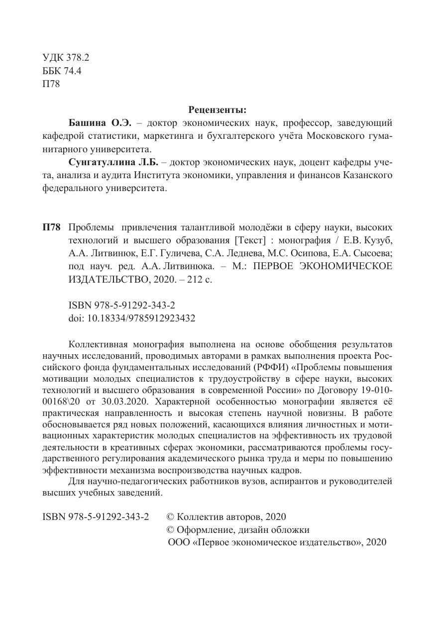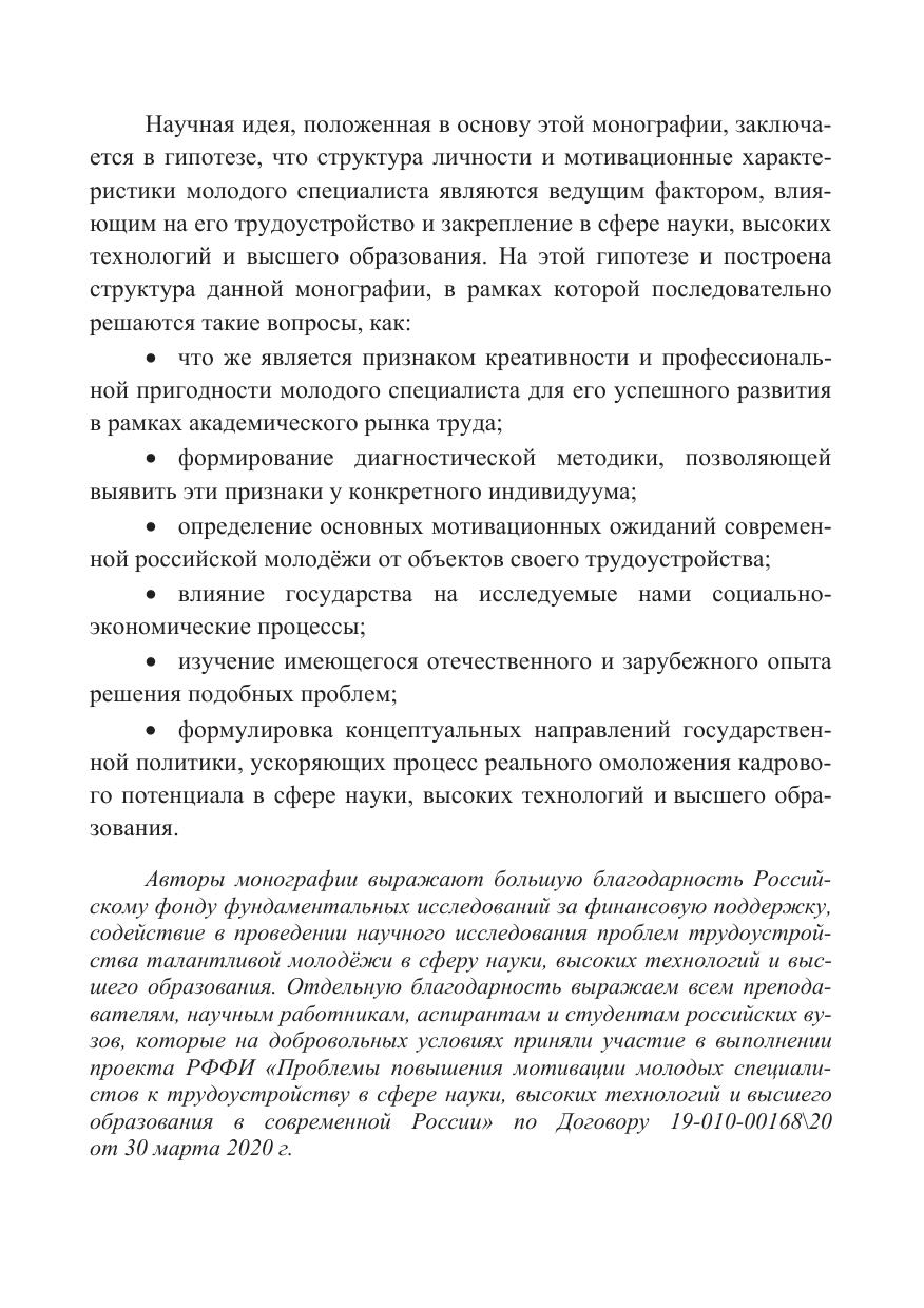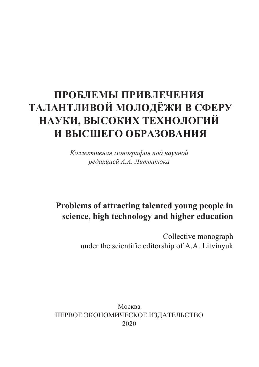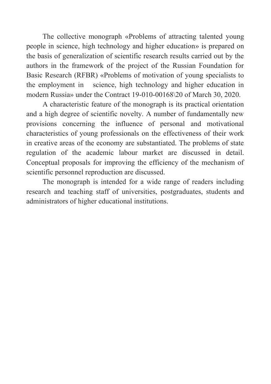 Монография «Проблемы привлечения талантливой молодёжи в сферу наук, высоких технологий и высшего образования» выполнена на основе обобщения результатов научных исследований, проводимых авторами в рамках выполнения проекта Российского фонда фундаментальных исследований (РФФИ) «Проблемы повышения мотивации молодых специалистов к трудоустройству в сфере науки, высоких технологий и высшего образования в современной России» по Договору 19-010-00168\20 от «30» марта 2020 г. Характерной особенностью монографии является её практическая направленность и высокая степень научной новизны. В работе обосновывается целый ряд принципиально новых положений, касающихся влияния личностных и мотивационных характеристик молодых специалистов на эффективность их трудовой деятельности в креативных сферах экономики, подробно рассматриваются проблемы государственного регулирования академического рынка труда, формулируются концептуальные предложения по повышению эффективности механизма воспроизводства научных кадров и др. Монография рассчитана на широкий круг читателей: научно-педагогических работников вузов, аспирантов, студентов и администраторов высших учебных заведений.