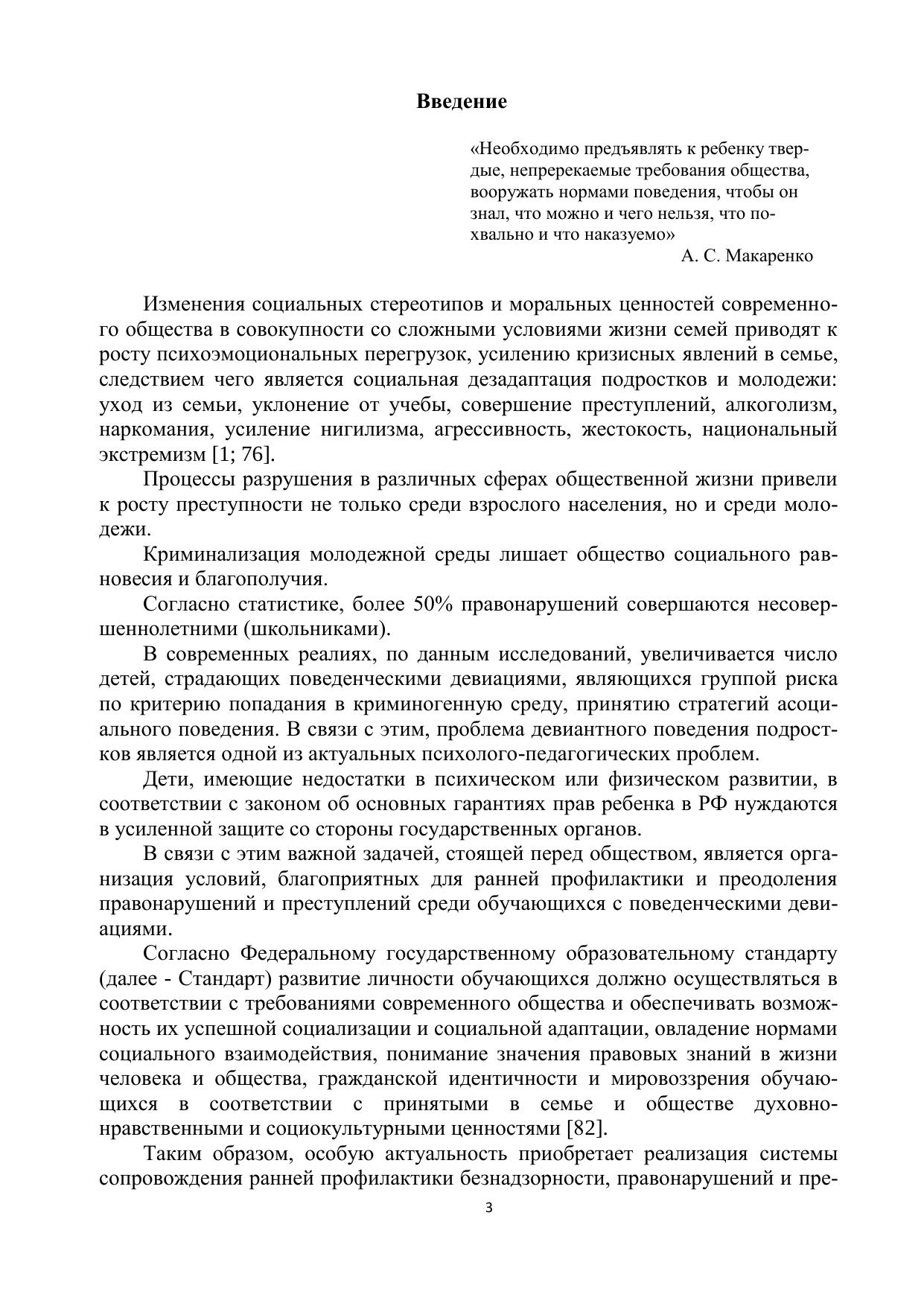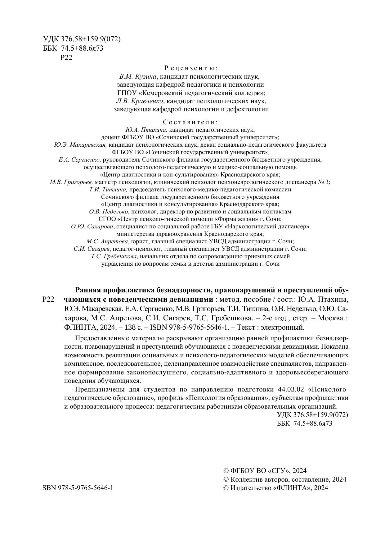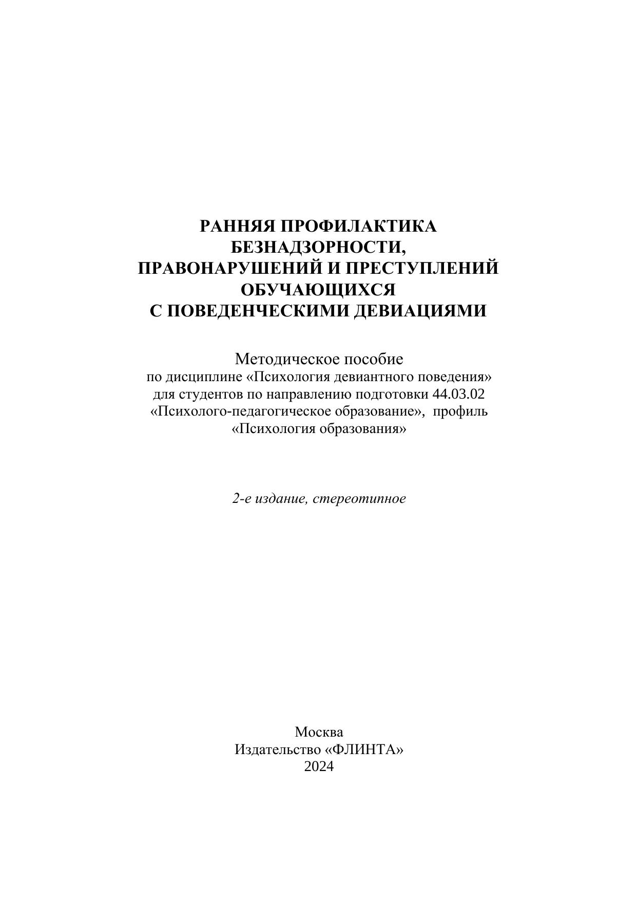 Предоставленные материалы раскрывают организацию ранней профилактики безнадзорности, правонарушений и преступлений обучающихся с поведенческими девиациями. Показана возможность реализации социальных и психолого-педагогических моделей обеспечивающих комплексное, последовательное, целенаправленное взаимодействие специалистов, направленное формирование законопослушного, социально-адаптивного и здоровьесберегающего поведения обучающихся. Пособие предназначено для студентов, обучающихся по направлению подготовки 44.03.02 «Психолого-педагогическое образование», профиль «Психология образования»; субъектам профилактики и образовательного процесса: педагогическим работникам образовательных организаций.