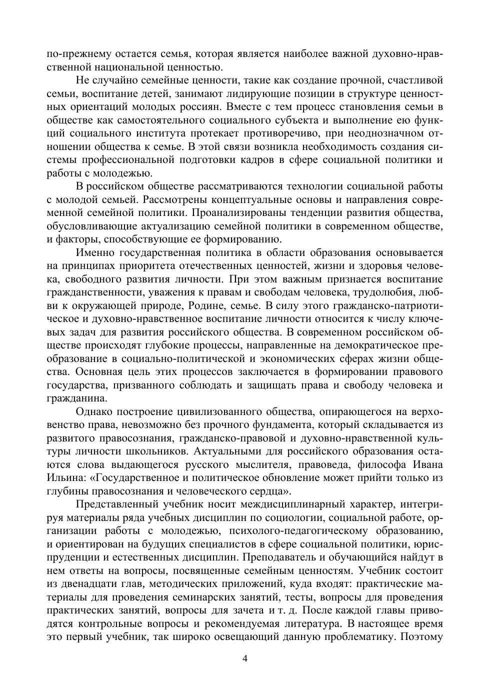 Учебник предназначен для использования в преподавании следующих дисциплин: «Семейная педагогика и семьеведение», «Семейное консультирование», «Семейное право». В нем исследуется роль семейных и духовно-нравственных ценностей в вос-питании молодого поколения, показана значимость семейных ценностей в дошколь-ном, школьном и студенческом обучении и воспитании. Методическая составляющая поможет преподавателям в создании условий для ценностного самоопределения и со-циализации обучающихся. После каждой главы имеются контрольные вопросы и спи-сок литературы для подготовки к семинарским занятиям, в приложениях имеются глоссарий, вопросы для проведения зачета по дисциплине, материалы для группового обсуждения. Учебник предназначен для студентов и преподавателей вузов педагогической направленности, но может быть адресован широкому кругу специалистов — педаго-гам дополнительного образования, практическим психологам, сотрудникам право-охранительных органов, работающих с несовершеннолетними и их родителями, и всем, кого интересует семья как базовая ценность социальной и личной жизни челове-ка.