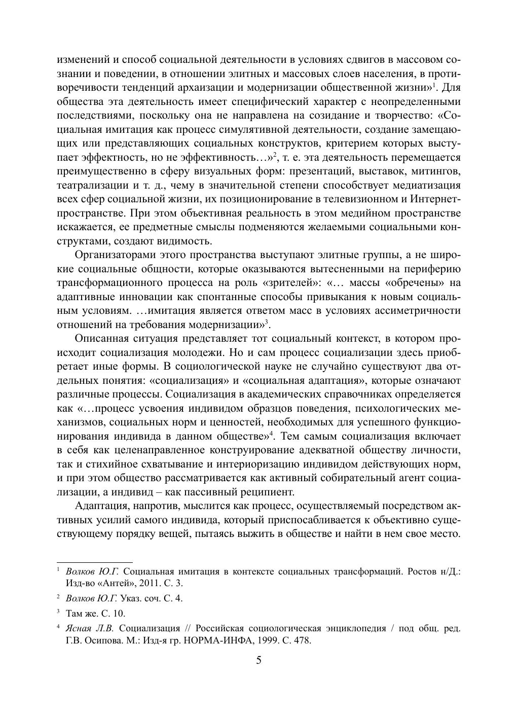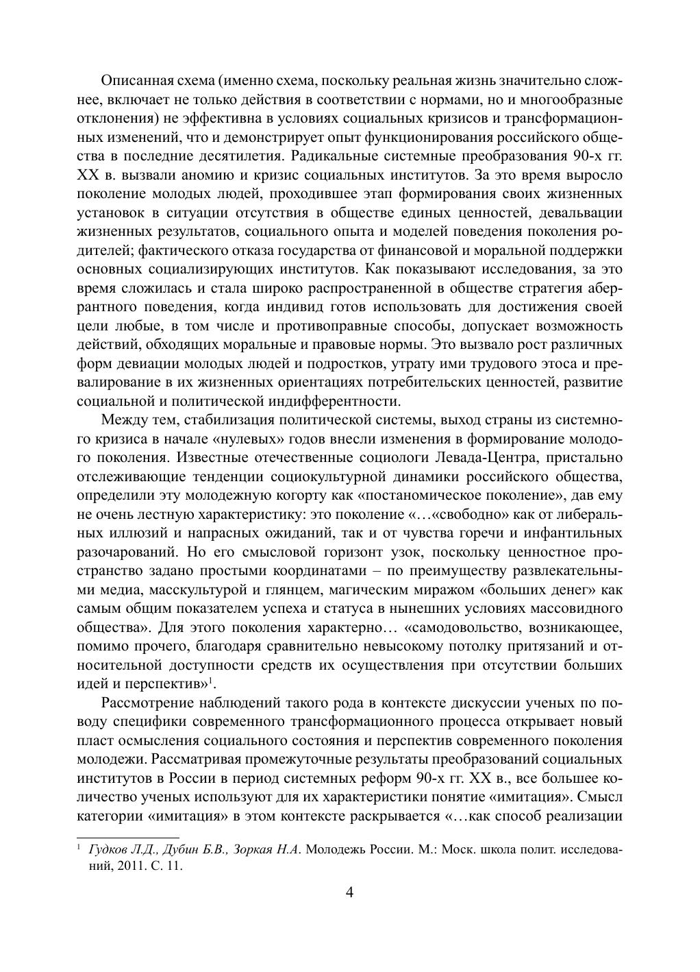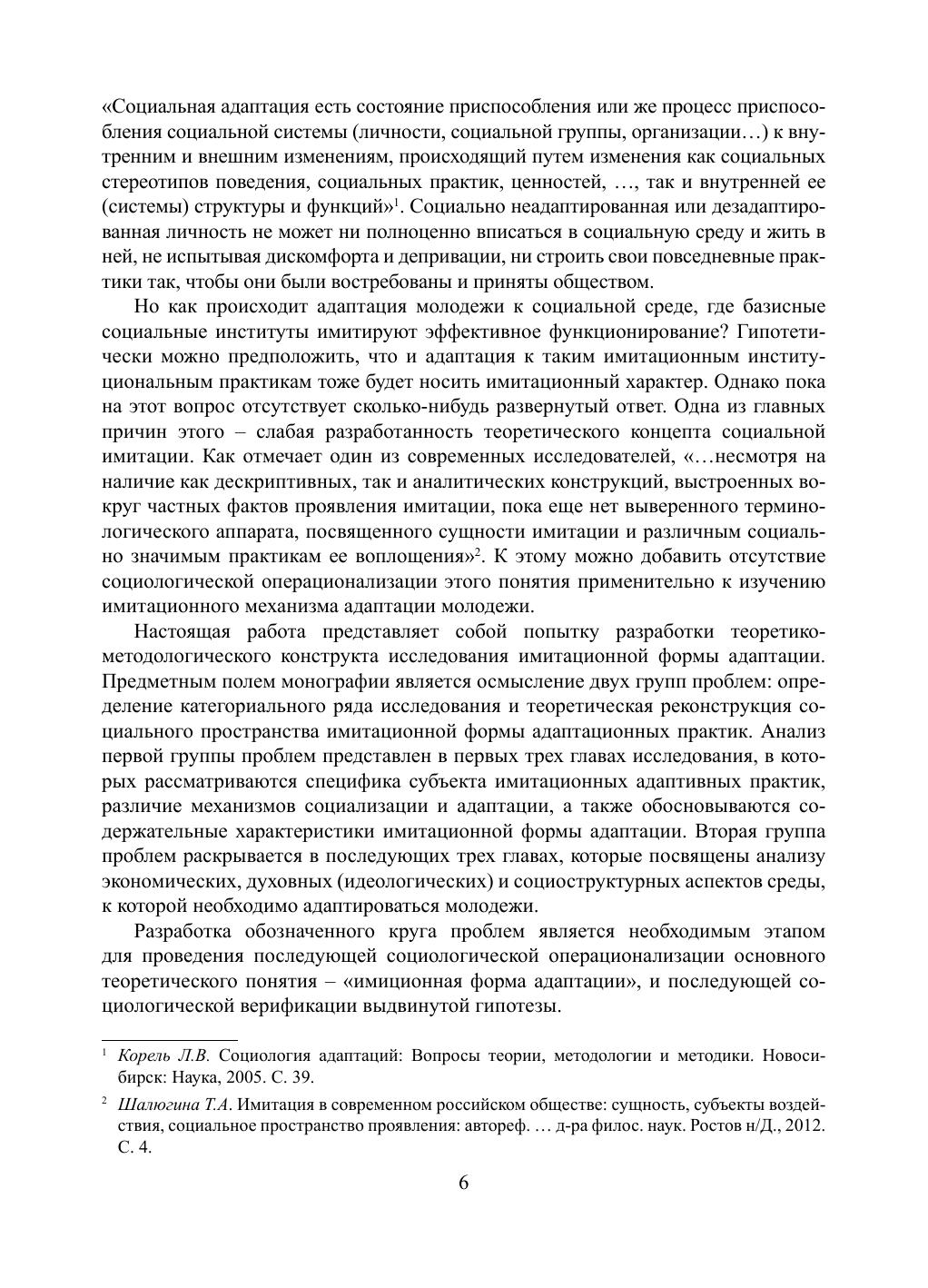 Монография посвящена анализу имитации как форме адаптации молодежи к социальной среде современного российского общества. Автор разрабатывает категориальный аппарат социологического изучения имитационного поведения, обосновывает введение понятия «имитация-симулякр» для обозначения специфической модели адаптационного поведения и осуществляет теоретическую реконструкцию социальной среды, обусловливающей эту форму адаптации. Предназначена для специалистов в области социологии и гуманитарных наук, студентов и аспирантов, а также всех интересующихся данной проблематикой.