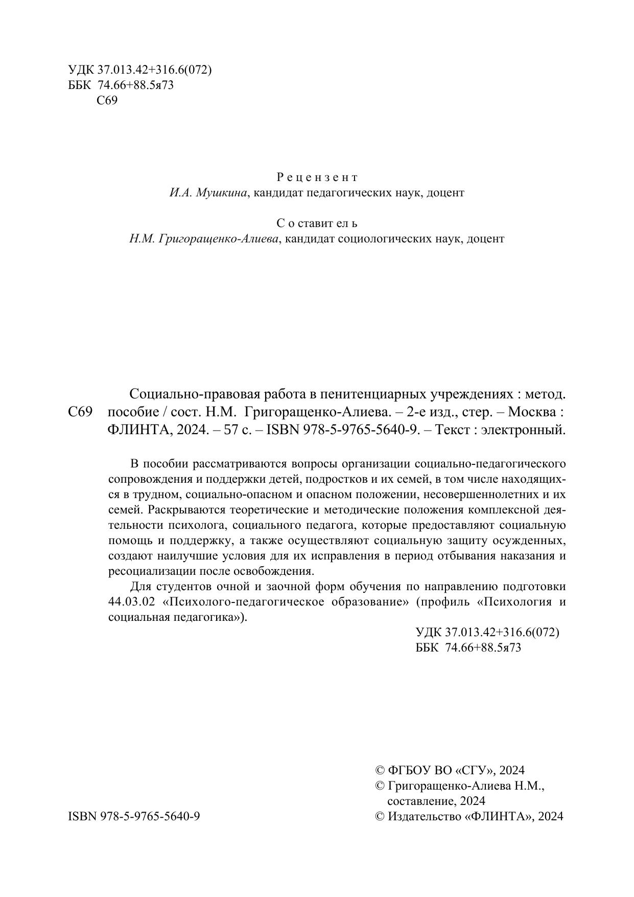 В пособии рассматриваются вопросы организации социально-педагогического сопровождения иподдержки детей, подростков и их семей, в том числе находящихся в трудном, социально-опасном и опасном положении, несовершеннолетних и их семей. Раскрываются теоретические и методические положения комплексной деятельности психолога, социального педагога, которые предоставляют социальную помощь и поддержку, а также осуществляют социальную защиту осужденных, создают наилучшие условия для их исправления в период отбывания наказания и ресоциализации после освобождения. Для студентов очной и заочной форм обучения по направлению подготовки 44.03.02 «Психолого-педагогическое образование» (профиль «Психология и социальная педагогика»).