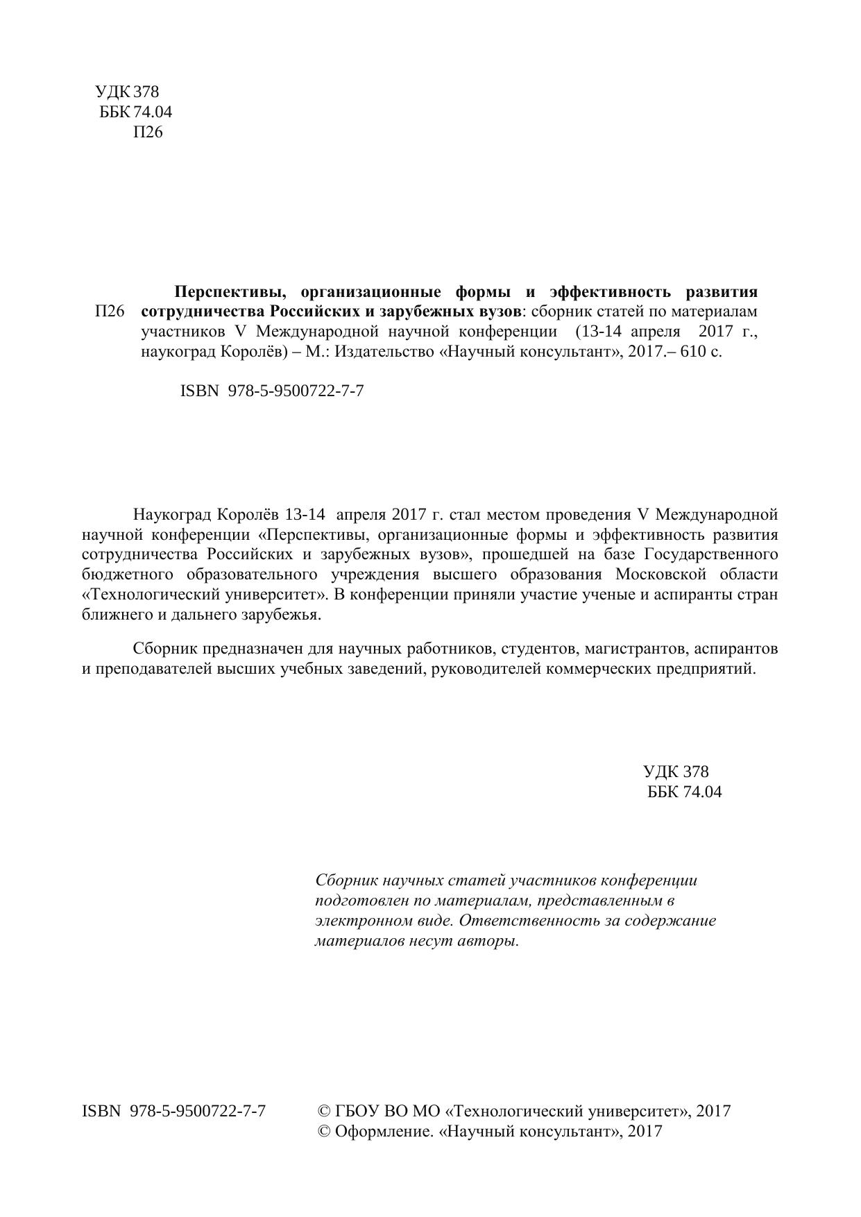 Наукоград Королёв 13-14 апреля 2017 г. стал местом проведения V Международной научной конференции «Перспективы, организационные формы и эффективность развития сотрудничества Российских и зарубежных вузов», прошедшей на базе Государственного бюджетного образовательного учреждения высшего образования Московской области «Технологический университет». В конференции приняли участие ученые и аспиранты стран ближнего и дальнего зарубежья. Сборник предназначен для научных работников, студентов, магистрантов, аспирантов и преподавателей высших учебных заведений, руководителей коммерческих предприятий.