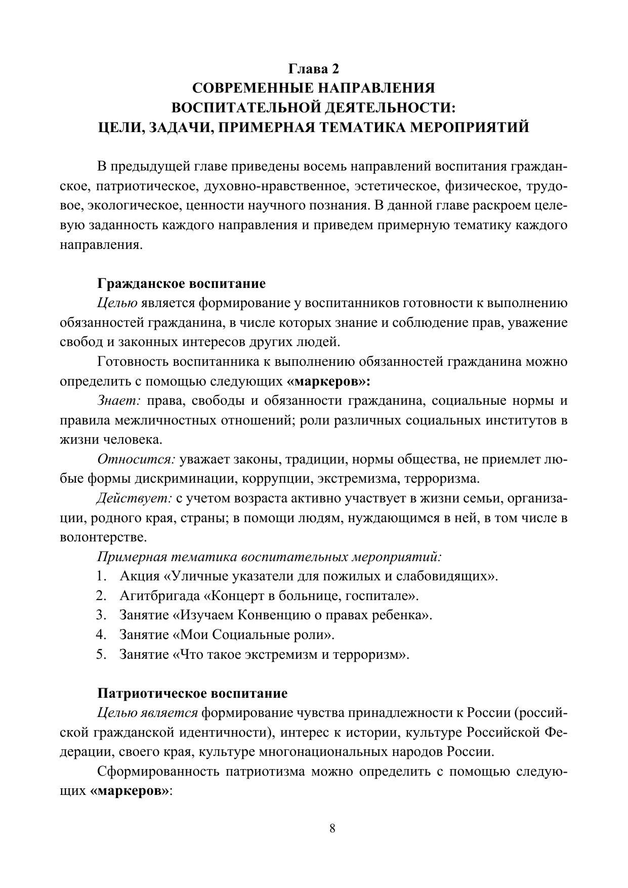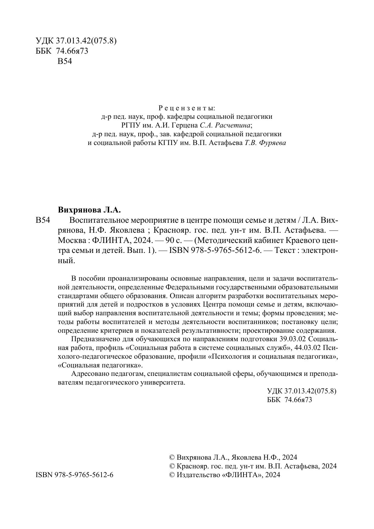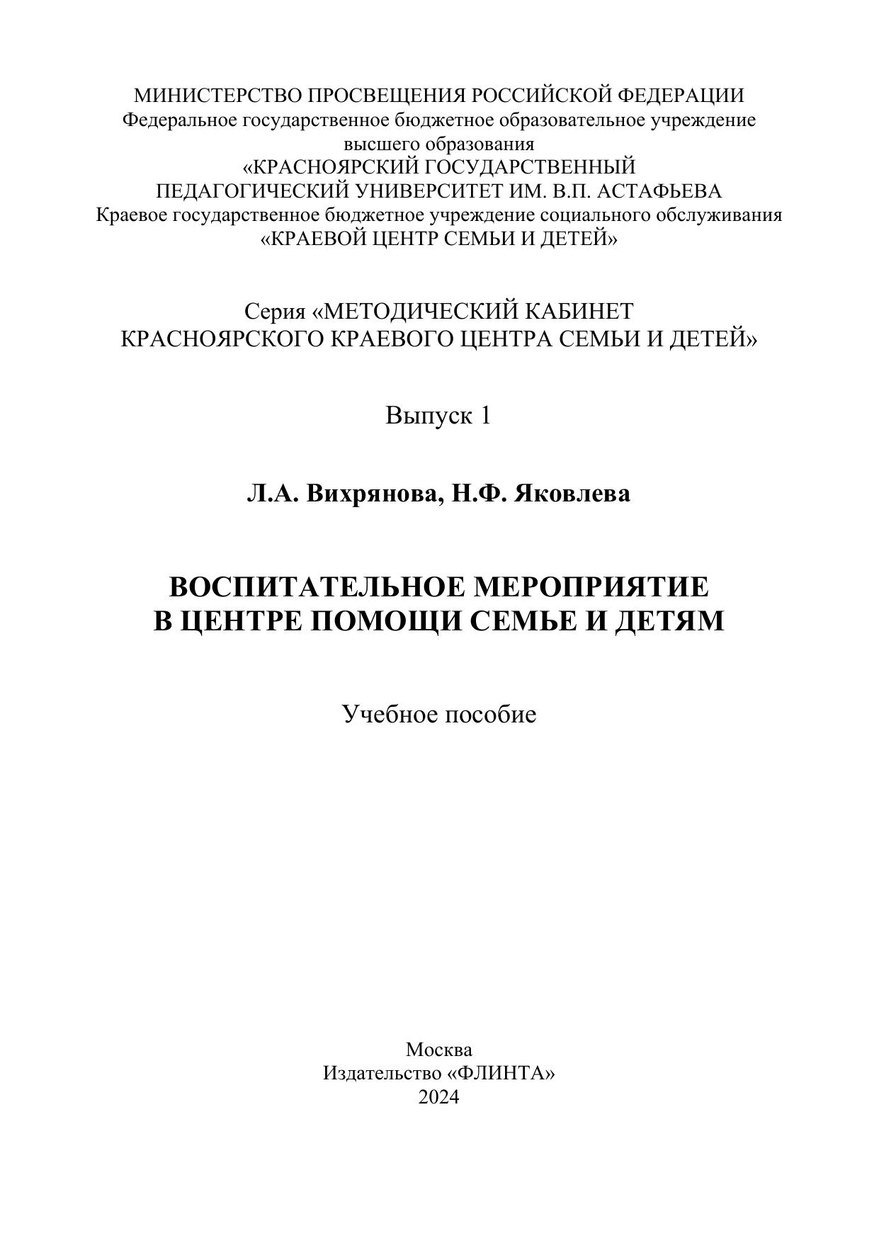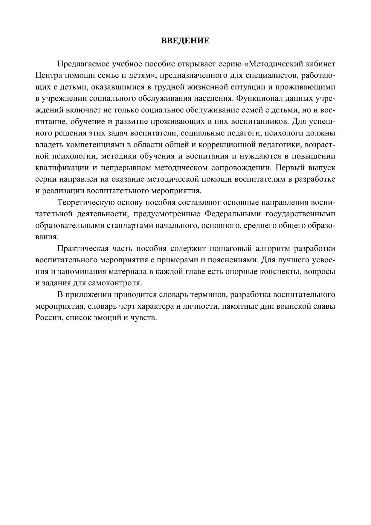 В пособии проанализированы основные направления, цели и задачи воспитательной деятельности, определенные Федеральными государственными образовательными стандартами общего образования. Описан алгоритм разработки воспитательных мероприятий для детей и подростков в условиях Центра помощи семье и детям, включающий выбор направления воспитательной деятельности и темы; формы проведения; методы работы воспитателей и методы деятельности воспитанников; постановку цели; определение критериев и показателей результативности; проектирование содержания. Предназначено для обучающихся по направлениям подготовки 39.03.02 Социальная работа, профиль «Социальная работа в системе социальных служб», 44.03.02 Психолого-педагогическое образование, профили «Психология и социальная педагогика», «Социальная педагогика». Адресовано педагогам, специалистам социальной сферы, обучающимся и преподавателям педагогического университета.