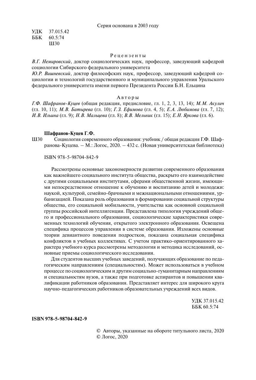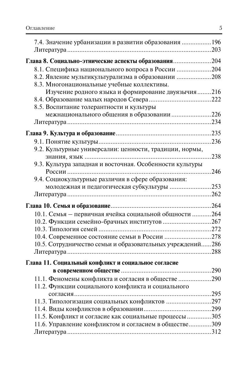 Рассмотрены основные закономерности развития современного образования как важнейшего социального института общества, раскрыто его взаимодействие с другими социальными институтами, сферами общественной жизни, имеющими непосредственное отношение к обучению и воспитанию детей и молодежи: наукой, культурой, семейно-брачными и межнациональными отношениями, урбанизацией. Показана роль образования в формировании социальной структуры общества, его социальной мобильности, учительства как основной социальной группы российской интеллигенции. Представлена типология учреждений общего и профессионального образования, социологические характеристики современных технологий обучения, открытого электронного образования. Освещена специфика процессов управления в системе образования. Изложены основные теории девиантного поведения подростков, показана социальная специфика конфликтов в учебных коллективах. С учетом практико-ориентированного характера учебного курса рассмотрены методология и методика исследований, основные приемы социологического исследования. Для студентов высших учебных заведений, получающих образование по педагогическим направлениям (специальностям). Может использоваться в учебном процессе по социологическим и другим социально-гуманитарным направлениям и специальностям вузов, а также при подготовке аспирантов и повышении квалификации работников образования. Представляет интерес для широкого круга научно-педагогических работников образовательных учреждений всех видов.