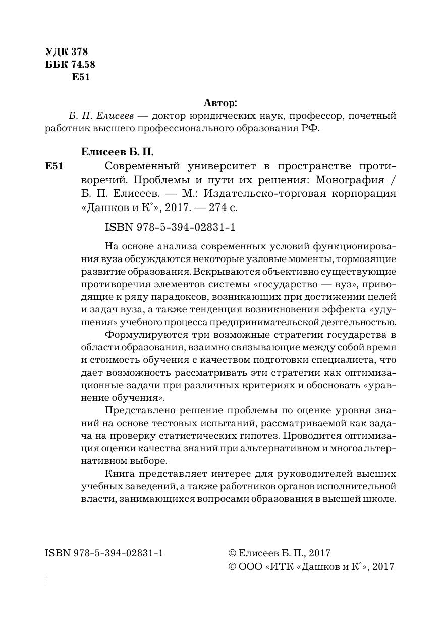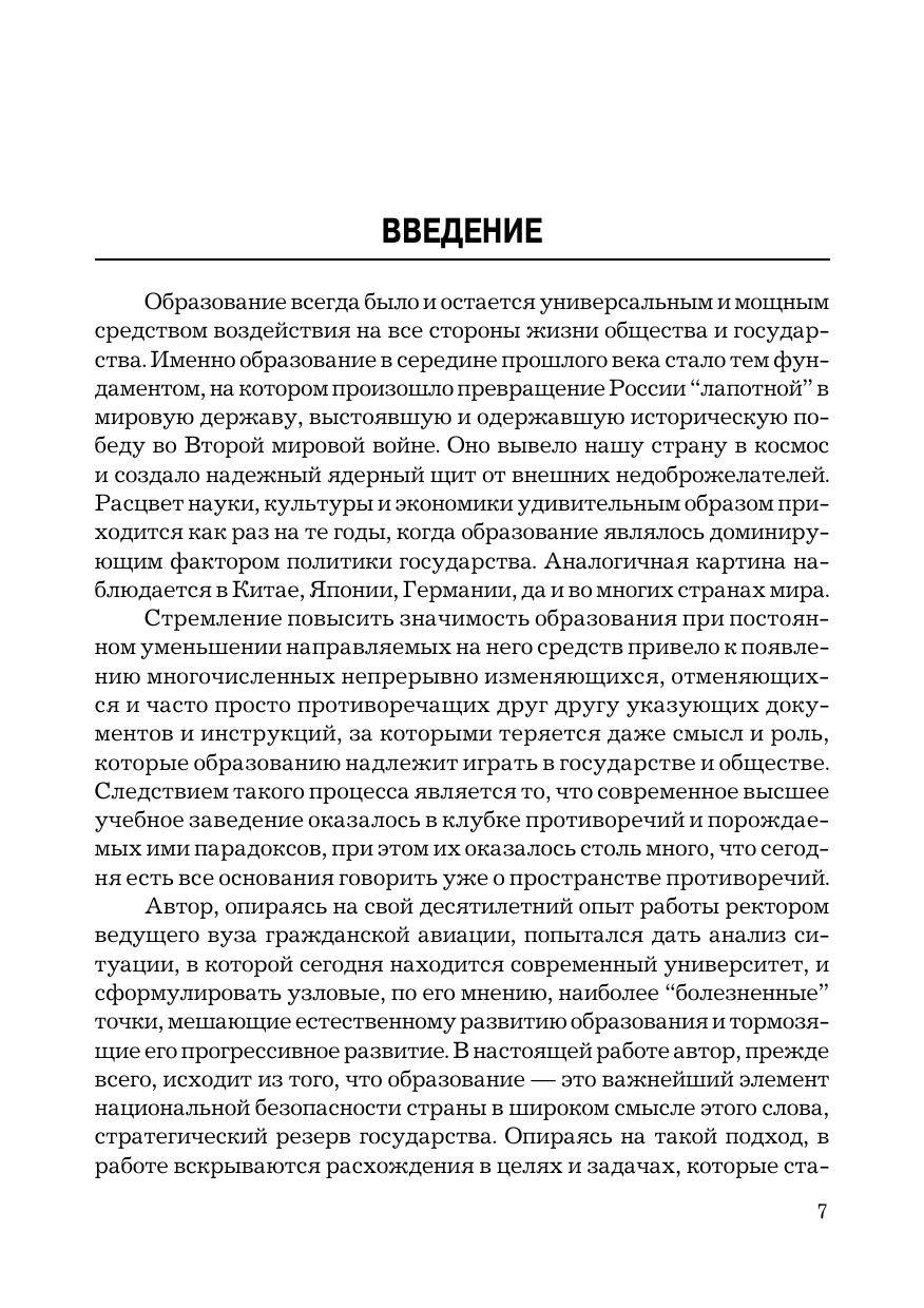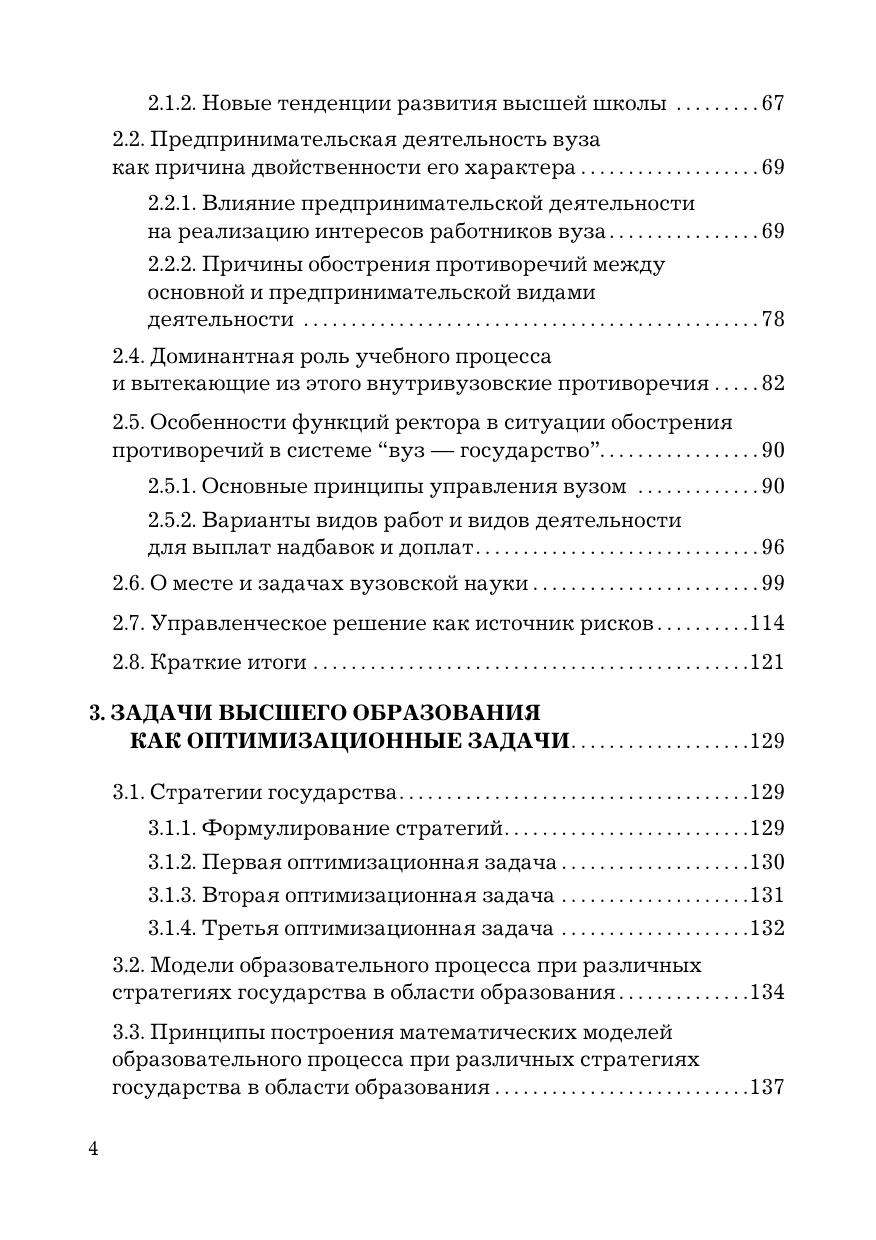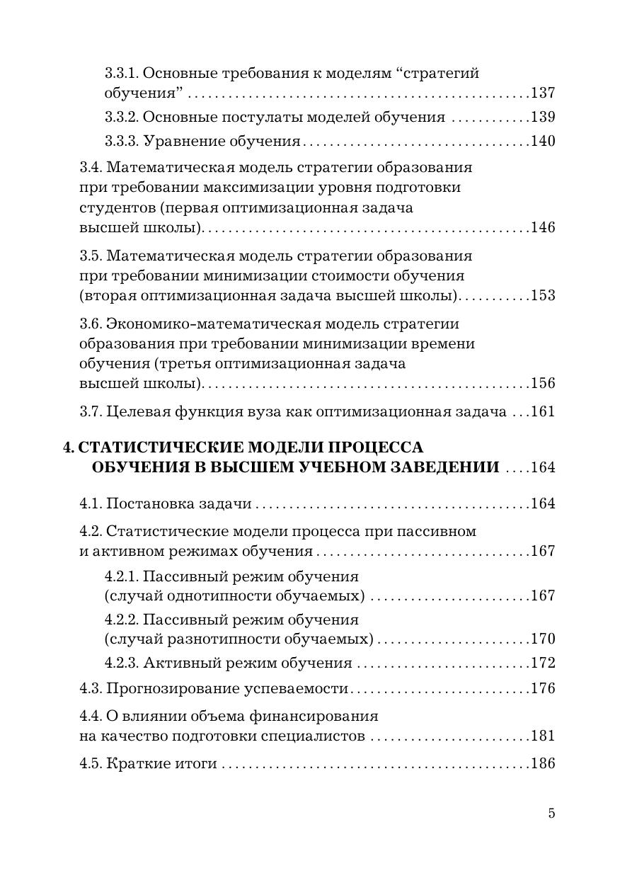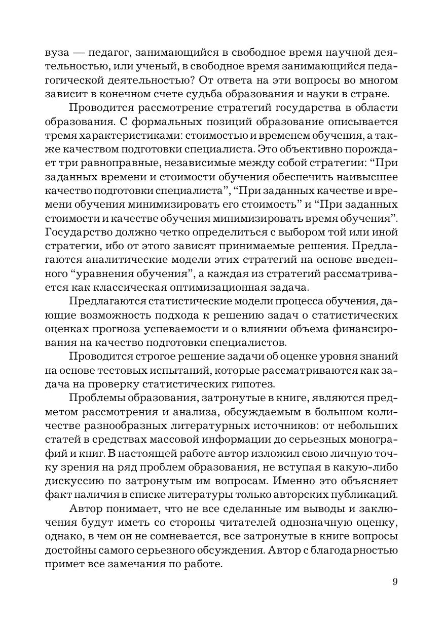На основе анализа современных условий функционирования вуза обсуждаются некоторые узловые моменты, тормозящие развитие образования. Вскрываются объективно существующие противоречия элементов системы «государство — вуз», приводящие к ряду парадоксов, возникающих при достижении целей и задач вуза, а также тенденция возникновения эффекта «удушения» учебного процесса предпринимательской деятельностью. Формулируются три возможные стратегии государства в области образования, взаимно связывающие между собой время и стоимость обучения с качеством подготовки специалиста, что дает возможность рассматривать эти стратегии как оптимизационные задачи при различных критериях и обосновать «уравнение обучения». Представлено решение проблемы по оценке уровня знаний на основе тестовых испытаний, рассматриваемой как задача на проверку статистических гипотез. Проводится оптимизация оценки качества знаний при альтернативном и многоальтернативном выборе. Книга представляет интерес для руководителей высших учебных заведений, а также работников органов исполнительной власти, занимающихся вопросами образования в высшей школе.