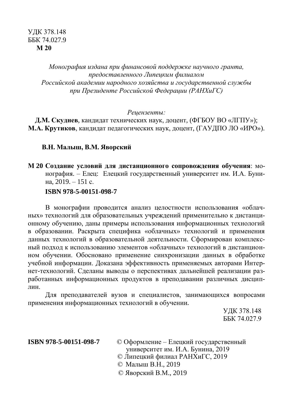 В монографии проводится анализ целостности использования «облач-ных» технологий для образовательных учреждений применительно к дистанци-онному обучению, даны примеры использования информационных технологий в образовании. Раскрыта специфика «облачных» технологий и применения данных технологий в образовательной деятельности. Сформирован комплекс-ный подход к использованию элементов «облачных» технологий в дистанцион-ном обучении. Обосновано применение синхронизации данных в обработке учебной информации. Доказана эффективность применяемых авторами Интер-нет-технологий. Сделаны выводы о перспективах дальнейшей реализации раз-работанных информационных продуктов в преподавании различных дисцип-лин. Для преподавателей вузов и специалистов, занимающихся вопросами применения информационных технологий в обучении.